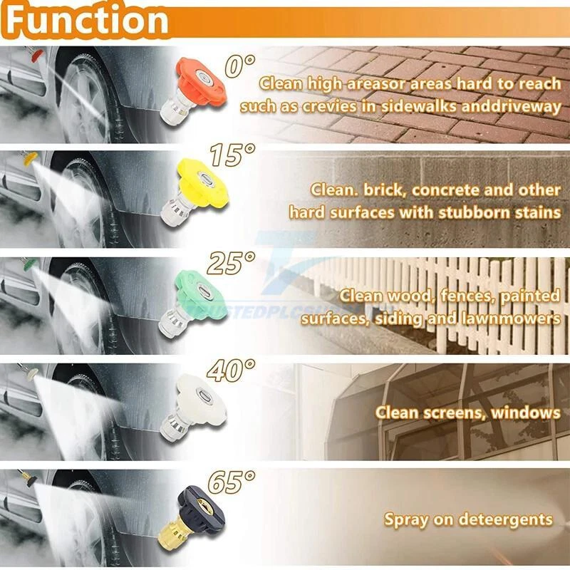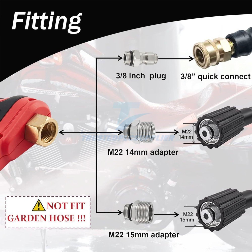 Product Description High Pressure 4000PSI Car Power Washer Gun Spray Wand Lance Nozzle and Hose Kit Description: 【Ergonomic Design】 Handle designed more comfortable and better grip. 【Three Length】 36Inch,22Inch and 10Inch.Assemble long or short Pressure Washer guns according to your needs. 1/4 inch quick connection design,fits most pressure washers.Such as nozzles tips,foam cannon,pivoting coupler,undercarriage cleaner,water broom,surface cleaner and so on. 【5 Nozzle Tips】 Different spray angles,Designed for cleaning different types ofsurfaces(0,15,25,40 degree,soap nozzle). For a wide range of uses,such as washing car,watering flowers,cleaning sidewalk,Bathe pets,etc. 【Perfect Gift&Service】 Pressure Washer Gun and all accessories are of high quality.Itis an excellent gift for wives,mothers,family, and friends. JUNGLEFLASH is professional in pressure washer accessories and always stands behind our products,please free to contact us if any questions. Pressure Washer Gun List: 4000Psi high pressure washer gun handle X1, Power Washer Wand×2, M22-15mm Fitting X1,(compatible with Sun Joe,AR Blue,Stanley,Campbell,MI-T-M,Cleanforce,Excell,Simoniz power washer.) M22-14mm Fitting X1,(compatible with Generac,Simpson,Briggs Stratton,craftsman,karcher,Ryobi pressure washer.) G3/8"Fitting×1, 1/4"Quick Connerctorx1, Pressure Washer Nozzles X5, WARM TIPS: 1.Not Fit Garden Hose or Water Hose or Your Faucet Directly!!Power washer gun is designed for gas and electric pressure washer. 2.Pressure washer guns have M22 fitting,compatible with M22 14mm and M22 15mm fitting.The pressure washer spray gun's Max pressure is up to 4000 PSI.The Max flow rate is 6.6 GPM.The Max temperature of the water is 60C/140F. About Us Payment Shipping Returns Contact Us 1. Unless specified otherwise, all our products are IN STOCK and are shipped from USA Local warehouse - Not Overseas! 2. We provide a 30 day Satisfaction Guarantee or your money back (provided items are in the same new and resaleable condition.) 3. We have a PayPal Verified Business Account, please buy with Confidence! 4. Every item will be tesrted before send.We know our products well and if we don't have the answers we will do our best to find them for you! 5. Our friendly team look forward to serving you! Your satisfaction is our No.1 Priority We will do our best to satisfacy you. 1.Paypal, Credit Card, G Pay etc, many payment way is accepted. 2.Please be sure your shipping address is correct before make a payment. 1.We will ship out the item within 1-3 business days after comfirming the payment, appreciate your patience. 2.If the items are broken on the way(we will check the orders clearly before we sent them),please contact us in 3 days you received it. We will send you a new one or refund your payment. 1.We stand behind every buyer.Items can be returned for exchange or refund within 30 days. 2.Please contact us when you have any confusion of our item, we will solve the trouble for you as soon as possible. 1.This is professional Seller.We will reply your message within 24 hours. 2.Please contact us whenever you have any question about the item. We will deal with it as soon as possible. 3. If you are unhappy with the item or our service,please Contact Us before leave feedback,just give me a chance,thank you! About Us 1. Unless specified otherwise, all our products are IN STOCK and are shipped from USA Local warehouse - Not Overseas! 2. We provide a 30 day Satisfaction Guarantee or your money back (provided items are in the same new and resaleable condition.) 3. We have a PayPal Verified Business Account, please buy with Confidence! 4. Every item will be tesrted before send.We know our products well and if we don't have the answers we will do our best to find them for you! 5. Our friendly team look forward to serving you! Your satisfaction is our No.1 Priority We will do our best to satisfacy you. Payment 1.Paypal, Credit Card, G Pay etc, many payment way is accepted. 2.Please be sure your shipping address is correct before make a payment. Shipping 1.We will ship out the item within 1-3 business days after comfirming the payment, appreciate your patience. 2.If the items are broken on the way(we will check the orders clearly before we sent them),please contact us in 3 days you received it. We will send you a new one or refund your payment. Returns 1.We stand behind every buyer.Items can be returned for exchange or refund within 30 days. 2.Please contact us when you have any confusion of our item, we will solve the trouble for you as soon as possible. Contact Us 1.This is professional Seller.We will reply your message within 24 hours. 2.Please contact us whenever you have any question about the item. We will deal with it as soon as possible. 3. If you are unhappy with the item or our service,please Contact Us before leave feedback,just give me a chance,thank you! You may also like 65W USB C Type C for Acer Chromebook Lenovo/HP/Asus/Samsung Power Laptop Charger 8.99 USD Free shipping 9PC ABS Socket Organizer 1/2 3/8 1/4 inch Drive Socket Rail Holders Wall Mount 17.57 USD 18.49 USD Free shipping 5% off Titanium Cutting Board Double-Sided Titanium Cutting Boards for Kitchen Camping 17.99 USD 22.59 USD Free shipping 20% off 5Pcs HSS Cobalt Hole Large Metal Step Drill Bit Set Titanium Cutter Cone 50 Size 9.99 USD 11.49 USD Free shipping 13% off 8"x12" Vacuum Sealer Bags Embossed Food Saver Magic Seal Storage 100-500pcs 14.89 USD Free shipping 3 Head 50000LM LED Solar Lights Outdoor Waterproof Motion Sensor Security Lamp 13.99 USD Free shipping powered by