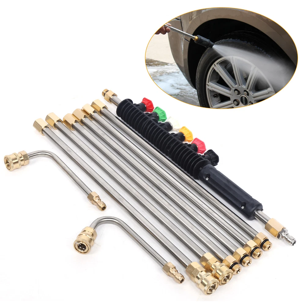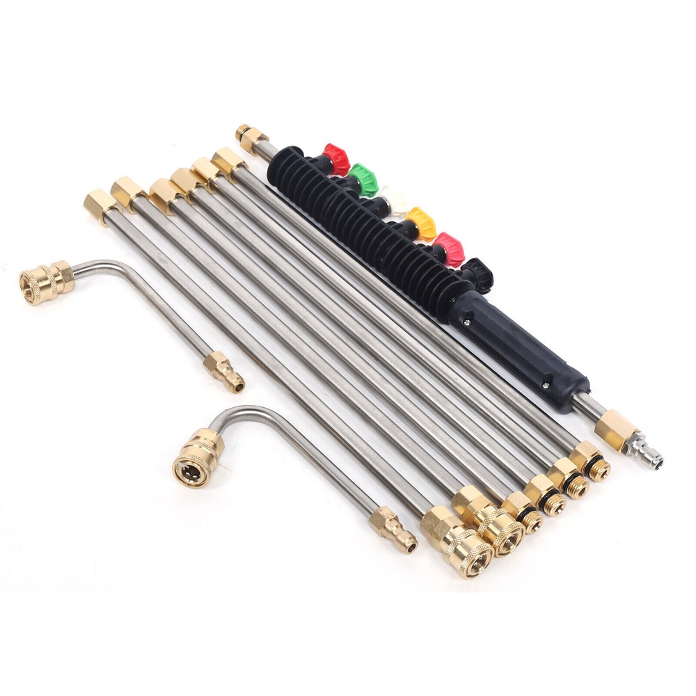 Have a nice day~ High Pressure Car Power Washer Spray Gun Wand Extension Lance Nozzle Tips 8pcs Features: 1. the Cleaning Tool Are Made of Brass and Stainless Steel. Working Pressure Is up to 4000 Psi. Working Temperature Is up to 140 ℉ . 2. the Cleaning Tool Consists of 6 Straight Rods, One 90° Curved Rod and One 120° Curved Rod Which Is S afe and Efficient. It Also C an Get Areas Which Is Hard to Reach, Great for Cleaning. 3. You Can Adjust the Total Length of Wand Freely According to Your Needs. Specifications: Spray Wand Material: Stainless Steel Tip Material: Copper Color: Gold&Silver Connector:1/4" Male Thread /1/4" Female Thread Quantity: 8 pcs O-ring Size: Outside Diameter Is 14mm, Inside Diameter Is 9 .2 mm. Quantity: 10pcs 6 xnozzles Material: Brass,Stainless Steel, Rubber Nozzles: 0° Red,15° Yellow,25° Green,40° White,60° Black , Soap Pink 6 Sp ra y Nozzle Tips: Red - 0 Degrees - Areas That Are High and Hard to Reach Such As Sidewalks and Driveways. Yellow - 15 Degrees - Use on Concrete, Brick and Other Hard Surfaces with Stubborn Stains. Green - 25 Degrees - Use on Painted Surfaces, Wood Siding, Fences and Lawn Mowers. White - 40 Degrees - Use on Windows and Screens. Black - 65 Degrees - Use to Spray Soaps and Detergents. Pink - Soap - Jet Stream Tips,Soap Mode Application ² Ideal for Nozzle, Undercarriage Cleaner, Water Broom, Surface Cleaner and Cleaning Brushes. ² Also Can Be Used to Clean Areas Such As Siding, Shutters, Windows and More. Package Included: 6 X Straight Rod s 1 x 90° Curved Rod 1 x 120° Curved Rod 1 x Cover 10 X O-ring s 6 X Nozzles Payment Delivery details Terms of sales About us Contact us Payment We accept ebay payment 。 Fees such as import duties, taxes are not included in the item price or shipping costs. These charges are the buyer's responsibility. Delivery details Shipping: 2-9 working days to: USA Terms of sales We maintain high standards of excellence and strive for hundred percent customer satisfaction. Feedback is very important to us. We hope that you contact us immediately before you give neutral or negative feedback, so that we can address your concerns. It is impossible to address issues if we do not know about them! About us Your satis faction is our ultimate goal. We work hard to earn your trust and future business. Our certified technicians have tested each item before shipping. The unit comes with 1 year limited warranty on all manufacturing defects. a) If you receive a defective item, you may return it or ask for a discount. Please contact us within 14 days after you receive the package. b) What you returned must be intact and in its original packaging as re? u. Customer is responsible for shipping costs of the returned item. c) We will cover the cost of shipping back t with the shipping rate indicated in the registration page. We will send you a new unit or refund the full payment you paid. Thank you. Contact us Business Hour Business Hour: Monday To Friday: 8:30 AM to 5:00 PM (Beijing China time) Due to time zones, our reply to your questions may not be immediately. But within above working time, we will reply your email within 24 hours. If it's non-workdays, please kindly be patient and wait till Monday. Please contact us with ebay message. Please feel free to contact us if you have any questions. Monday To Friday: 8:30 AM to 5:00 PM (Beijing China time) Due to time zones, our reply to your questions may not be immediately. But within above working time, we will reply your email within 24 hours. If it's non-workdays, please kindly be patient and wait till Monday. Please contact us with ebay message. Please feel free to contact us if you have any questions.