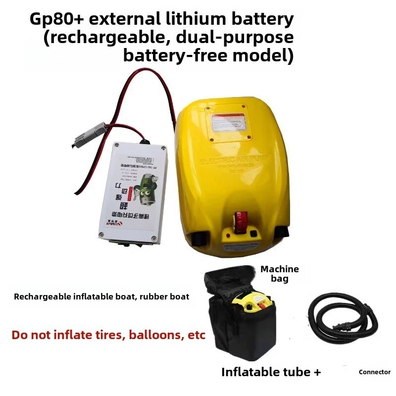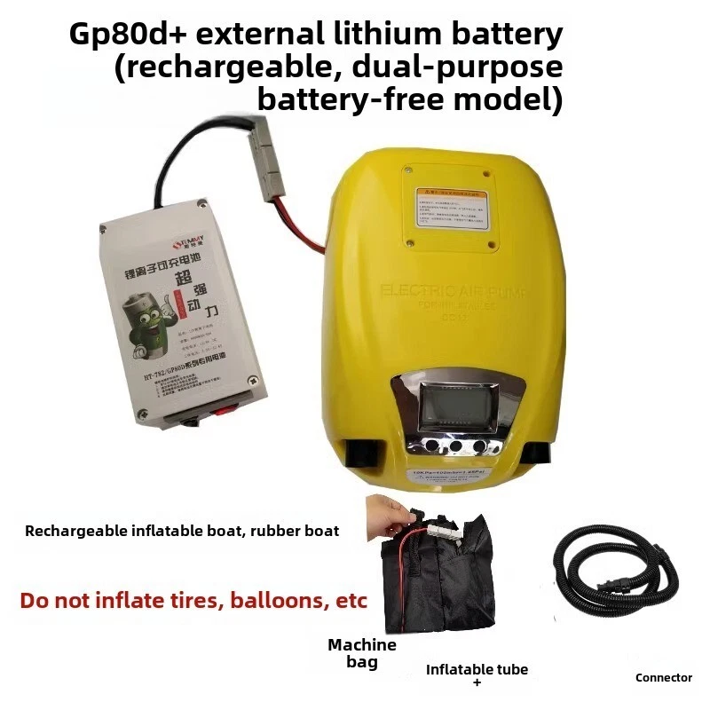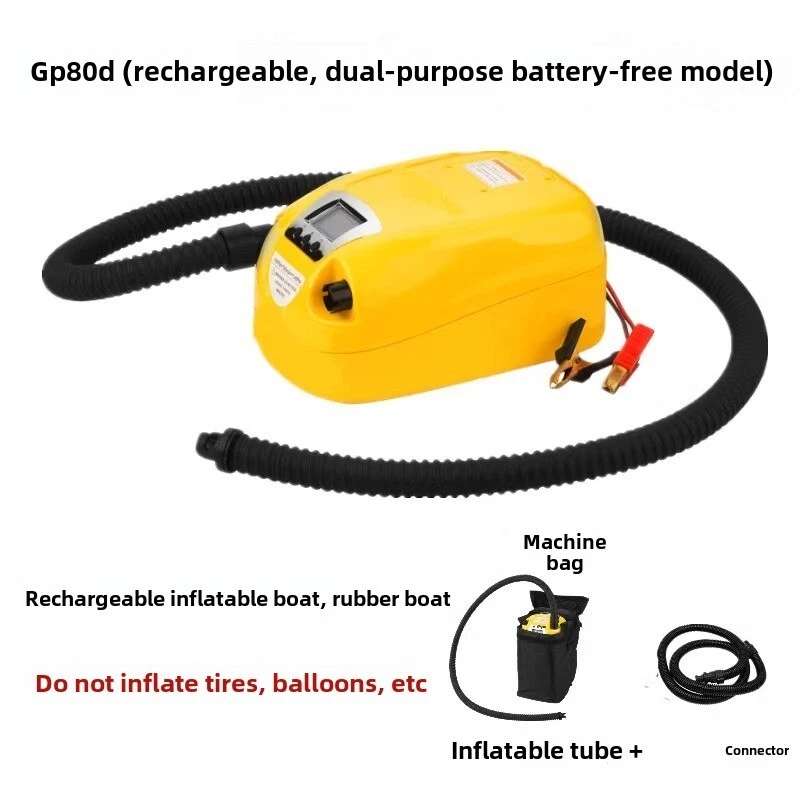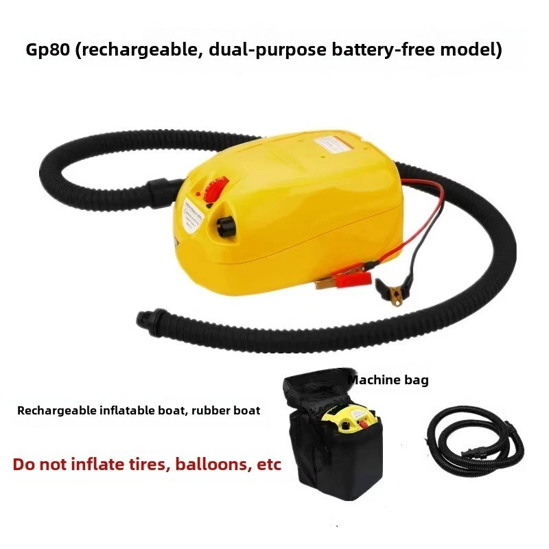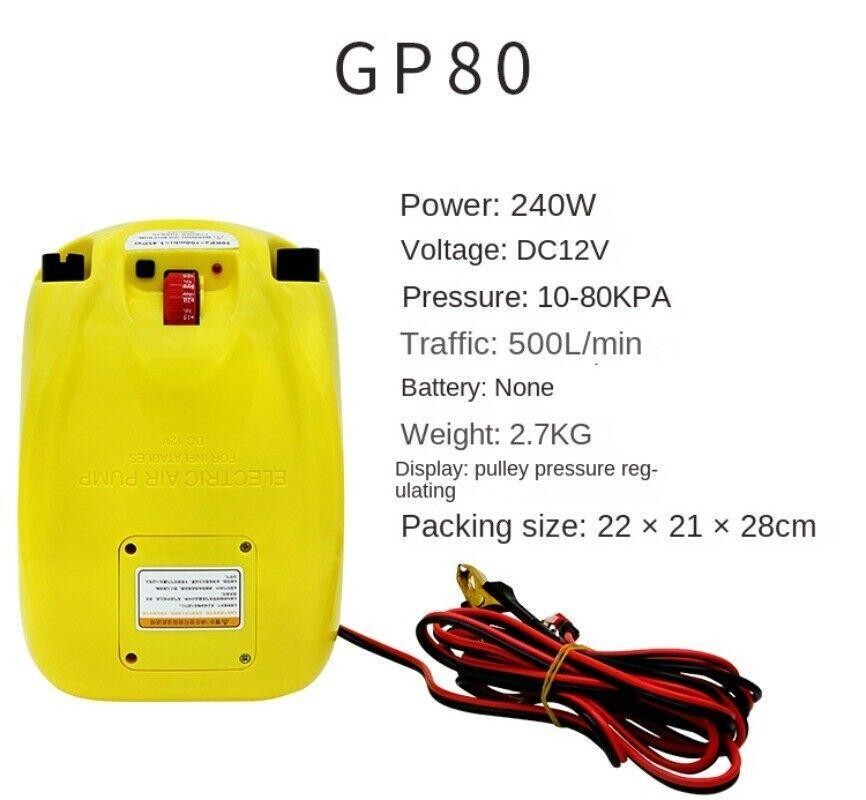 Inflatable Boat Electric Inflatable Pump High Pressure Inflatable Pump Power:240W. Voltage:DC12V. Pressure:10-80K PA. Flow rate:500L/min. Battery:No Mode:Automatic switching between high and low pressure, automatic shutdown. Weight:2.7KG. Pressure regulator: dial wheel regulator. Cable length:2.8 metres. Package:22*21*28CM
