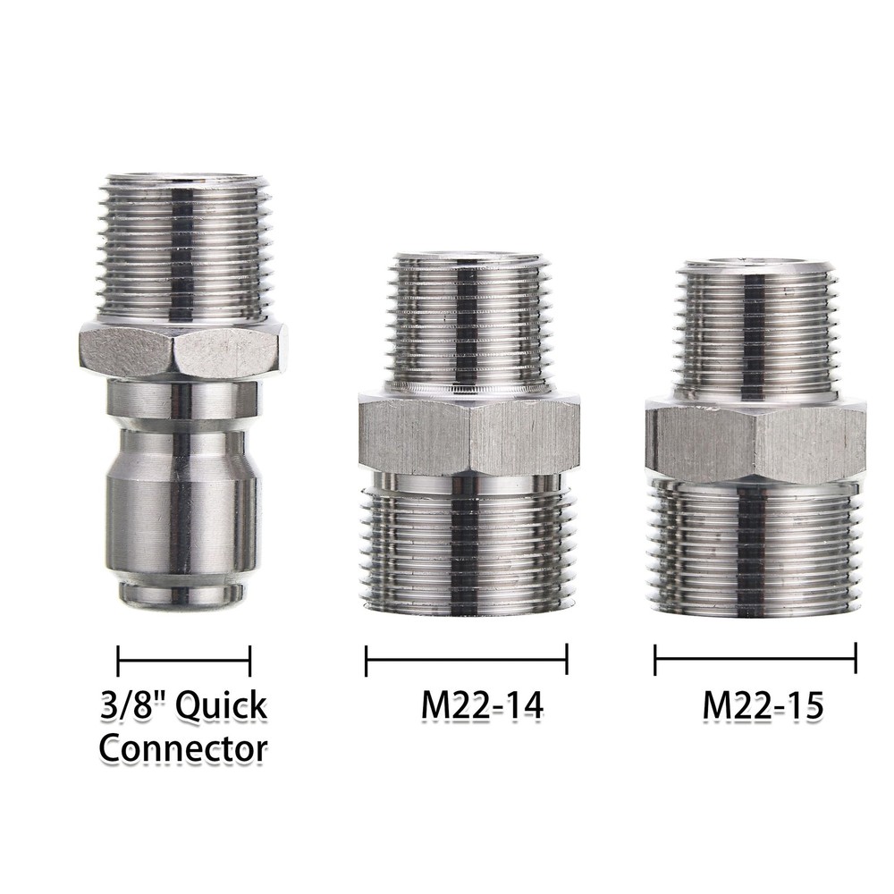 Power washer short gun kit include one piece pressure washer short gun, one piece 3/8 quick connector, one piece 1/4" NPT quick disconnect socket, one piece M22-14 mm fitting and one piece M22-15 mm fitting. Short pressure washer gun has a locking handle, offering you safe and convenience when you’re using it; The tail of the pressure washer gun swivel adopts a unique design of 360° free rotation, which helps avoids kinking your pressure washer hose. Max temperature for water is up to 160 ℃ ( 320 °F ). Power washer handle gun’s body’s made of engineering plastic, the internal structure of the gun body’s stainless steel with high quality, offer firm&high wear resistance. 1/4’’ quick connector fits most turbo nozzle, surface cleaner, water broom, undercarriage cleaner, pivoting coupler, foam cannon, pressure washer sandblasting kit, gutter cleaner attachment and so on; it's good part for pressure washer equipment. Power washer short gun kit include one piece pressure washer short gun with 1/4’’ quick disconnect socket, one piece 3/8'' quick connector, one piece M22-14 mm fitting and one piece M22-15 mm fitting Short pressure washer gun has a locking handle, offering you safe and convenience when you’re using it; The tail of the pressure washer gun swivel adopts a unique design of 360° free rotation, which helps avoids kinking your pressure washer hose. Max temperature for water is up to 160 ℃ ( 320 °F ) Power washer handle gun’s body’s made of engineering plastic, the internal structure of the gun body’s stainless steel with high quality, offer firm and high wear resistance 1/4’’ quick connector fits most turbo nozzle, surface cleaner, water broom, undercarriage cleaner, pivoting coupler, foam cannon, pressure washer sandblasting kit, gutter cleaner attachment and so on Short power washer gun also is a good part. Fit most of pressure washer hose, pressure washer extension wand and surface cleaner