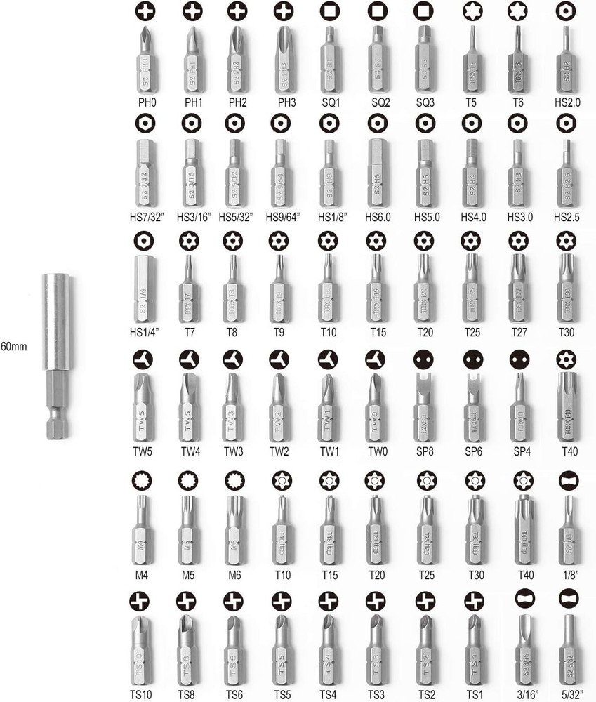 High Qualiy Security Bit Set, 61-Piece, S2 Steel, Temper Proof Bits, for home electoronics, vehicles, military, aerospace applications Specification:(4)Phillips:0,1,2,3;(3)Square: 1,2,3; (3)Spanner: 4, 6, 8;(6)Temper Proof Metric Hex: ,,,,,; (6)Temper Proof SAE Hex: 1/4",3/16",7/32",1/8",9/64",5/32”;(2)Torx Star:T5,T6;(10)Temper Proof Torx Star: T7, T8, T9, T10, T15, T20, T25, T27, T30, T40 ;(3)Clutch: 1/8", 5/32",3/16"(3)Spline: M4, M5, M6;(6)Tri wing: 0,1,2,3,4,5; (8)TORQ SET: 1, 2, 3,4, 5, 6, 8,10; (6)Torx ttap: TTAP T10, TTAP T15, TTAP T20, TTAP T25, TTAP T30, TTAP T40; (1) H1/4” magnetic bit holder. High Grade Steel: Made from heavy duty, high grade S2steel, which will withstand extremely high torque output and provide maximum durability. Superior Fitment: Obtained 9 screwdriving system technology licenses for PHILLIPS SQUARE DRIVE, PHILLIP II Anti-Cam-Out, POZIDRIV, TORQ-SET, TRI-WING, MORTORQ Super, TORX, TORX Plus, ttap ensure each bit a precision-machined tip for ideal fit in screw head recesses. Durable Molded ABS Resin Case: All these bits are housed in a molded ABS resin case, with easily in/out storage and a full-length metal pin in the hinge for added durability and life. Reliable Customer Service: provides reliable, effective, efficient customer service, If you have any issues with your Tools, simply contact our 24 hours customer service for assistance. About : is specialized in R&D, manufacturing, sales of screwdriver bits, power tool accessories, hand tools, tool accessory sets . In setting the bar high to ensure quality products, successfully obtained 9 screwdriving system technology licenses for PHILLIPS SQUARE DRIVE, PHILLIP II Anti-Cam-Out, POZIDRIV, TORQ-SET, TRI-WING, MORTORQ Super, TORX, TORX Plus, ttap.