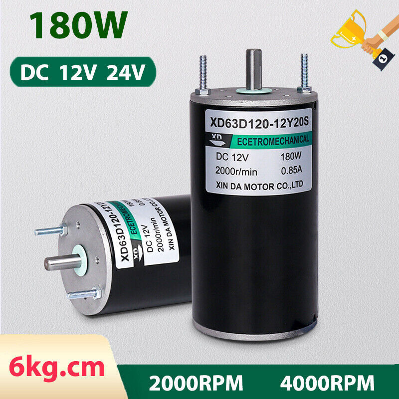180W High Speed Motor DC 12V 24V Permanent Magnet Reversible Motors 2000/4000RPM ●Product Properties : Motor Model : 63120 Power Supply : DC 12V 24V Speed : 2000RPM , 4000RPM Shaft Diameter : 8mm Shaft Length : 18mm Motor size : 116 x 63mm Motor Power : 180W Current : 0.5A , 0.6A ●Product Features : Pure copper motor, high temperature resistance, high conductivity, strong power and long life. Double ball bearings with hard mechanical characteristics, stability, good control, convenient no-rotation loss and high efficiency. High strength magnet, magnetic stability, high magnetic energy, high performance, high temperature resistance and other characteristics. ●Use : Cutting machine, bag cutter, lawn mower, electric drill, wire winder, cotton candy machine.