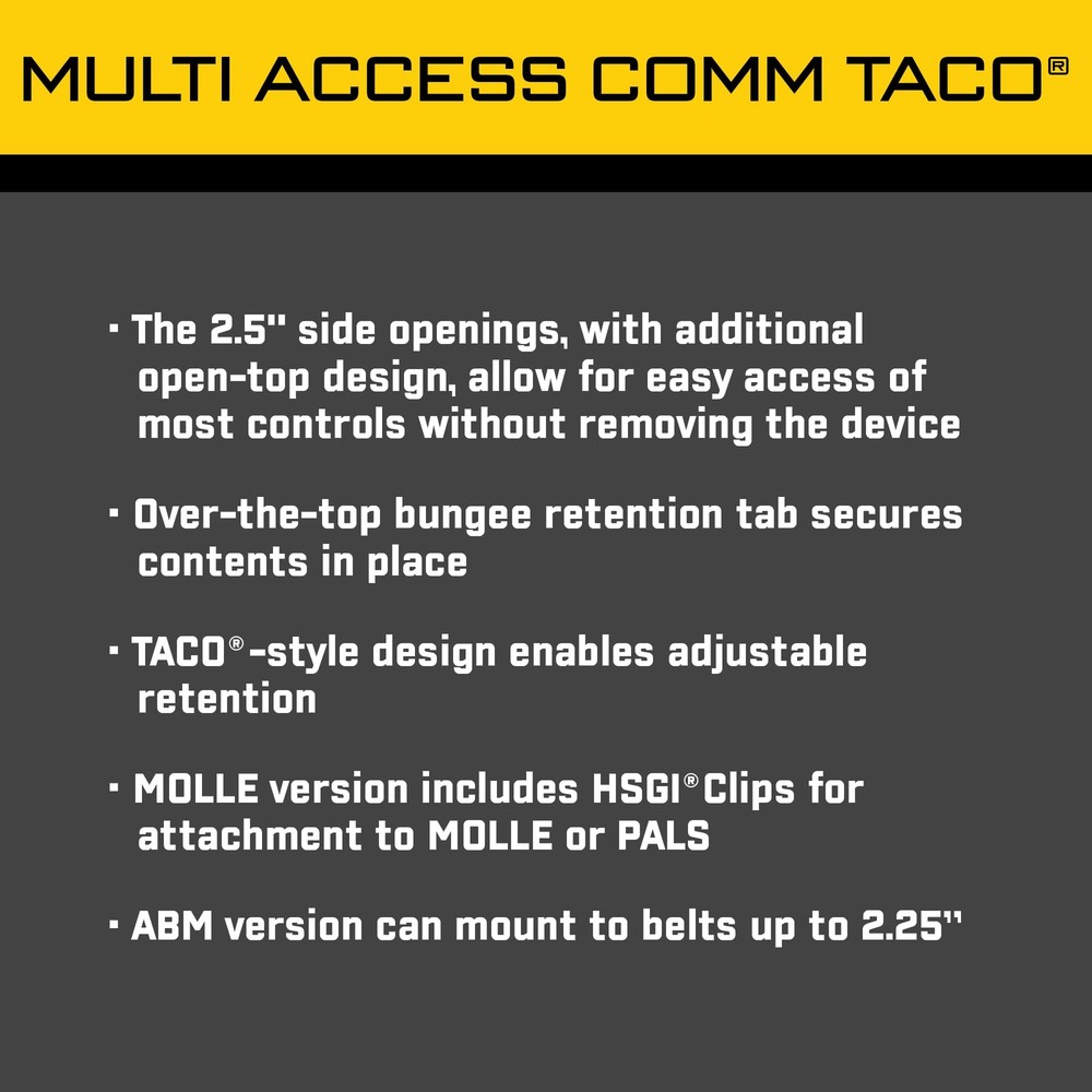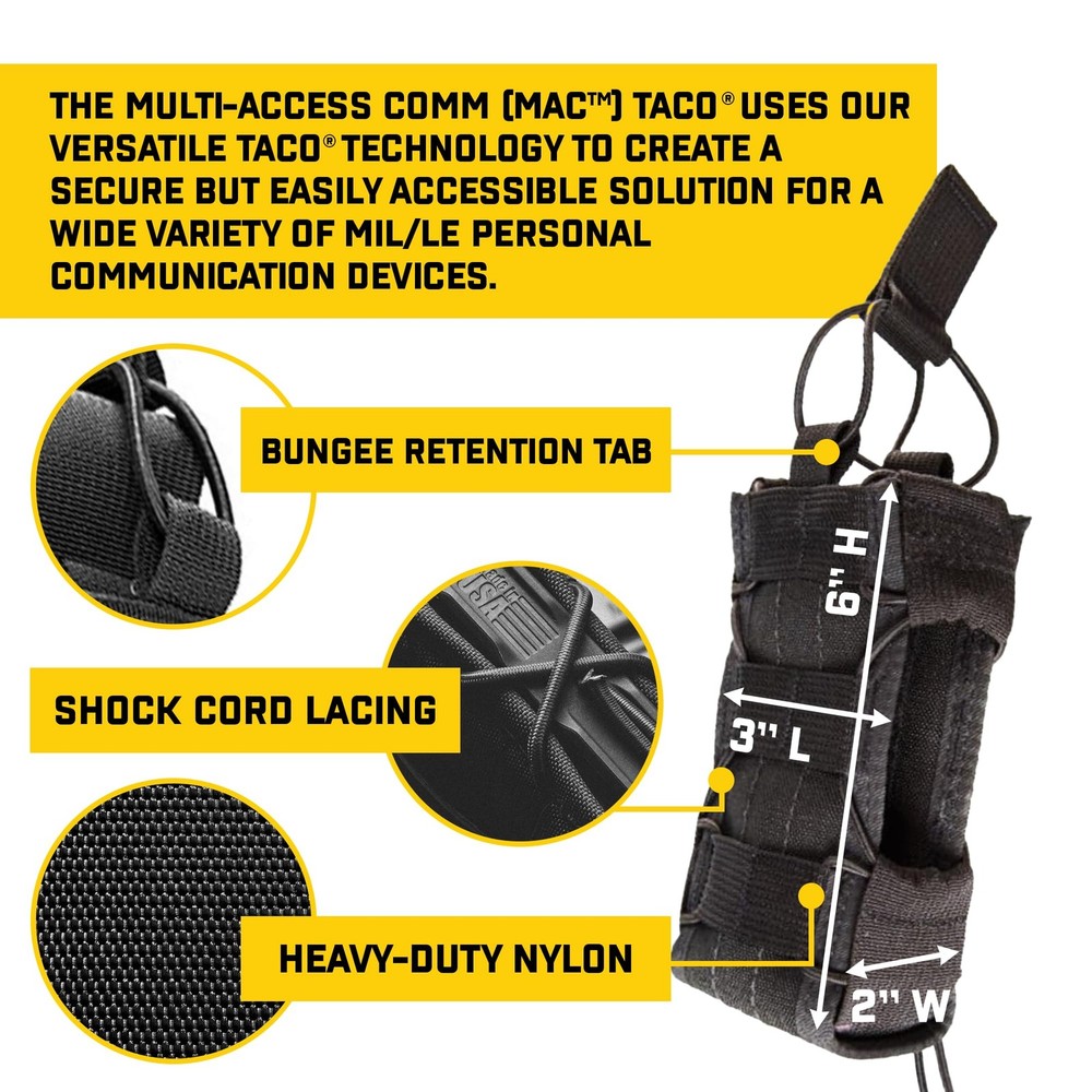 - Multi-Access Comm (MAC) Taco MOLLE Pouch, Police Gear & Military Gear, MOLLE Radio Pouch, Tactical Pouch for Professionals (Black) ADJUSTABLE RETENTION: This radio pouch uses shock cords to hold a wide variety of radios securely during movement, yet allows for quick & quiet access. 2.5" side openings allow you to reach most controls while the radio is still in the pouch. VERSATILE: This pouch measures 3"L x 2"W x 6"H, and weighs 0.27 lbs. Use any MAC item and benefit from an over-the-top shock cord retention tab. The high-quality, water-resistant nylon makes it durable to withstand tough conditions. MOLLE COMPATIBILITY: Attach this pouch effortlessly to your MOLLE belts, vests, and backpacks or PALS webbing with the included clips. MILITARY-GRADE, PROFESSIONAL QUALITY: Trusted by the Military and law enforcement, products feature unmatched materials, innovative technology, and industry leading design and construction. ONE-STOP SHOP: Enjoy the suite of products including belts, admin pouches, medical pouches, plate carriers, shoulder pads, and utility pouches. All products are built to last and come with a lifetime guarantee!