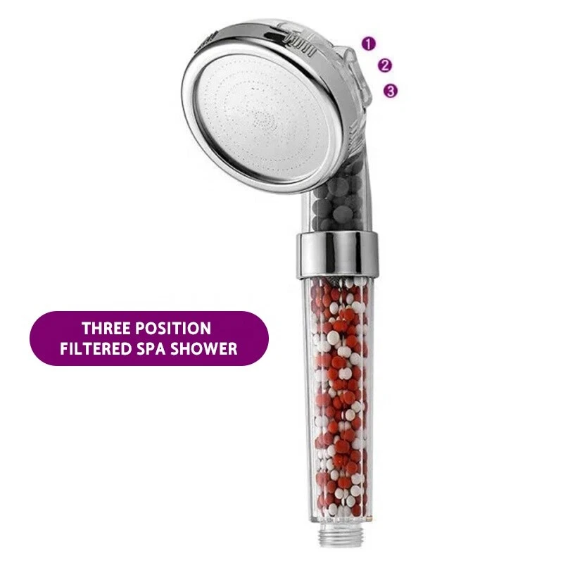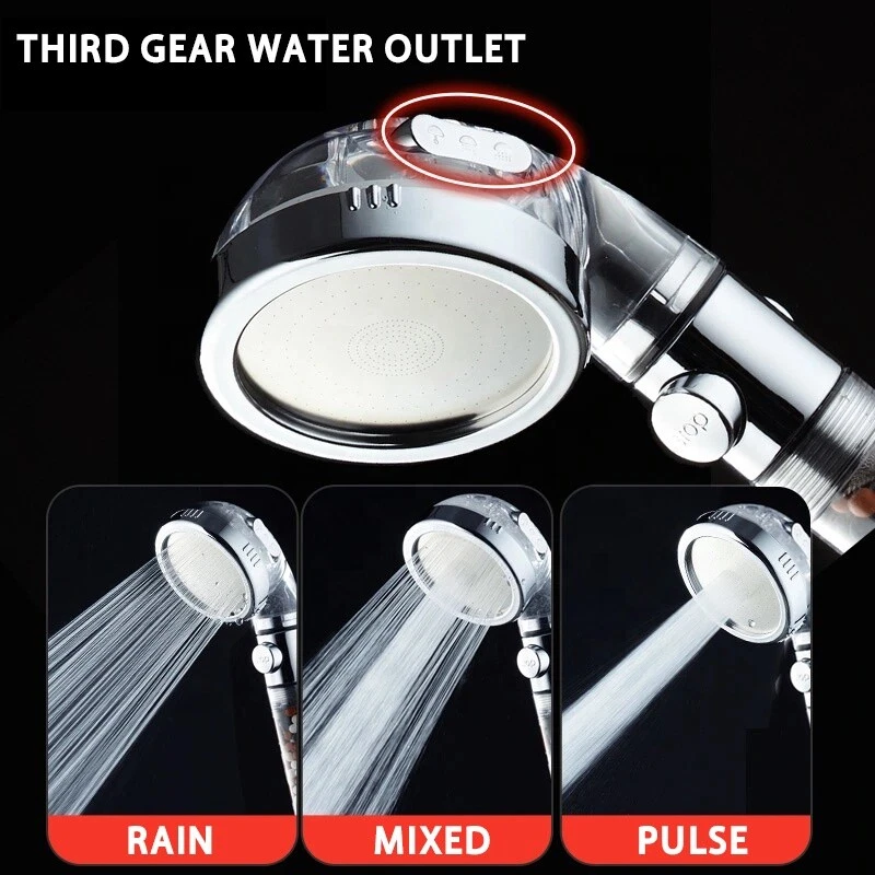 High Turbo Pressure Shower Head Bathroom Powerful Energy Water Saving Filter Features : Type: Ionic Filter Handheld Shower Head Material: PC, stainless steel and bio active mineral stones Size: Length:22cm, Shower Head Diameter:8cm Quantity:1 shower head 3 modes: Rainfall/ Massage/ Jetting Health benefits: The bio active mineral balls helps to purifies water, removes chlorine and releasing a large of negative ions while showering. Get smoother skin, reduce oil secretion, increase cell viability, improved cleaning effect and hair loss prevention. Lasers perforated tech Saving water and increase pressure. Easy installation G1/2 interface adjust all international standard family hose Tips: Because of high water pressure, water storage in the shower is a normal phenomenon. Water pressure is 3 times the normal shower, please affix firmly in the shower, so as not to spray to other places. Notice: Purchase only includes only shower head. Hose is not included