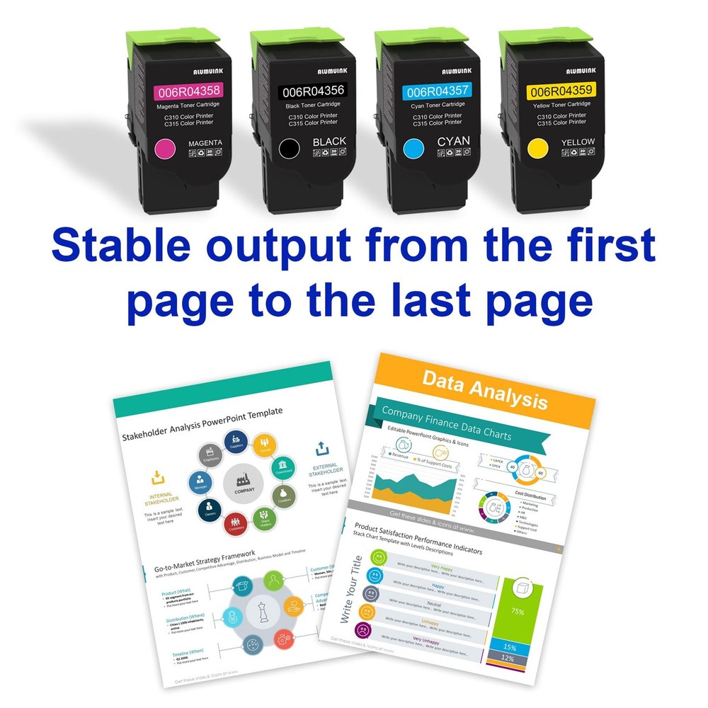 Package Contents: 4-Pack C315 C310 Toner Cartridge (006R04356 Black, 006R04357 Cyan, 006R04358 Magenta, 006R04359 Yellow). Compatible for Printer Models: C310 Printer C315 Printer C310DNI Printer C315DNI Printer High quality standards: high density black and clear text and images. Natural and realistic colors to provide clear printing results to meet your needs. High quality printing: Our high quality photoconductor toner provides a clear and smooth printout. Stable printing quality keeps you away from lines, spots and leaks. Superior Quality: Each of the Toner Cartridges has been ensured full working condition and a superior print quality. Improve efficiency: Improved technology and toner can meet your printing needs in a short time. Applicable scenarios: convenient and cost-effective daily use, such as schools, offices, banks, hospitals and families. Reliable Choice: Follow strict production standards while pursuing a healthier printing experience from advanced materials. Better Print Quality: Strictest quality control to ensure that every customer enjoys stable print quality. Safe Packaging: Separate vacuum sealed package. Professional solid box with double protection. Avoid damage during transportation. Warm tip: Please confirm your printer model before placing an order. After sales service: If you have any questions, please feel free to contact us. We will provide you with the best solution. Package Contents: 4 Pack C310 C315 Toner Cartridges - 006R04356 006R04357 006R04358 006R04359 Toner. Compatible for Printers: C310 C315 C310DNI C315DNI Printers. Page Yield: Up to 3,200 pages per black cartridge and 2,200 Pages per color cartridge, at 5% coverage on A4 paper. Superior quality:Professional Quality Management System strive to ensure excellent quality, keeps your print away from lines, spots and leakage. After sales service: We have established a professional, trustworthy and friendly team.If the Toner Cartridge are defective,We guarantee free returns within 2 years.