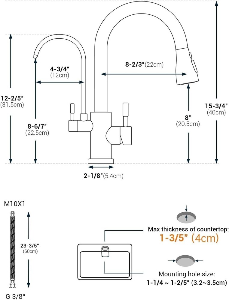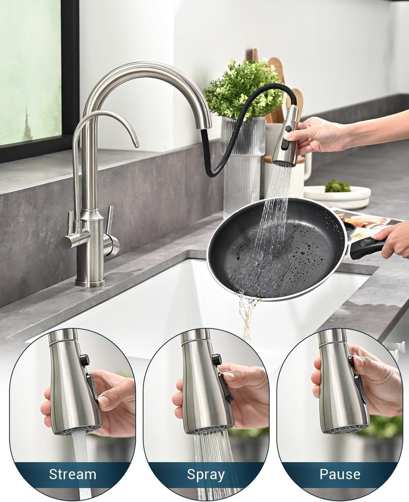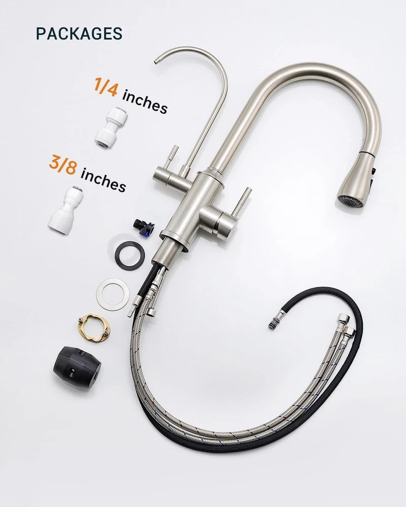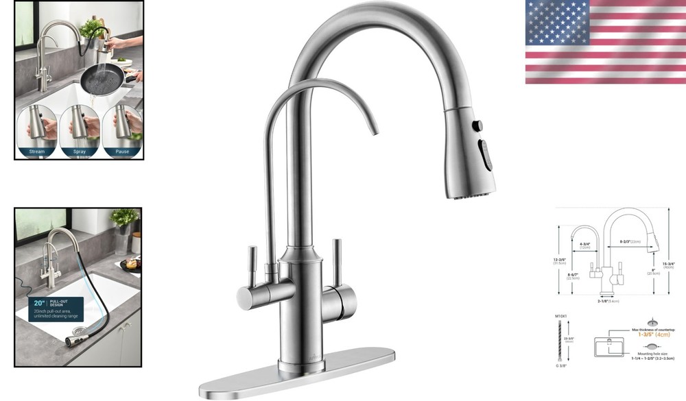 Mounting Type: Deck Mount Item Package Quantity: 1 UPC: Does not apply Type: Kitchen Faucet Batteries Included?: No Special Features: Pull Down Sprayer, Built In Water Filter Shape: High Arch Material: Stainless Steel Number Of Handles: 1 Faucet Mounting Type: Deck Mount Handle Material: Stainless Steel Installation: Single Hole Included Components: Instruction Manual Is Electric: No Special Feature: Pull Down Sprayer, Built In Water Filter Room: Kitchen Installation Type: Single Hole gtin13: Does not apply Brand: Unbranded Valve Type: Cartridge Valve Hole Count: 1 Suitable For: Kitchen Sink, Kitchen Handle Location: Single-hole-deck-mount Item Weight: 4.54 pounds Recommended Uses For Product: Kitchen Spout Design: Pull-down Color: Brushed Nickel Batteries Required?: No Items Included: Instruction Manual Features: Pull-Out, Pull-Down Sprayer, Built-In Water Filter Maximum Flow Rate: 1.8 Gallons Per Minute Spout Height: 10.5 Inches Assembly Required: No Handle Type: Lever Style: Modern Finish Type: Brushed Product Dimensions: 17"d X 3"w X 13"h Finish: Brushed Faucet Hole Spacing: 1 Number of Faucet Holes: 1 Number of Faucet Handles: 1