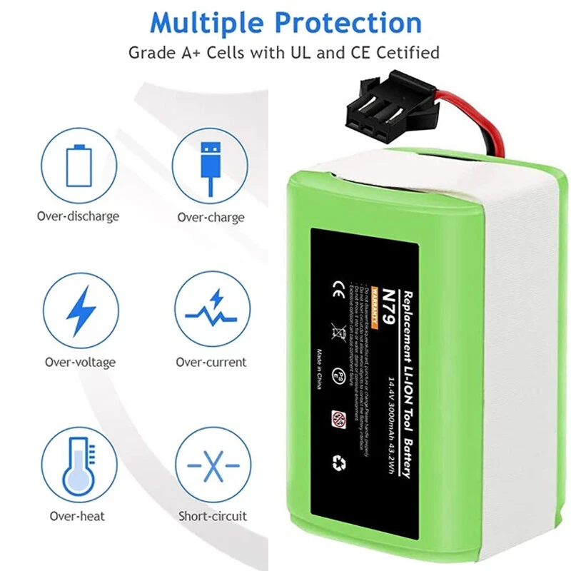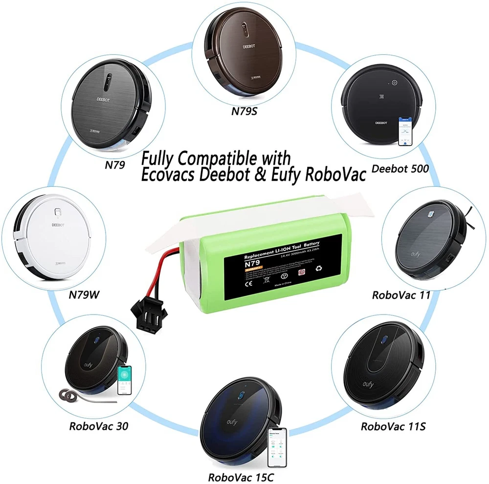 Product Description About this item Lithium-ion 🌳【Battery Type】Battery type: Li-ion battery,Voltage: 14.4V, Capacity: Upgraded 3000mAh(No Fake High Label Capacity). No memory effect, no pollution, and low self-discharge, can be charged or discharged as needed without loss of capacity. 100% compatible with original charger. 🌳【Compatibility】Compatible with Ecovacs Deebot N79S, Deebot N79, Deebot DN622, Eufy RoboVac 11, RoboVac 11S, RoboVac 11S MAX, RoboVac 12, RoboVac 15T, RoboVac 15C, RoboVac 15C MAX, RoboVac 30, RoboVac 30 MAX, RoboVac 30C, RoboVac 35C, G10 Hybrid, G30, G30 Edge, G30 Hybrid, G30 Verge. See more compatible model in description. 🌳【600+ Recharge Cycles】POWTREE 3.0Ah Ecovcas battery replacement can be recharged up to 600+ cycles of use. No memory effect, low self-discharge rate and long-lasting battery life 🌳【High Quality】Battery uses the highest quality cells, safe with rapid-charge technology while providing overcharge and over discharge multiple protection to increase the life of the battery. Reliable safeguard features with the protection for short-circuit, output over-voltage, over-heat and output over-current. Perfect Battery Management System, high-end protection IC. Power Battery to support max. 8A discharge. Compatible with Ecovacs N79S, 500, N79, N79SE, N79W, DN622, DN622.11 Robot Vacuum Cleaners. 14.4V 3000mAh Li-ion rechargeable replacement battery makes vacuum lasting around 100 minutes per charge. Easy to install, local sale support, 24/7 response to online messages, 12 months warranty. Futures : 3000mAh High Capacity Battery Li-ion Rechargeable battery, convenient to use. And it has no memory effect. Can be charged or discharged as needed without loss of capacity. Same size & function as original battery, don't worry damaging your robot. Quick charge and easy to install. ISO9001, RoHS, and CE certified NO FAKE HIGH "LABEL" CAPACITY High Performance Li-ion Battery with 600+ Recharge Cycles With 3000mAh capacity, the battery can last 120-180 minutes after being fully charged (Depending on use & setting), like the original. Built-in multiple protections against overload, overvoltage, overcurrent, short circuit and internal overheating, ensure effective and safe cleaning in your home. Imported high density lithium battery, higher cost, better performance, more durable(can be recharged 600+ cycles) Compatible With:(use"Ctrl+F" to find your own PN & Model) Compatible for Deebot Series: Ecovacs Deebot N79, Deebot N79S, Deebot 600, Deebot 601, Deebot DN622, Deebot 661 Compatible for RoboVac Series:Eufy RoboVac 11 (T2102), RoboVac 11S (T2108), 11S MAX (T2126), RoboVac 12, 15T, 15C (T2120), 15C MAX, 25C Max, 30, 30C, 30 MAX, 35C, G10 Hybrid, G30, G30 Edge, G30 Hybrid, G30 Verge Compatible for :for Conga 990, Tesvor x500 NOT Compatible with: NOT for Eufy RoboVac 11+, iLife A4/A4S/A4S pro/A6/A9/V7/V7S/V7S pro Compatible Models For Eufy RoboVac 11, RoboVac 11S, RoboVac 11S MAX For Eufy RoboVac 12, RoboVac 15C, RoboVac 15C MAX, RoboVac 15T For Eufy RoboVac 30, RoboVac 30C, RoboVac 30 MAX, RoboVac 35C For Ecovacs Deebot N79,Ecovacs Deebot N79S,Ecovacs Deebot DN622 Ecovacs Deebot N79, Deebot N79S, Deebot DN622, Deebot DN621, Eufy RoboVac 11, RoboVac 11S, RoboVac 11S MAX, RoboVac 15T, RoboVac 30, RoboVac 30C Max, RoboVac 15C, RoboVac 15C MAX, RoboVac 12, RoboVac 35C. For Eufy RoboVac 11, RoboVac 11S, RoboVac 11S MAX For Eufy RoboVac 12, RoboVac 15C, RoboVac 15C MAX, RoboVac 15T For Eufy RoboVac 30, RoboVac 30C, RoboVac 30 MAX, RoboVac 35C For Ecovacs Deebot N79,Ecovacs Deebot N79S,Ecovacs Deebot DN622 For Eufy RoboVac 11, RoboVac 11S, RoboVac 11S MAX For Eufy RoboVac 12, RoboVac 15C, RoboVac 15C MAX, RoboVac 15T For Eufy RoboVac 30, RoboVac 30C, RoboVac 30 MAX, RoboVac 35C For Ecovacs Deebot N79S, 500, N79, N79SE, N79W, DN622, DN622 About Us Welcome to our store! We are a professional worldwide wholesale company. High product quality, reasonable prices, excellent customer service and a reliable credit standing is our tenet.If you like our products, please add my eBay shop to your "My Favorites" list. All the products we are selling include factory warranty , don’t cover items that have been abused, burned and damaged in any form. Payment We accpet payment via PayPal , E-wallet , some Credit Card , Direct Debit and Other specific payment methods. Import duties,taxes and charge are not included in the item's price or shipping cost.These charges are the buyer's responsibility. Please check with your country's customs office to determine what these additional costs will be prior to bidding or buying. Insurance is included in the Shipping & Handling costs paid. Shipping Items are generally shipped out in 1-3 business day after your payment has been cleared (Sat. & Sun. excluded.) Orders from the United States Warehouse will be shipped out via USPS or UPS. The shipment usually takes 3-7 business days(Saturday and Sunday excluded), if you need the item urgently, please contact us for detail before purchasing. Local pick up is not available. Orders from China will be shipped via Belgian Post or Post NL.The shipment will take 15-35 working days,please contact us if you didn't get the parcel for a long time. We do not ship to APO, FPO, Alaska, Hawaii and Puerto Rico addresses, and we are unable to ship to PO BOX for this item. Please provide your psychical address. Returns You have 60 days to return it from the date it was received. All returned items must be in the original package and you must provide us with the shipping tracking number,specific reason for the return and your ebay ID. We will refund your full winning bid amount , upon receipt of the item in its original condition and package with all components and accessories included. Contact Us Dear buyers,we appreciate your business, if you are satisfied with our service , please leave us a Positive feedback and rate the details of the transaction (Detailed Seller Ratings) with a " Pefect Stars ". We