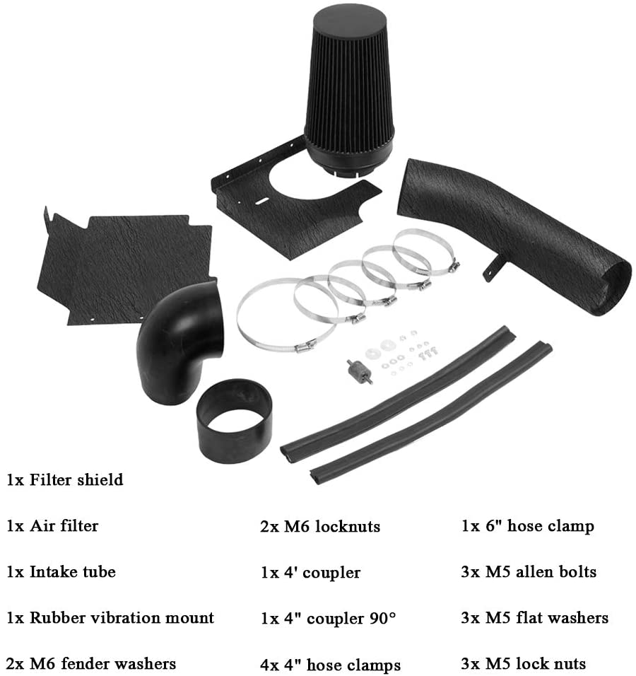 【unique】The kit includes a intake tube and steel heat shield that features a durable carbon-black powder coating for long lasting good looks International products have separate terms, are sold from abroad and may differ from local products, including fit, age ratings, and language of product, labeling or instructions UniqueThe kit includes a intake tube and steel heat shield that features a durable carbon-black powder coating for long lasting good looks Product Description MOOSUN Performance Cold Air Intake Kit Applicable vehicle Fit for 2002-2006 Cadillac Escalade with 5.3L/6.0L V8 Engine Fit for 2002-2006 Avalanche 1500 with 5.3L V8 Engine Fit for 2000-2006 Suburban 1500/2500 with 5.3L/6.0L V8 Engine Fit for 2000-2006 Tahoe with 4.8L/5.3L V8 Engine Fit for 1999-2006 Silverado 1500 / 1500 HD with 4.8L/5.3L/6.0L Engine Fit for 1999-2006 Silverado 2500 / 2500 HD with 5.3L/6.0L V8 Engine Fit for 2001-2006 Silverado 3500 with 6.0L V8 Engine Fit for 2003-2006 Silverado SS with 6.0L V8 Engine Fit for 1999-2006 GMC Sierra 1500 / 1500 HD with 4.8L/5.3L/6.0L V8 Engine Fit for 1999-2006 GMC Sierra 2500 / 2500 HD with 5.3L/6.0L V8 Engine Fit for 2002-2006 GMC Sierra Denali with 6.0L V8 Engine Fit for 2001-2006 GMC Yukon Denali with 6.0L V8 Engine Fit for 2001-2006 GMC Yukon Denali XL with 6.0L V8 Engine Fit for 2002-2006 GMC Yukon Denali XL 1500 with 5.3L V8 Engine Fit for 2002-2006 GMC Yukon Denali XL 2500 with 6.0L V8 Engine Please MATCH your vehicle on the left top before purchasing Package Content High Flow Air Filter Smooth Intake Pipe Silicone Coupler Hose Clamp The cold air intake kit comes complete with everything necessary for installation Dry Air Filter Each intake kit comes with a huge, highly-efficient air filter which results in better performance and better protection for your engine. Most new design are now dry filter instead of oil filter. Our filter do not require oil, it is reusable and washable. You can wash it with soap and water, rinse it until it is all dry up and use it again. We recommend you to check every 5,000 miles to see if it needs to be wash / clean. Premium Silicone Components Silicone is a premium rubber which seals better and lasts longer. The air filter, couplers and tube seals in our intake kits are made from our premium silicone rubber. This means they won't crack, has exceptional tear strength, and can handle temperatures as high as 400F. Also, with a high friction surface and no oily residue, our silicone filters and couplers won’t slide off the tube. Easy to Install with Basic Hand Tools MOOSUN air intakes are very easy to install on your car or truck. A typical air intake installation can be done with a screwdriver, pliers and a ratchet-set in 90 minutes or less! MOOSUN specifically engineers their intake kits to use existing factory holes and mounting points, making installation simple. The vast majority of MOOSUN cold air induction systems do not require any cutting or drilling. Our air intake Cold air allows to burn fuel more efficiently, comparing to hot air. Protect Your Engine Multiple filtering protection engine Increase power high efficiency air intake Smooth flow enhance response Not afraid of moisture effectively prevent the breakdown of the air filter Your Engine will GROWL A satisfying growl upon acceleration, yet quiet once at speed. Removes stock baffles and soundproofing components from the engine bay. How to install a MOOSUN High Flow Intake Kit Step 1 - Make sure your engine is cool to the touch. Step 2 - Disconnect your battery cable from the negative terminal. Step 3 - Remove your old air intake. Step 4 - Attach the silicone coupling that came with the air intake kit to the throttle body. Step 5 - Secure the coupling by tightening a hose clamp at the end. Step 6 - Place another hose clamp on the front of the coupling, but don’t tighten it just yet. Step 7 - Slide the intake tube into the silicone coupling, and ensure that your intake pipe is running from the throttle bay away from the engine bay. Step 8 - Tighten the silicone coupling and secure all brackets on the tube. Step 9 - Plug the mass air flow sensor into the new cold air intake system. Step 10 - Reconnect the battery.Enjoy the new power boosts immediately!
