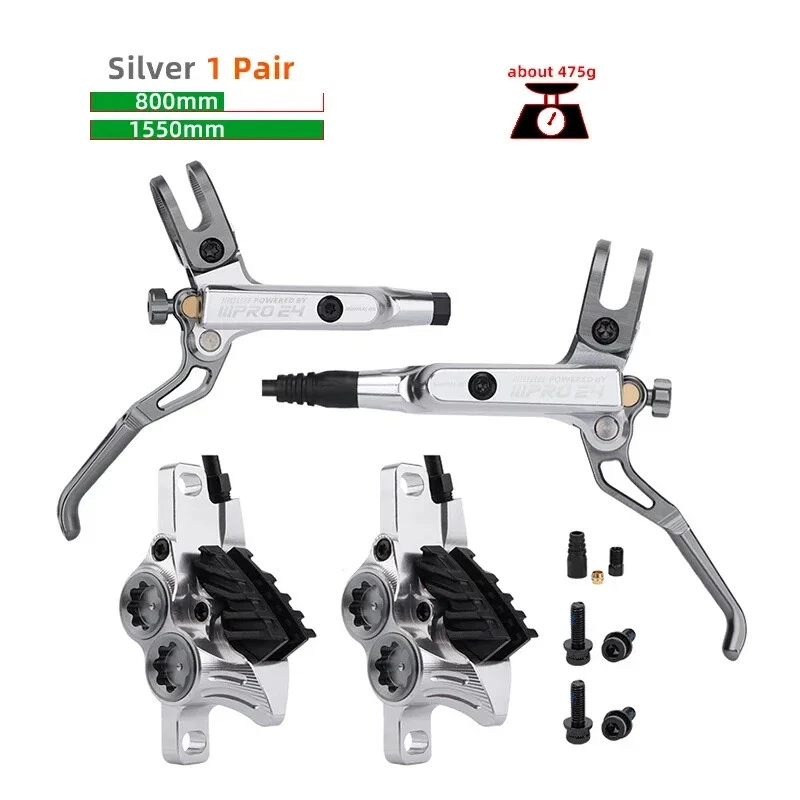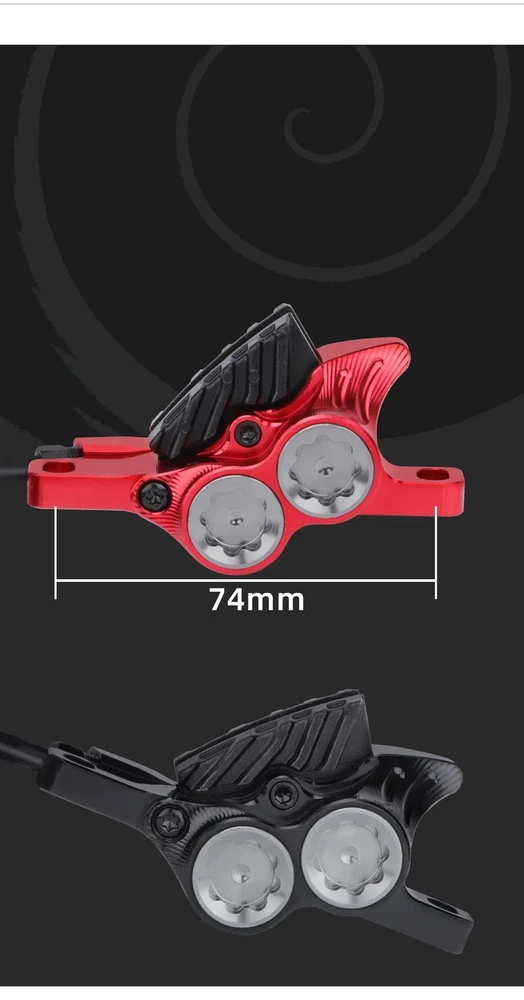 Model: E4 Color: black, red, silver, blue, green, purple Material: magnesium aluminum alloy Length: Front brake 800mm; Rear brake 1550mm Brake Pistons: 4 Pistons Brake Fluid Type: Mineral Brake Fluid Weight: about 230g for the front brake; about 245g for the rear brake; about 28g for the screw. Brake For: mountain bikes, DH,AM,folding bikes, electric bikes, etc. The brakes are the left front brake and the right rear brake Left hand controls the front brake, right hand controls the rear brake. Right rear brake suitable for internal wiring!!! 4 Piston brake Smooth and even braking Cooling brake pads The multi-metal copper-based ceramic heat sink improves the heat dissipation performance by 25%. ①Cylinder block ②M6 oil filling screw ③CNC anti-skid vent brake lever ④Built-in bearing ⑤ Travel adjustment screw ⑥22.2mm detachable clamp ring The rear brake adopts the cable routing inside the frame, and the brake lever/caliper has a split structure. German TUV safety certification, the measured braking force can reach 641N.