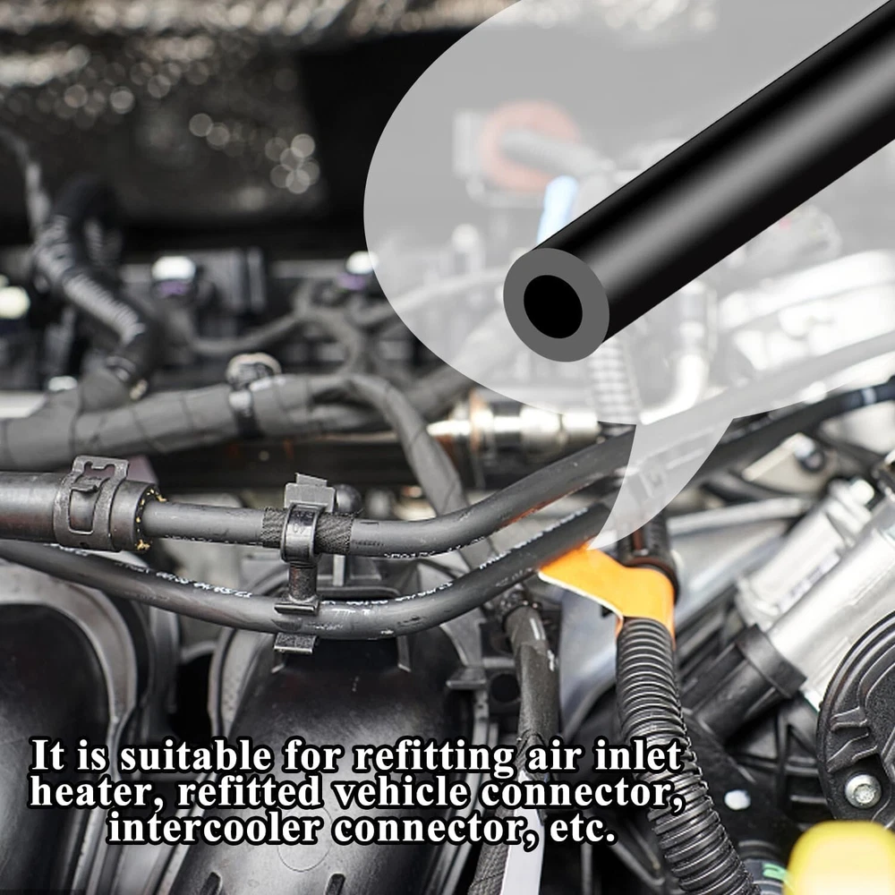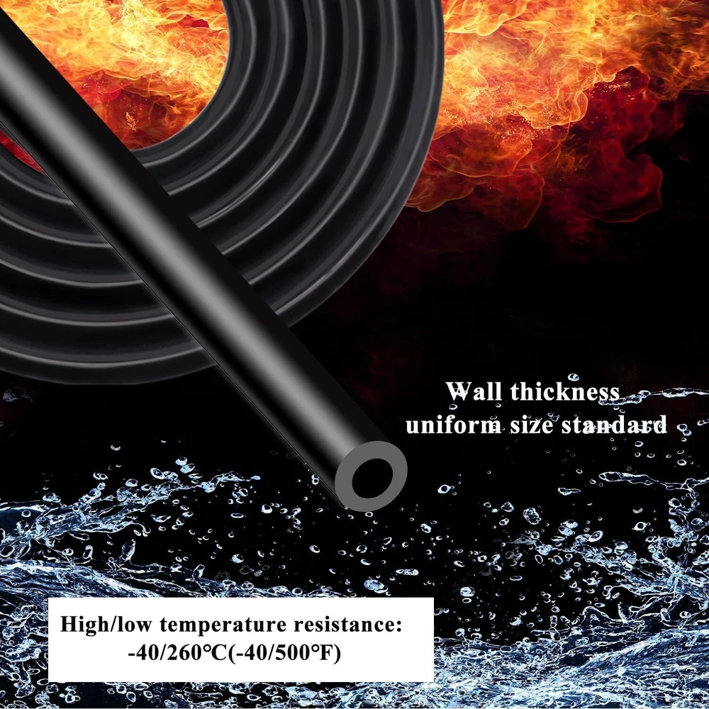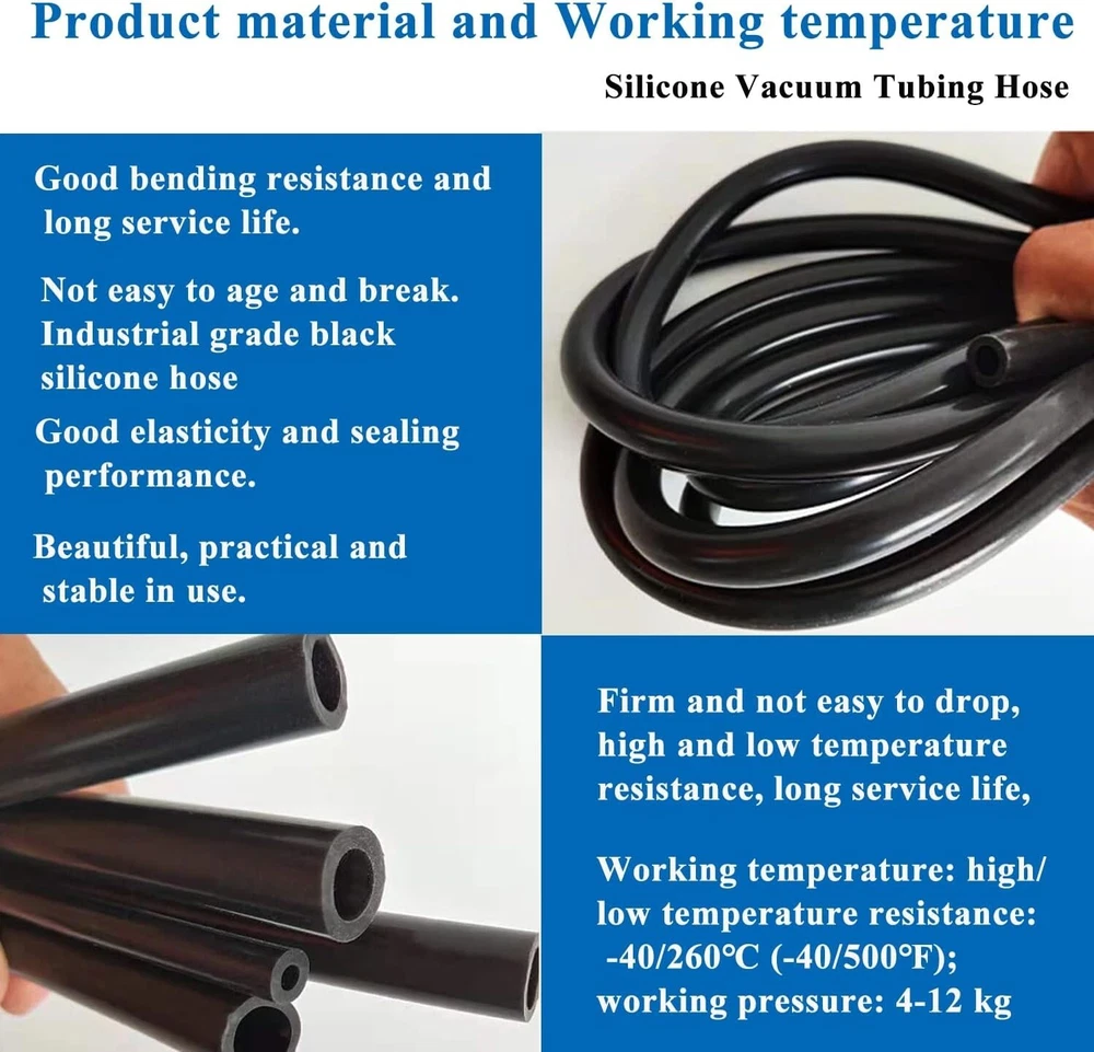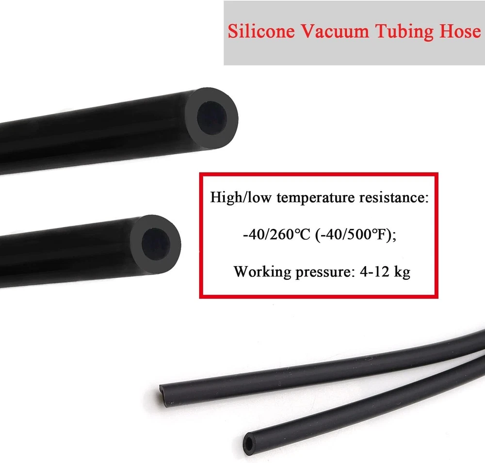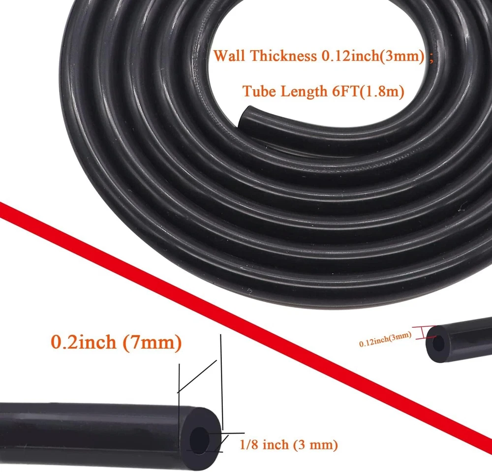 BRAND NEW 1/8"+ 5/32"+ 1/4"+ 5/16"+ 3/8" The new upgraded black silicone vacuum hoses 6pcs with inner diameter of 3mm, 4mm, 5mm, 6mm, 8mm and 10mm Vacuum hoses has a wall thickness of 0.12 inches (3mm); The pipe length is 6.6 feet (2 meters) Vacuum silicone hose is made of silicone material. High temperature resistance! 130PSI maximum pressure to ensure strength, good plasticity, strong durability, long-term use, not easy to damage. Vacuum hose characteristics:Working Pressure: 43PSI. Burst Pressure: 130PSI (room temperature);100PSI (high temperature). Temperature range: -40°F to 428°F (-40°C to 220°C) Scope of application: suitable for water or air transportation in engine compartment, automobile refitted intake pipe heater, refitted vehicle connector, intercooler connector, DIY air intake or radiator cooling system. Silicone hoses are only used for air and water 1/8 Inch The new upgraded black silicone vacuum hoses with inner diameter of1/8"(3mm),Outer Diameter 0.2"(7mm) Vacuum hoses has a wall thickness of 0.12 inches (3mm); The pipe length is 6.6 feet (2 meters) Vacuum silicone hose is made of silicone material. High temperature resistance! 130PSI maximum pressure to ensure strength, good plasticity, strong durability, long-term use, not easy to damage. Vacuum hose characteristics:Working Pressure: 43PSI. Burst Pressure: 130PSI (room temperature);100PSI (high temperature). Temperature range: -40°F to 428°F (-40°C to 220°C) Scope of application: suitable for water or air transportation in engine compartment, automobile refitted intake pipe heater, refitted vehicle connector, intercooler connector, DIY air intake or radiator cooling system. Silicone hoses are only used for air and water. THANK YOU