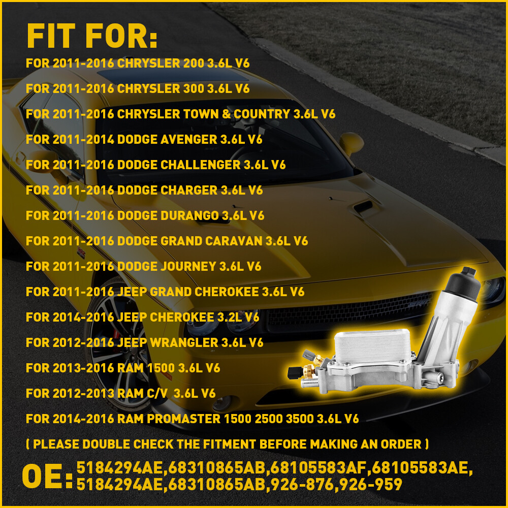 Items Included: Cover, Gasket, O-Ring, Screws, Seal, Oil Filter, Oil Cooler Brand: Unbrand Material: Aluminum Fitment one: for Chrysler 200 300 Town & Country Type: Engine Oil Filter Housing Interchange Part Number: 68105583AA, 68105583AB, 68105583AC, 68105583AD, 68105583AE, 68105583AF, 68105583AG, 68310865AA, 68310865AB, 68310865AC, 68310865AF, 68365925AA, 68365925AB, 68365925AC, 68365925AD, 926-876 OE/OEM Part Number: 5184294AE, 68310865AB, 68105583AF, 68105583AE, 926-876, 926-959 Fitment Four: for Jeep Grand Cherokee Cherokee UPC: Does not apply Superseded Part Number: 5184294AE, 68310865AB Gasket Material: Rubber Placement on Vehicle: Front Finish: Matte gtin13: Does not apply Manufacturer Warranty: 3 Years Mounting Style: Clip-On Engine: 3.6L V6 Fitment Three: For ProMaster 2500, ProMaster 3500 Manufacturer Part Number: 926-876, 926-959 Features: Easy Installation Fitment two: for Dodge Avenger Challenger Charger Grand Caravan Universal Fitment: Yes