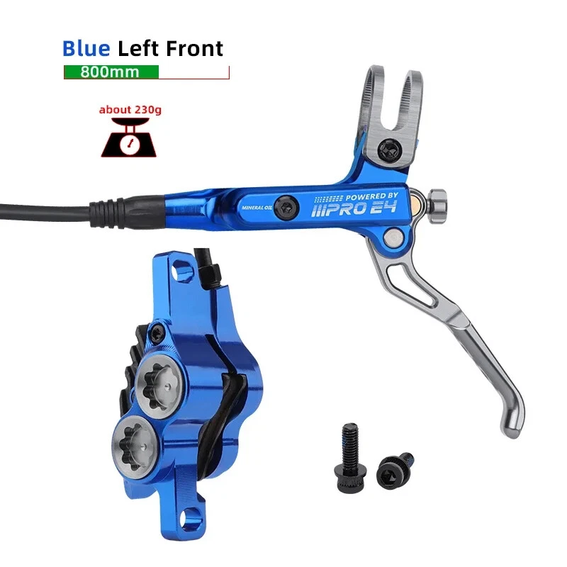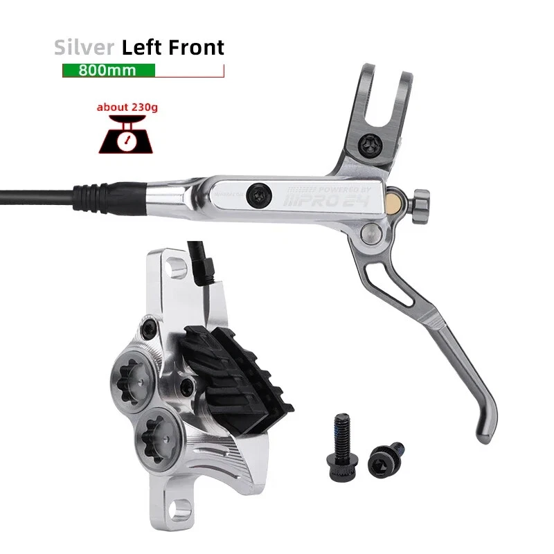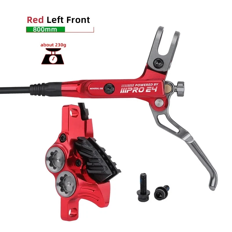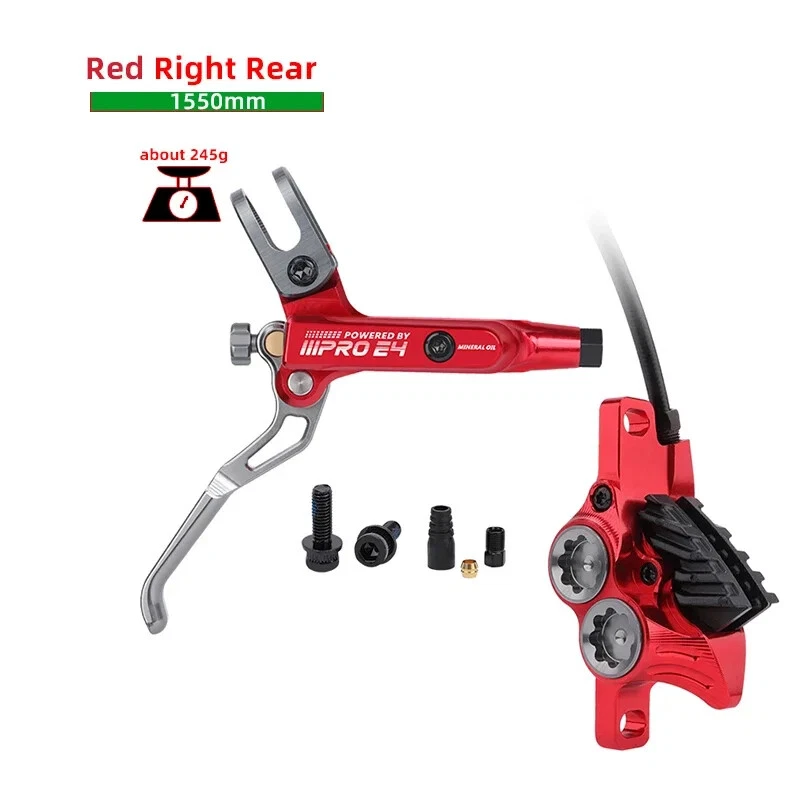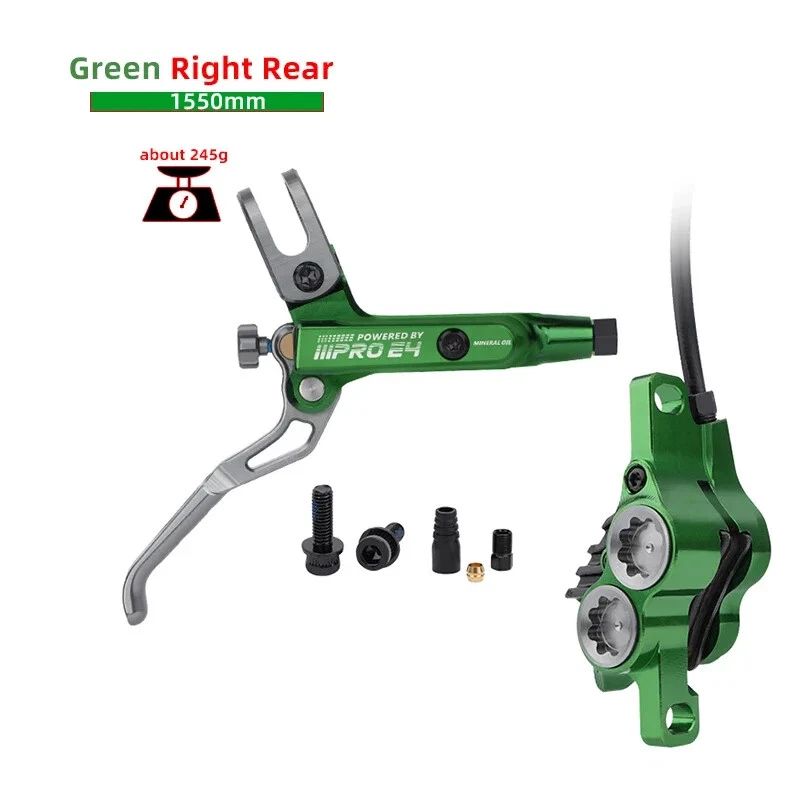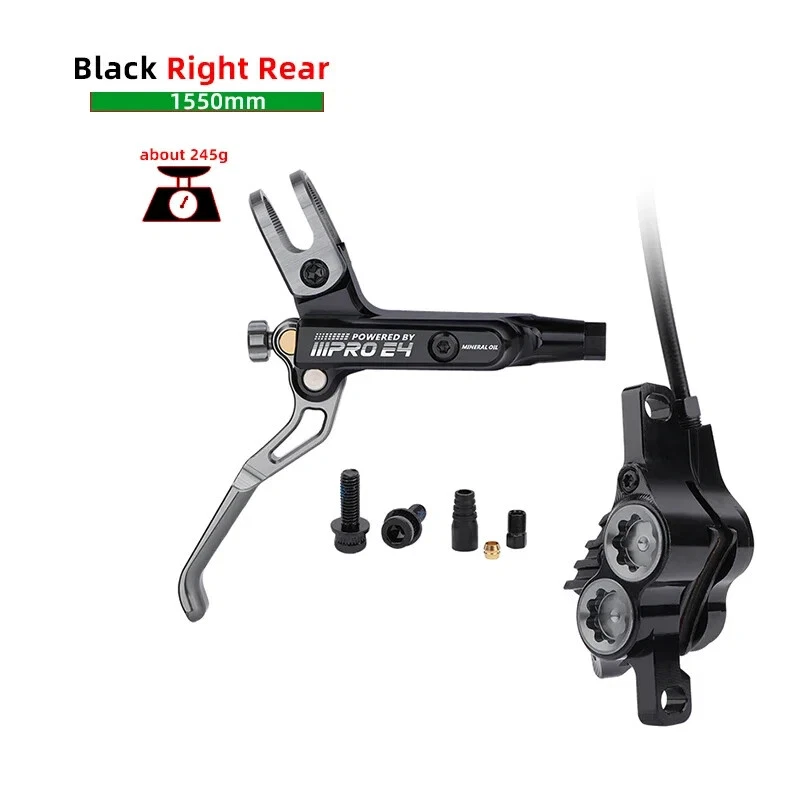 Model: E4 Color: black, red, silver, blue, green, purple Material: magnesium aluminum alloy Length: Front brake 800mm; Rear brake 1550mm Brake Pistons: 4 Pistons Brake Fluid Type: Mineral Brake Fluid Weight: about 230g for the front brake; about 245g for the rear brake; about 28g for the screw. Brake For: mountain bikes, DH,AM,folding bikes, electric bikes, etc. The brakes are the left front brake and the right rear brake Left hand controls the front brake, right hand controls the rear brake. 4 Piston brake Smooth and even braking Cooling brake pads The multi-metal copper-based ceramic heat sink improves the heat dissipation performance by 25%. ①Cylinder block ②M6 oil filling screw ③CNC anti-skid vent brake lever ④Built-in bearing ⑤ Travel adjustment screw ⑥22.2mm detachable clamp ring The rear brake adopts the cable routing inside the frame, and the brake lever/caliper has a split structure.