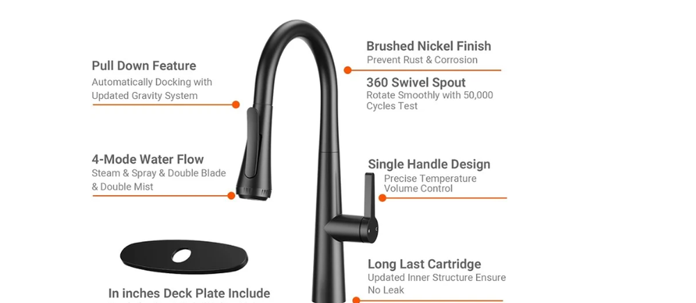 Damaged Box - Box has staining. Item is brand new and unused. Product Description: 【Healthy Stainless Steel Faucets】- LEPO kitchen faucet for sink is made with premium food-grade SUS 304 stainless steel which is eco-friendly, and single handle kitchen faucet are food-grade. Brush Nickel kitchen faucet is natural, hygienic and healthy for your families. Healthy utility sink faucet fits for kitchen, laundry room, bar, RV, etc. 【Four-Modes Sprayer Kitchen Faucet 】 - Kitchen faucet with pull down sprayer 4 spray modes: Double mist/Double blade/Steam/Spray. Steam for filling water and Spay for strong rinsing. Double mist with powerful high-pressure slicing water, easier to clean a variety of stains. Double blade for easier washing vegetables and fruits. You can changes the modes with gently press on button according to your requirements. 【CUPC Certification-LEAK-FREE Faucet】- Pull-out kitchen faucet is equipped with a leak-proof ceramic cartridge tested over 500,000 cycles to help ensure lasting leak-free use, which is high temperature resistant