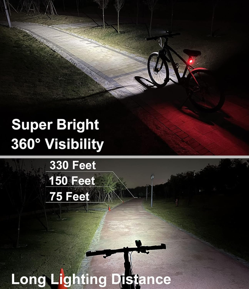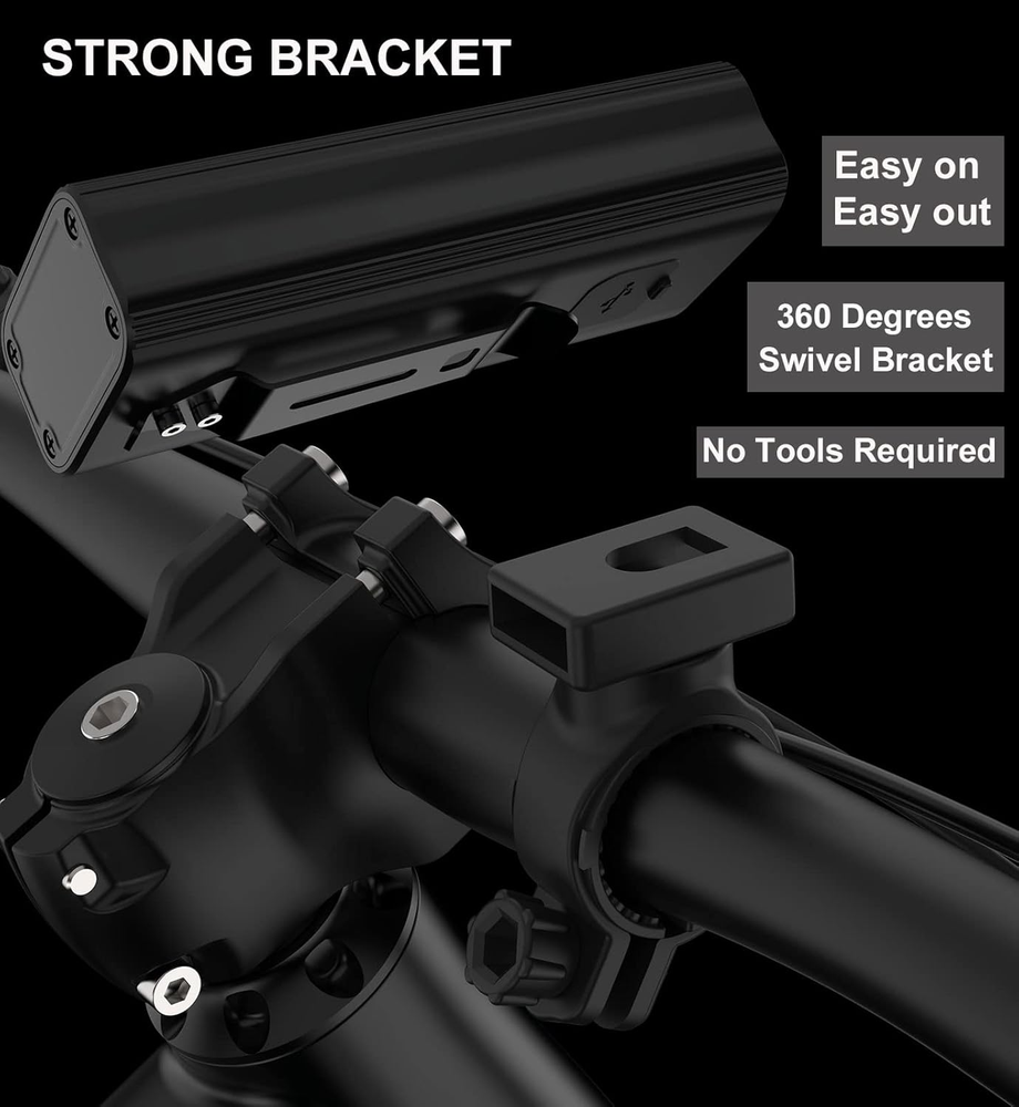 ✅SUPER BRIGHT BIKE LIGHT SET-1200 LUMEN headlight shines a powerful beam far and wide 180°over roads and trails making it easy to see and be seen! The wide beam make it visible from the sides also,cars can see you if they approach from your side at an intersection.Free Tail light included.The bike light set make your bicycle 360ºvisibility,keep in safety all the time.GET IT NOW! ✅BUILT IN HIGH CAPACITY BATTERY- The headlight built in high capacity 6400 mAh long lasting battery,can work 5 hours in high mode,7 hours in Middle mode,and 12 hours in low mode.Long runtime ensures that you reach your destination safely on dark nights,avoiding the battery run out and effect your safety and travel.Both USB Rechargeable Bike light front and back can charge from mobile phone charger,computer,power bank or any device with a USB port,never waste your money on the batteries again. ✅EASY INSTALLATION AND 360°RATATION SWIVEL STRONG MOUNT-Clip design,just slide on or remove the lights in seconds without tools.When you lock up your bike outside,You can easily remove it for charging and theft prevention.Rotate the USB Rechargeable bike light to shine any direction you want. The holder is steady and clamped to handlebar firmly.The light clicked to the base firmly.You put it on and don't need to worry about falling down. ✅WATERPROOF AND USB POWER OUTPUT-Water resistant rated to IPX5 - Protected against small rain, Splash water,light up your road in all conditions of weather!The lamp power supply can be used as a power source.If your mobile phone has no power during the riding,you can use it emergency charging the phone. ✅100% SATISFACTION-If you have any problem with your bike light set or if you are not happy with your purchase,contact us through our amazon listing with your order ID and you will receive a replacement.Has any problem please contact us we will reply you within 24 hours.Get It Now! Product Description Keep You Safe all the Time EILIOC KX3 is a bright and waterproof bike headlight with large battery capacity, long battery life. IPX5 waterproof rating headlight,protected against small rain, splash water,light up your road in all conditions of weather! See and Be Seen 1200 LUMEN headlight shines a powerful beam far and wide over roads and trails making you easy to see and be seen! The bike light set make your bicycle 360°visibility,keep in safety all the time. Daytime Visibility It is so bright that it cannot be ignored even during the day. BIKE LIGHT FRONT 5 Modes and 3 Modes Available Click the button on the bicycle light to switch mode.6 clicks are high/middle/low/strobe/SOS/off in sequence. The bicycle light can switch between 3 modes and 5 modes,When it is off,hold down the button for 2 seconds till the red and green light flashing to switch to 3 modes (high/low/strobe). When it is off again,hold down the button for 2 seconds to switch back to 5 modes. Battery Indicator Power capacity indication: When power is sufficient,indicator light is green. When power is less than 20%,the indicator light turn red to alert you when battery needs to be recharged. You don't have to worry about your riding suddenly pushed into the darkness. Charging indication:when charging,indicator light is red .When fully charged ,indicator light turn green. 360 Degree Rotation The front bike light can rotate 360 degrees. when you rotate it at a fixed angle,it will stay in that position,it won't rotate more unless you rotate it again. The holder is steady and clamped to handlebar firmly. The light clicked to the base firmly.You put it on and don't need to worry about falling down. Can Be Used as Power Bank If your mobile phone has no power during the riding,you can use it emergency charging your phone.This is important for outdoor cycling. Easy to Carry Just weight 198 g( not include bracket),size 3.9x1.78x0.98 in,Light and compact,it is easy to carry. When you lock your bike in parking area of work place or supermarket,you can easy to carry the headlight in the pocket or backpack for charging and theft prevention. Package included 1.Headlight*1 2.Taillight*1 3.USB wire *2 4.Headlight bracket*1 5.Rear light rubber strap*2 6.User's manual*2 VERSATILE BIKE REAR LIGHT More than a rear light You can not only use on bike light,but also use on baby carriages/helmet/backpack/the dog when walking. 6 Modes Work:3-17 hours Charge:1.5 hours 6 modes:High/Middle/Low/Slow-flashing/Strobe/Fast-flashing Easy to install Mounting is simple and effective with ultra-grippy rubber strap ensuring the light doesn’t slip on regular or oversize handlebars. IPX4 waterproof Water resistance design provides all-weather reliability.