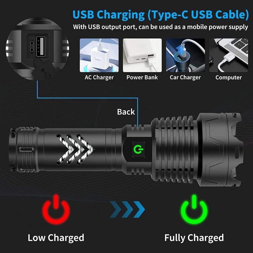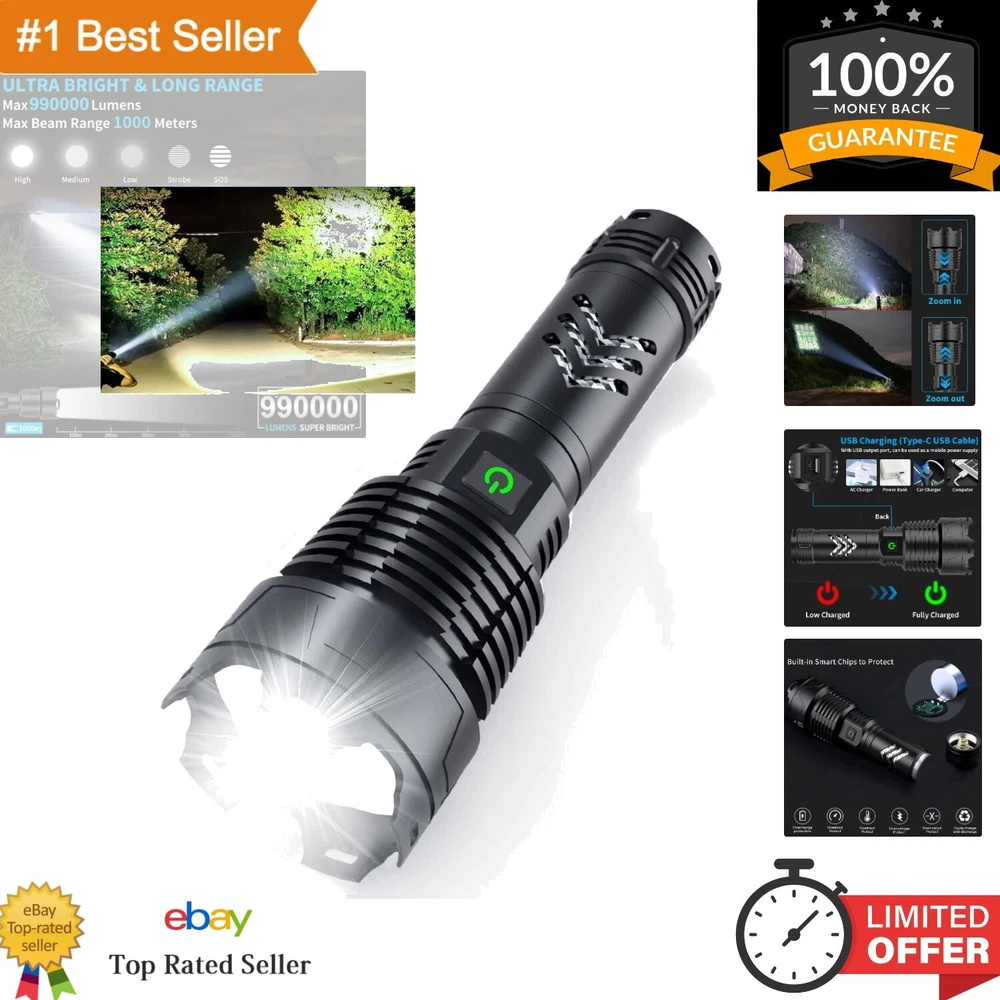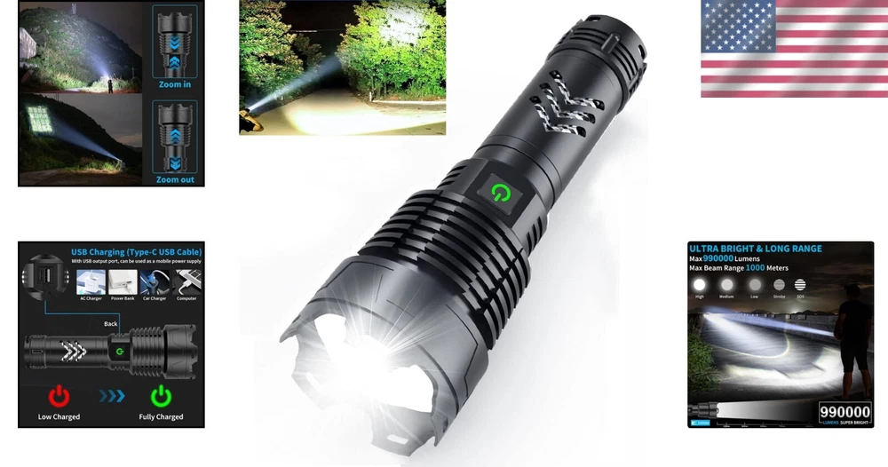 High-Powered 990000 Lumens Tactical Flashlight - USB-C Rechargeable, Durability
