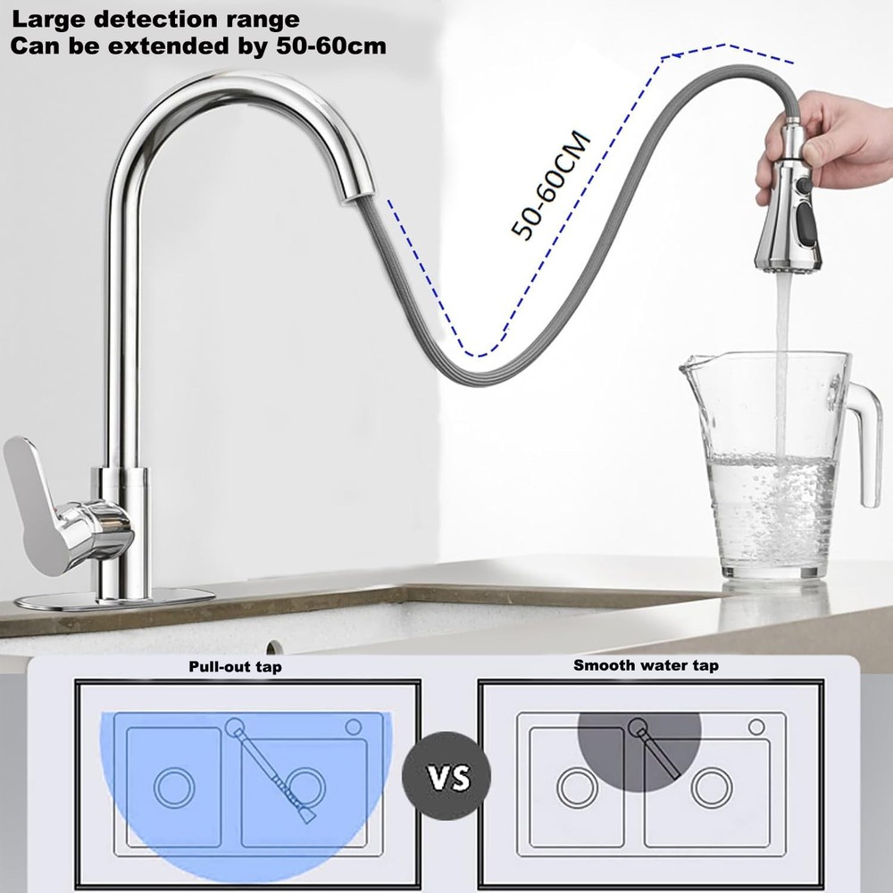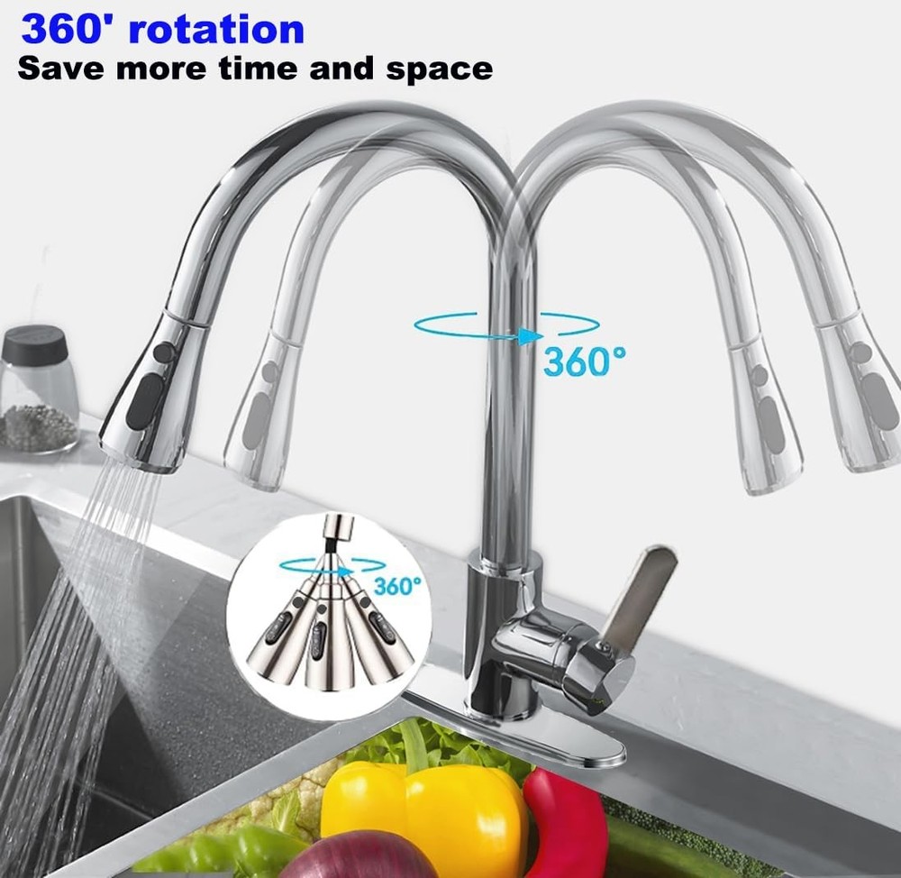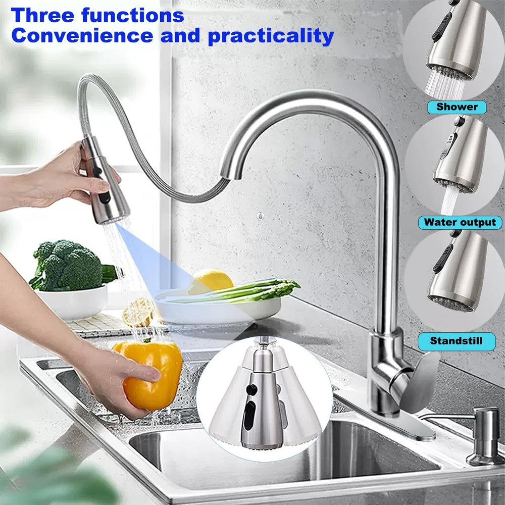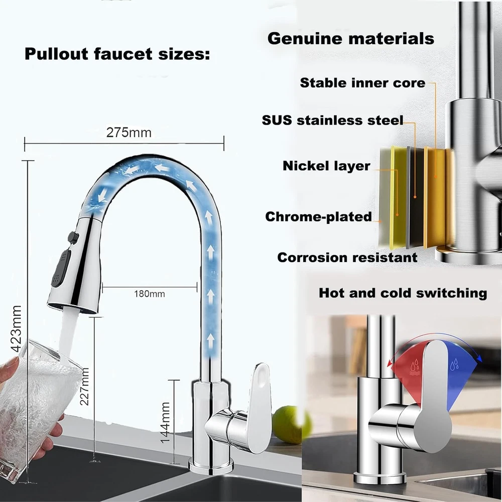 Extendable Pull-out Kitchen Faucet,360° Swivel Kitchen Faucet,High Pressure Kitchen Faucet,3 Function Stainless Steel Kitchen Sink Faucet (Chrome-Plated - Large Head) ▰ [MULTIFUNCTIONAL SPRAY]: this kitchen faucet has 3 mode settings (spray mode, mist mode, pause). Spray Mode - Uniform and splash-free, you can fill pots and pans with water and wash fruits and vegetables. Spray Mode - Powerful cleaning, you can quickly clean dishes and sinks. Pause mode - By pressing the pause button, you can interrupt the jetting process at any time. High pressure design and saves water. Suitable for any type of kitchen and bathroom decor. ▰[Modern Craftsmanship Design]:The kitchen tap is equipped with an extendable high arc spout and the shower head can be swivelled 360°. The total length of 60cm extendable spray head can cover almost all sinks or multiple areas. It can meet the design of two sinks or the operation requirements of large cleaning areas; making washing and cleaning more convenient and efficient. ▰[CLASSIC APPEARANCE DESIGN]:Our pull-out kitchen faucet has a fashionable and simple appearance, which allows you to create different kitchen styles. Kitchen taps with popular design give your kitchen a stylish highlight; Durable; Freestanding kitchen pull-out taps with solid base will make the taps more stable; Various plating colours on the surface are beautiful and moisture-proof, anti-embroidery, so that kitchens, bathrooms, etc. are always clean. ▰[Ceramic Spool & Premium Material]:Made of high quality stainless steel material, lead and nickel free kitchen pull out faucet is safer than regular faucets, so you can use kitchen mixer faucet. High quality stainless steel can prevent the pull out faucet from rusting or corroding, providing a longer service life. Ceramic Spool-3.0 porcelain disc mixer spool technology, durable no leakage, no noise, even longer service life. ▰[EASY INSTALLATION & QUALITY AFTER-SALES]:This pull-out kitchen faucet is suitable for all kitchen sinks. Follow the steps in the instructions to install it in minutes, using kitchen faucet hole diameter: 33-35mm, maximum installation countertop thickness: 40mm, general 9/16 connection. We provide 18 months warranty. You have any questions, please contact us in time, there is a professional team to solve your problems.
