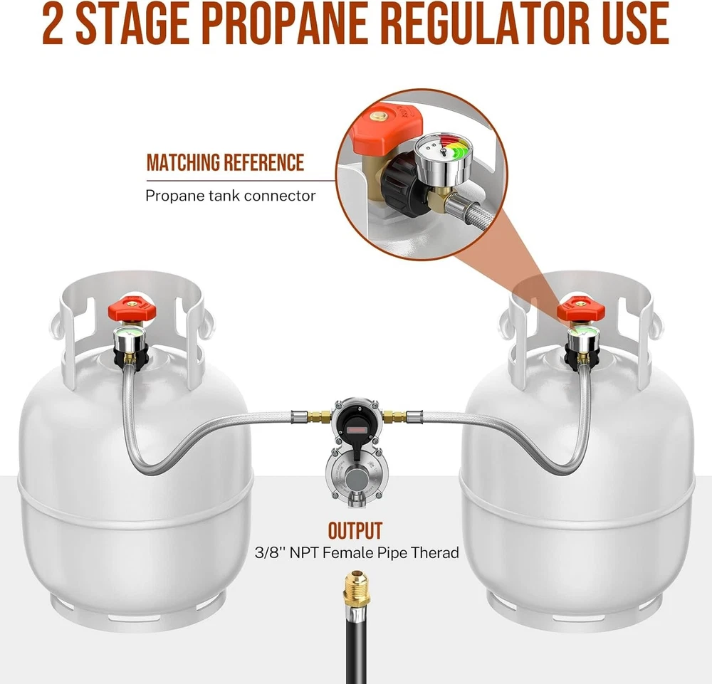High-Quality 2-Stage Auto Changeover Propane Setup for RVs with Gauge Included ‹ › ‹ › ‹ › ‹ › ‹ › ‹ › ‹ › ‹ › ‹ › High-Quality 2-Stage Auto Changeover Propane Setup for RVs Experience seamless outdoor adventures with our premium 2-Stage Auto Changeover Propane Setup, crafted specifically for RV enthusiasts. Enhance your propane management and never worry about running out mid-camping again. Key Features: Function Upgrade: Connect two propane tanks simultaneously; automatic switching from primary to reserve tank when the primary is empty ensures continuous gas supply. Gauge Included: A rotary pointer allows you to designate which tank to use, while a color-changing indicator alerts you when it's time to refill. Top-Quality Materials: Made from 100% solid brass and featuring stainless steel braided propane hoses, ensuring durability, longevity, and air-tight stability. Specification: Primary cylinder capacity of 210,000 BTU/hr and reserve cylinder capacity of 130,000 BTU/hr — perfect for all your recreational needs. Versatile Application: Perfectly suited for RVs, campers, and travel trailers with dual propane tanks. Replace existing automatic changeover regulators effortlessly; compatible with dual 5-40 lb refillable propane tanks or LP gas tanks. Complete Package: Includes 1 PC 2 Stage Auto Changeover RV Propane Regulator 2 pack 18'' Stainless Braided QCC1 1/4" Inverted Male Flare RV Pigtail Propane Hoses with Gauge 1 PC Roll Sealing Tape and 1 PC Wrench Peace of Mind: If for any reason you're not satisfied, contact us for a Free Replacement or Refund within 2 years. Why Choose Our Propane Setup? Designed with quality and convenience in mind, this 2-Stage Auto Changeover Propane Setup provides an unmatched level of reliability and ease for your RV adventures. Experience the freedom to roam without the anxiety of gas depletion, knowing that our high-grade materials and thoughtful features ensure your camping experiences are smoother and more enjoyable. Upgrade your RV's propane system today and relish in the seamless outdoor experiences that await! Shipping Free & Fast Shipping - We offer free shipping to most of the USA with a normal delivery time of 3-7 days. However, due to the current situation, additional delivery time (up to 3 weeks) may be required for some items. Alternative Carriers - We may use alternative carriers (e.g. USPS, FedEx, UPS, etc.) to ensure your package arrives safely and on time. Due to the use of multiple carriers, we are unable to provide a tracking number automatically. Handling Time - Orders are processed and shipped within 1-2 business days of receiving cleared payment. Shipping Restrictions - Shipping to Alaska, Hawaii, Puerto Rico, Guam, and other US territories may incur shipping charges or delivery restrictions. Please contact us before ordering, or your order can be refunded/cancelled. State Restrictions - There may be restrictions based on your state of purchase. For example, certain items may not be shipped to California due to state regulations. Contact for Tracking Updates - If you require tracking updates or have any concerns about the delivery of your order, please feel free to contact us, and we will be happy to assist you. Return Please see our eBay Return Policy. Thank you. Payment We accept all major credit cards, PayPal, and Apple Pay for your convenience. Your payment information is secure and encrypted to ensure a safe and seamless transaction. Please complete your payment within 3 days of purchase to avoid any delays in shipping. Feedback Your feedback is extremely important to us. We strive to provide the best products and customer service possible. If you are satisfied with your purchase, please take a moment to leave us a positive review. If you have any concerns or issues with your order, please contact us before leaving negative feedback. We are committed to resolving any problems and ensuring your satisfaction. Contact Us If you have any questions or concerns, please feel free to reach out to our customer support team. You can contact us through the eBay messaging system. We are available Monday to Friday, 9:00 am to 5:00 pm EST, and we will do our best to respond to your inquiry within 24 hours. Thank you for supporting our small family business! Manufacturer Part Number: RV Propane Regulator and Hose UPC: Not Set MPN: Not Set Unit Quantity: 2 Brand: Unbranded Part Type: Accessories Country/Region of Manufacture: Not Set Warranty: 2 Year Unit Type: lb