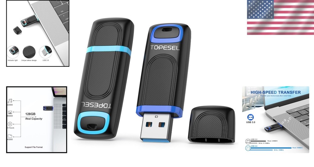 Super Speed 128GB Flash Drives USB 3.0 - Plug & Play, Perfect for Media Storage ‹ › ‹ › ‹ › ‹ › ‹ › ‹ › ‹ › ‹ › ‹ › ‹ › ‹ › Super Speed 128GB Flash Drives - USB 3.0 Enhance your digital life with our ultra-fast and sophisticated USB 3.0 Flash Drives. Designed for seamless plug-and-play functionality, these drives are perfect for storing and transferring your most cherished media. Features: Impressive Speed: Achieve read speeds up to 90 MB/s and write speeds up to 30 MB/s, making it 10 times faster than standard USB 2.0 drives. Backward-compatible for versatile use. Ample Storage: This 2-pack of high-capacity drives stores an astonishing amount of data - up to 12 hours of 4K video, 40 hours of 1080P video, 75,800 photos, or 38,800 songs. Durable Design: Crafted from durable ABS material, these drives resist corrosion, wear, impact, and heat, ensuring your data is always protected. Key Ring Compatibility: Featuring a convenient key ring design, easily attach your USB drive to your keychain for effortless portability. Effortless Accessibility: Enjoy instant usage with no software installation needed; simply plug it in and start transferring your data. Benefits: Transform the way you store and manage your media with lightning-fast speeds. Store all of your favorite memories and important files in one lightweight and portable solution. Durable design ensures long-lasting use and protection for your valuable data. Convenient size makes it easy to carry wherever you go. Why choose our Super Speed USB Flash Drives? Invest in excellence with our Super Speed 128GB Flash Drives. Designed for modern-life demands, they offer a detailed balance of speed, capacity, and durability. Whether you're a professional needing to carry essential documents or a media aficionado storing memories, these flash drives are the perfect blend of efficiency and sophistication. Elevate your data storage experience - order your pack today and embrace the ease of USB 3.0 technology! Shipping Free & Fast Shipping - We offer free shipping to most of the USA with a normal delivery time of 3-7 days. However, due to the current situation, additional delivery time (up to 3 weeks) may be required for some items. Alternative Carriers - We may use alternative carriers (e.g. USPS, FedEx, UPS, etc.) to ensure your package arrives safely and on time. Due to the use of multiple carriers, we are unable to provide a tracking number automatically. Handling Time - Orders are processed and shipped within 1-2 business days of receiving cleared payment. Shipping Restrictions - Shipping to Alaska, Hawaii, Puerto Rico, Guam, and other US territories may incur shipping charges or delivery restrictions. Please contact us before ordering, or your order can be refunded/cancelled. State Restrictions - There may be restrictions based on your state of purchase. For example, certain items may not be shipped to California due to state regulations. Contact for Tracking Updates - If you require tracking updates or have any concerns about the delivery of your order, please feel free to contact us, and we will be happy to assist you. Return 30-Day Hassle-Free Returns - We want you to be completely satisfied with your purchase. If you are not, you can return the item within 30 days of receiving it for a full refund or exchange. Easy Return Process - To start a return, simply contact us and we will provide you with a prepaid return shipping label and detailed instructions. Restocking Fee - There are no restocking fees for returns. However, the buyer is responsible for return shipping costs if the return is not due to a seller's error. Refund Processing Time - Refunds will be processed within 5 business days of receiving the returned item in its condition. Payment We accept all major credit cards, PayPal, and Apple Pay for your convenience. Your payment information is secure and encrypted to ensure a safe and seamless transaction. Please complete your payment within 3 days of purchase to avoid any delays in shipping. Feedback Your feedback is extremely important to us. We strive to provide the best products and customer service possible. If you are satisfied with your purchase, please take a moment to leave us a positive review. If you have any concerns or issues with your order, please contact us before leaving negative feedback. We are committed to resolving any problems and ensuring your satisfaction. Contact Us If you have any questions or concerns, please feel free to out to our customer support team. You can contact us through the eBay messaging system. We are available Monday to Friday, 9:00 am to 5:00 pm EST, and we will do our best to respond to your inquiry within 24 hours. Buy it now and enjoy a pleasant shopping experience! Unit Quantity: 0.35 ounces Interface: USB 3.0,USB 3.2 Gen 1 Compatible With: Android,iOS,Laptop,Mac,PC Features: Plug and Play,USB 3.0,Read Speed 90 MB/s,Write Speed 30 MB/s,Lightweight Design,Key Ring Design,Durable ABS Material,LED Indicator,Corrosion Resistance,Impact Resistance,Wear Resistance,Heat Resistance Type: USB Flash Drive Color: Black Write Speed: 30 MB/s Unit Type: oz Storage Capacity: 128 GB USB Specification: USB 3.0 Read Speed: 90MB/s