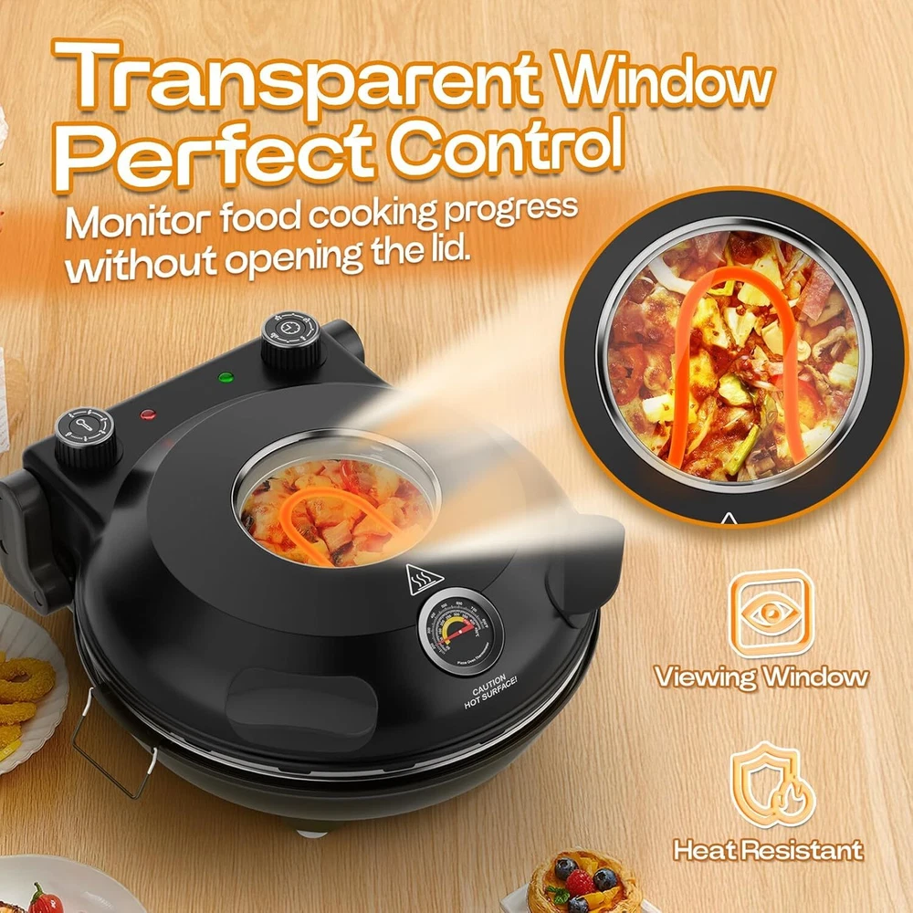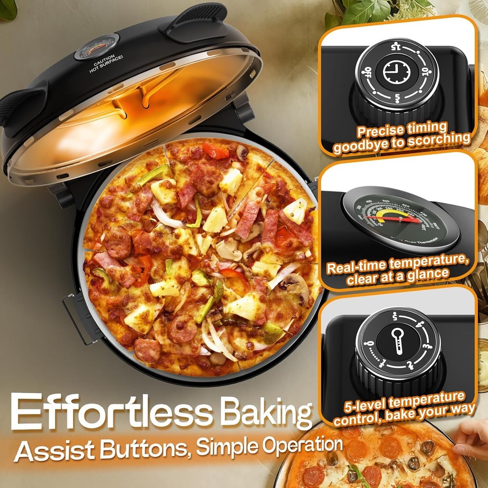 Upgrade Pizza Oven, Indoor Pizza Ovens Heats Up to 800˚F, 1200W Electric Pizza Oven, 12 Inch Pizza Maker with Viewing Window, Temperatures Control and Timer for Indoor and Outdoor Use Item Description About this item 【Upgraded Countertop Pizza Ovens】Experience making restaurant-quality pizza at home, with a new generation pizza oven equipped with a sensitive temperature sensor for precise control and upgraded internal components to enable the pizza oven to work more efficiently.Pizza oven reaches optimal temperatures quickly, ensuring perfectly crispy crusts and evenly cooked toppings every time 【Efficient Heating & Multi-Temperature Control Pizza Oven】Indoor pizza oven with 1200W of power you can whip up a delicious pizza in around 6 minutes, and unlike conventional ovens that top out at 450-500°F, our pizza oven can reach temperatures of up to 800°F, bringing restaurant-quality pizzas straight into your home, and it also has a 5-speed temperature adjustment to give you the freedom to control the temperature 【Transparent Window & Portable Design】This pizza cooker is lightweight and portable design, Suitable for home/outdoor use, pizza ovens is equipped with indicator light, timer and adjustable thermostat, easy to operate and control the baking process. With a unique transparent viewing window, you can monitor the progress of pizza baking in real time, ensuring you get the delicious pizza you imagined 【12-Inch Electric Pizza Oven】The 12-inch natural ceramic tray ensures even heat distribution for perfectly golden results every time. Enjoy authentic, crispy-crust pizzas in minutes with our countertop oven, designed for home chefs.Detachable ceramic tray enable hassle-free cleaning—simply wipe or rinse.Ideal for busy weeknights, parties, or cozy weekends 【Versatile Accessories Included】Our pizza oven comes with a wide range of accessories, including the pizza oven itself and a pizza spatula, pizza cutter, 2 wooden pizza paddles, pizza scraper, helping you to easily complete every step from making to enjoying, just plug it in and place it on the countertop for easy use. pizza ovens perfect for everyday cooking, holiday celebrations or lively gatherings › See more product details Payment We accept payment only through PAYPAL Shipping We ship products worldwide through standard express courier service, it will reach within 7 to 10 days to abroad buyers, we ship the product after recieved clear payment and give full information about shipment to the buyer Return We accept product return within 7 to 21 days from delivery date but product should be in original position and not in damaged condition,the return shipping charges will be buyer responsibility