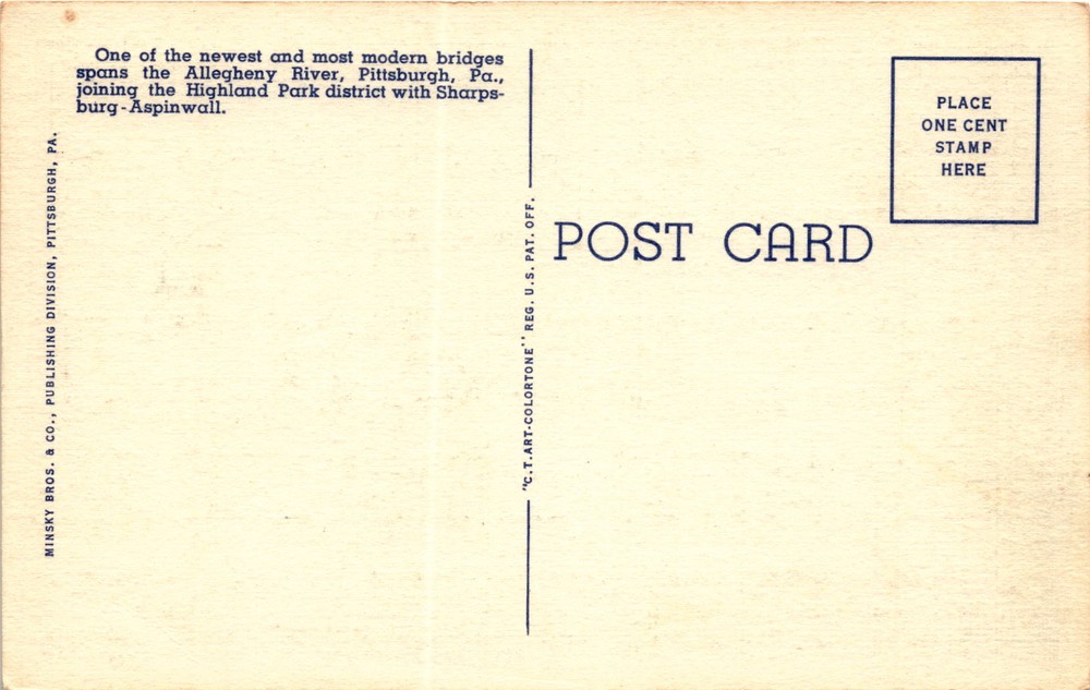 MAKE AN OFFER. THE MORE YOU BUY THE BETTER DEAL I WILL ACCEPT The postcard depicts the Highland Park Bridge, a modern structure spanning the Allegheny River in Pittsburgh, Pennsylvania. The bridge connects the Highland Park district with Sharpsburg-Aspinwall. The Highland Park Bridge, constructed at a cost of 22 million dollars, is one of the newest bridges in the area.