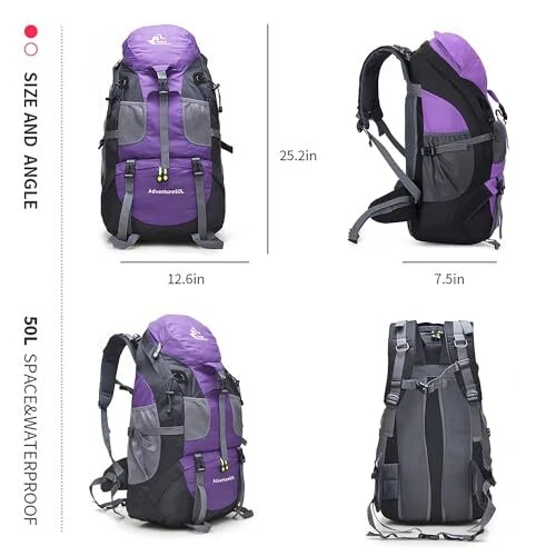 Hiking Backpack, Water Resistant Lightweight 50L Purple - No Shoe Compartment