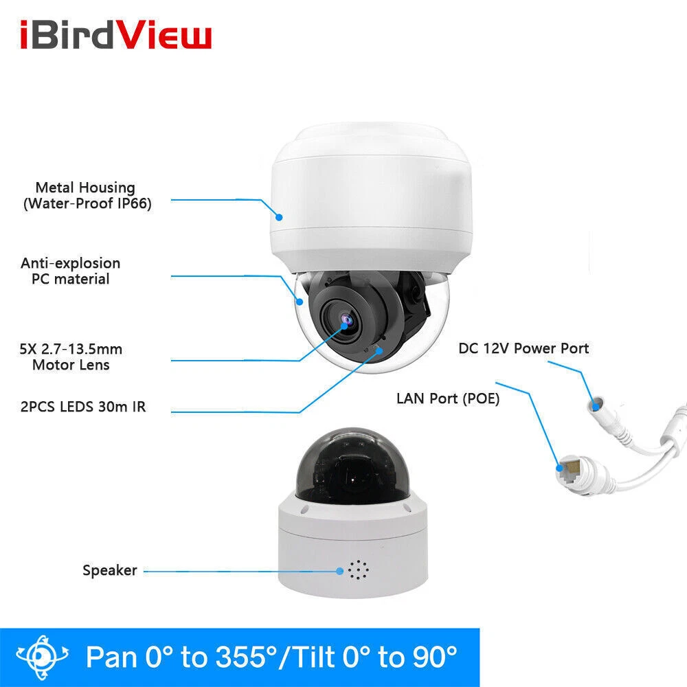 Audio: G.711 compression Features: 3.5 inch Mini speed dome, 5x(2.7-13.5mm) optical zoom (optional)., Protection grade: IP66., Smoke-colored riot transparent cover, Support Ethernet remote control., Support multi-protocols, Support ONVIF protocol., Support POE power supply Proportional Zoom: support Day & Night: IR Cut Filter,Auto,Color,B/w DNR: Low/Middle/High/Off IR Lamp: 2 High power array infrared LED S/N Ratio: ≧50dB Location: Outdoor & Indoor Infrared LED on: Auto POE: Support,802.3af/802.3at Effective Pixels: 8.0MP pixels Waterproof grade: IP66 Image Compression: H.265+/H.265/H.264 White Balance: Auto/Manual Dual Rate: 8MP+D1 Model: iB-3H5X-IS Back light Compensation: ON/OFF Client: Support SD Cord: Max 512G gtin13: Does not apply Color: White Focus Mode: Auto/Manual/SemiAuto IR Distance: 20-30M AGC: Auto/Manual Image Sensor: 1/2.7" SONY CMOS Type: PTZ Dome Camera DWDR: Support, on/off Working Temperature: -20°C~65°C UPC: Does not apply ONVIF: support Onvif Protocol Focal Length: 5X(2.7-13.5mm) optical zoom option Power: DC12V/2A (±10%), ≤8W Brand: iBirdView