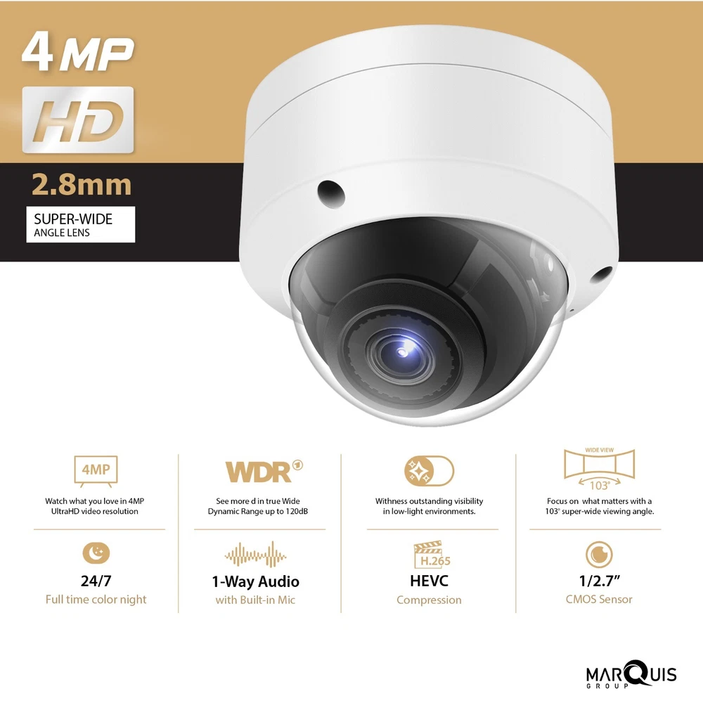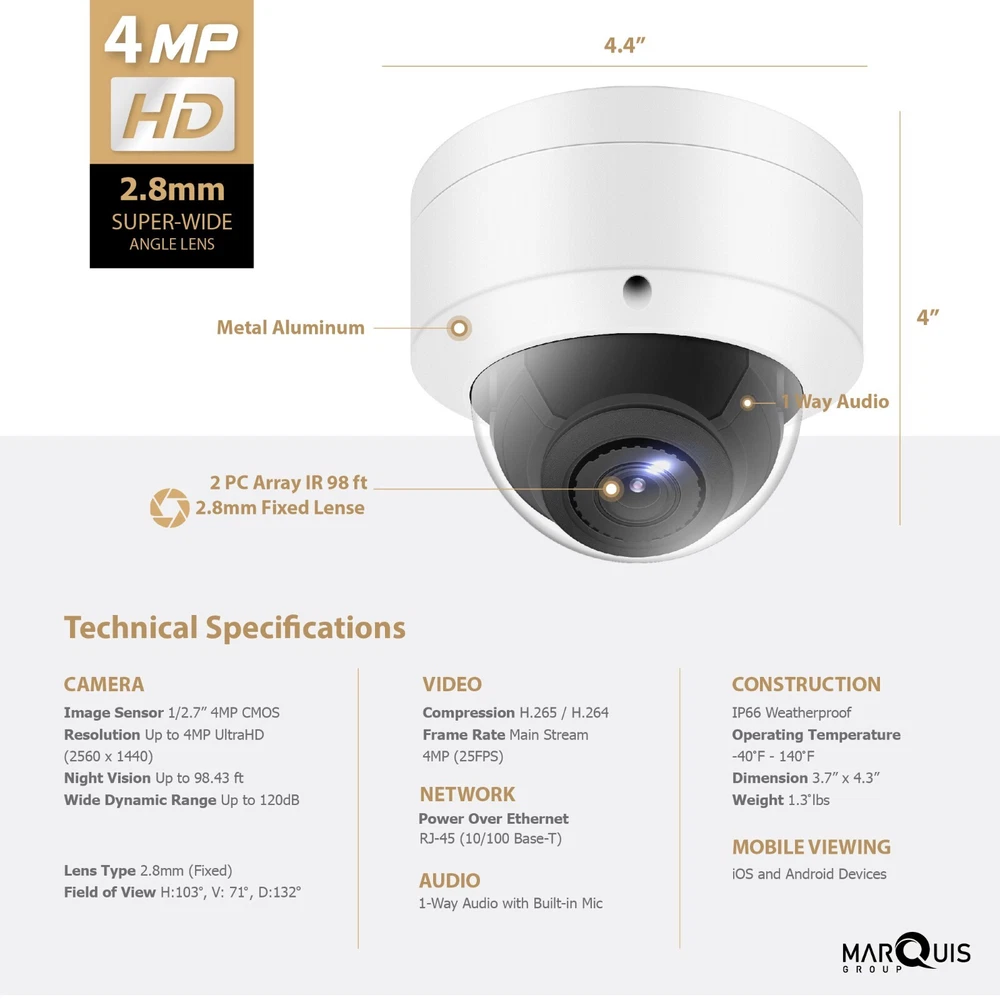 NDAA Compliant IP Camera Work with Hikvision Uniview NVR & Onvif System Camera Image Sensor: 1/2.9" Progressive Scan CMOS Signal System: PAL/NTSC Min. Illumination: Color: 0.01 lux @(F1.2, AGC ON), 0.028 Lux @(F2.0, AGC ON), 0 lux with IR Slow shutter: Support Shutter time: 1/3 s to 1/100,000 s Lens: 2.8 mm, horizontal field of view: 97° Lens Mount: M12 Adjustment Range: Pan: 0° to 355°, tilt: 0° to 75°, rotate: 0° to 355° Day& Night: IR cut filter with auto switch Wide Dynamic Range: 120 dB Digital noise reduction: 3D DNR Focus: Fixed Compression Standard Video Compression: H.265/H.264/MJPEG Video bit rate: 32Kbps~16Mbps Triple Streams: Yes Image Max. Image Resolution: 2560 x 1440 Frame Rate: 50Hz: 12.5fps (5MP), 20fps (4MP), 25fps (2MP) 60Hz: 15fps (5MP), 20fps (4MP), 30fps (2MP) Image Enhancement: BLC/3D DNR/BLC Image Settings: Rotate mode, saturation, brightness, contrast, sharpness and white balance adjustable by client software or web browser ROI: Support 1 fixed region for main stream and sub stream separately Day/Night Switch: Day/Night/Auto/Schedule/Triggered by Alarm In(-S) General Operating Conditions: -30 °C ~ 60 °C (-22 °F ~ 140 °F) Humidity 95% or less (non-condensing) Power Supply: 12 VDC ± 25%, PoE (802.3af Class3) Power Consumption: 12 VDC ± 25%, 6.2 W PoE(802.3af, class 3), 9 W Impact Protection: IK10 Weather Proof: IP67 IR Range: Up to 30m