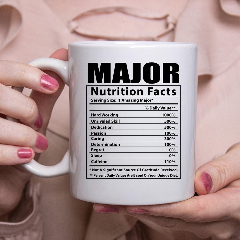 Funny Major Nutritional Facts White Coffee Mug Product Details.. This high quality 11oz. ceramic white mug has a premium hard coat that provides crisp and vibrant color reproduction sure to last for years. Perfect for all hot & cold beverages. The highest quality printing possible is used. It will never fade no matter how many times you wash it. Material: 100% Ceramic. Print both sides. Dishwasher and Microwave Safe. High Gloss + Premium White Finish. Printed in the U.S.A. Personalized & Custom. We support personalized and custom mug to add custom, when placing an order, you can add notes to the "order note" in shipping address section. Also you can contact us directly via message. Shipping Info. Ready to ship in 1 to 2 business days, All products are made-to-order and proudly printed in the United States. Shipped by USPS and DHL, You will receive your order in 5-7 days. Replace & Refund. All products are defective during shipping broken, chipped will be replaced free of charge. You are not satisfied with the product, we will refund 100% money to you. If any other issues arise, please do not hesitate to message, we would be more than happy to assist you.