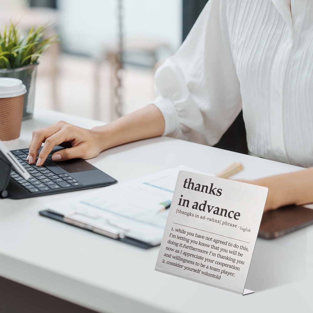Document MULTIPURPOSE - Funny desk decoration signs use humorous sentences to inspire smile and liven up the office atmosphere, bringing personality and fun to any workspace. Perfect for birthdays, events, home, and office decorationWHAT YOU GET - 1 x Funny office desk decor sign. And their sizes are: 10cm x 2.3cm x 10cm / 3.9inch x 0.9inch x 3.9inch(L*W*H); Material: Stainless steel; Color: Silver; Style: thanks in advanceRELIABLE MATERIAL - The funny desk decoration sign is made of stainless steel, which is strong and not easy to deform, waterproof and rust-proof, and durable. It is small in size and easy to place or move on the desk, and it does not take up too much space. The interesting title content has both decorative effects and brings fun.WIDELY USED - Funny office desk decor sign has a wide range of applications. It can be placed on the desk to decorate and bring fun to busy coworkers. It can be placed on bookshelves and wall cabinets to decorate the corners of the home. It can also be given to friends, colleague as interesting gifts.KINDLY NOTE - Please pay attention to the style and size of the title before purchasing Funny Desk Sign, Funny Nameplate, Silver (thanks in Advance) MULTIPURPOSE - Funny desk decoration signs use humorous sentences to inspire smile and liven up the office atmosphere, bringing personality and fun to any workspace. Perfect for birthdays, events, home, and office decoration WHAT YOU GET - 1 x Funny office desk decor sign. And their sizes are: 10cm x 2.3cm x 10cm / 3.9inch x 0.9inch x 3.9inch(L*W*H); Material: Stainless steel; Color: Silver; Style: thanks in advance RELIABLE MATERIAL - The funny desk decoration sign is made of stainless steel, which is strong and not easy to deform, waterproof and rust-proof, and durable. It is small in size and easy to place or move on the desk, and it does not take up too much space. The interesting title content has both decorative effects and brings fun. WIDELY USED - Funny office desk decor sign has a wide range of applications. It can be placed on the desk to decorate and bring fun to busy coworkers. It can be placed on bookshelves and wall cabinets to decorate the corners of the home. It can also be given to friends, colleague as interesting gifts. KINDLY NOTE - Please pay attention to the style and size of the title before purchasing Hot Item Payment 1.We accept eBay payment . 2.Payment must be received within 7 business days of auction closing. Shipping 1.We ship to your eBay or Paypal address. Please make sure your eBay and Paypal address is correct before you pay. 2.Items will be shipped within 1-3 business day when we received payment. 3.Delivery time depends on destination and other factors. Description Policy Funny Desk Sign, Funny Nameplate, Silver (thanks in Advance) MULTIPURPOSE - Funny desk decoration signs use humorous sentences to inspire smile and liven up the office atmosphere, bringing personality and fun to any workspace. Perfect for birthdays, events, home, and office decoration WHAT YOU GET - 1 x Funny office desk decor sign. And their sizes are: 10cm x 2.3cm x 10cm / 3.9inch x 0.9inch x 3.9inch(L*W*H); Material: Stainless steel; Color: Silver; Style: thanks in advance RELIABLE MATERIAL - The funny desk decoration sign is made of stainless steel, which is strong and not easy to deform, waterproof and rust-proof, and durable. It is small in size and easy to place or move on the desk, and it does not take up too much space. The interesting title content has both decorative effects and brings fun. WIDELY USED - Funny office desk decor sign has a wide range of applications. It can be placed on the desk to decorate and bring fun to busy coworkers. It can be placed on bookshelves and wall cabinets to decorate the corners of the home. It can also be given to friends, colleague as interesting gifts. KINDLY NOTE - Please pay attention to the style and size of the title before purchasing Hot Item Payment 1.We accept eBay payment . 2.Payment must be received within 7 business days of auction closing. Shipping 1.We ship to your eBay or Paypal address. Please make sure your eBay and Paypal address is correct before you pay. 2.Items will be shipped within 1-3 business day when we received payment. 3.Delivery time depends on destination and other factors.