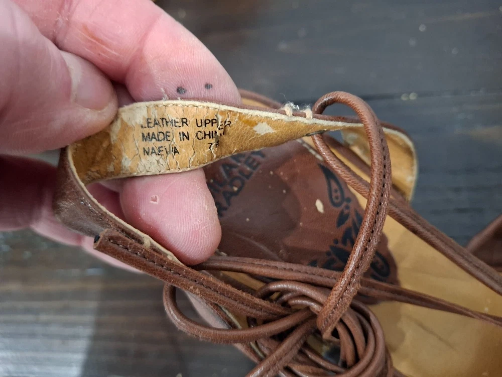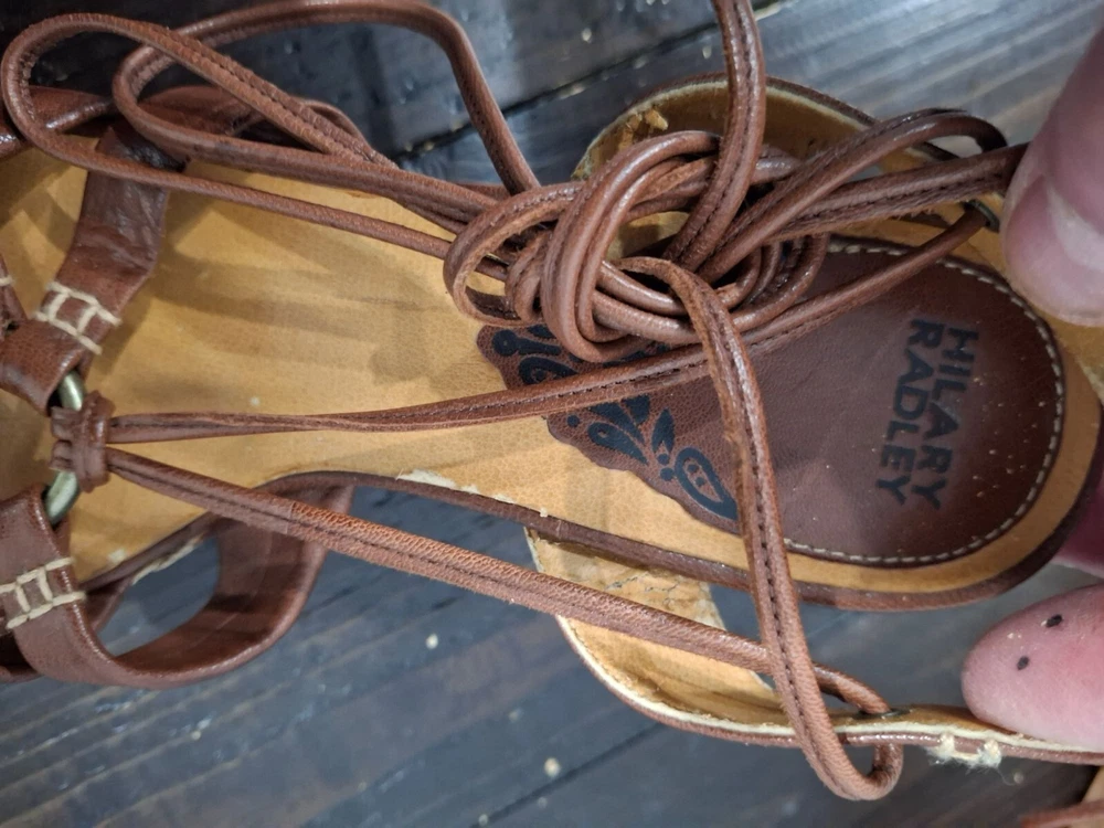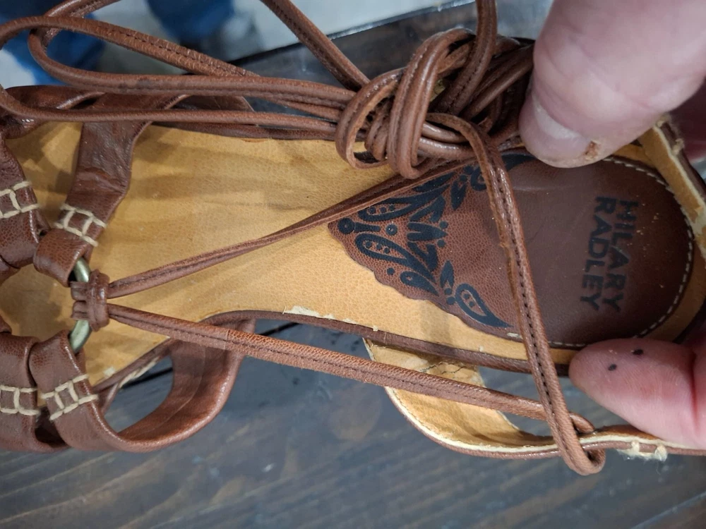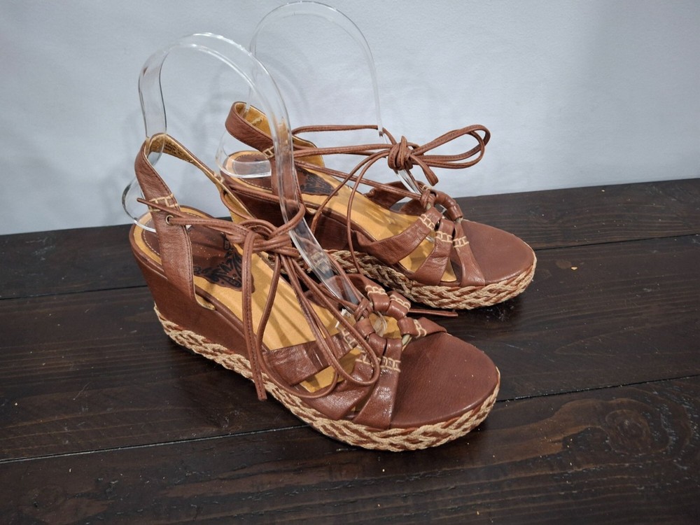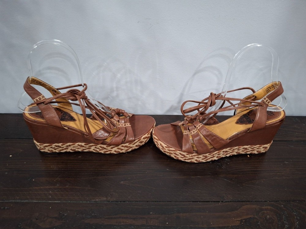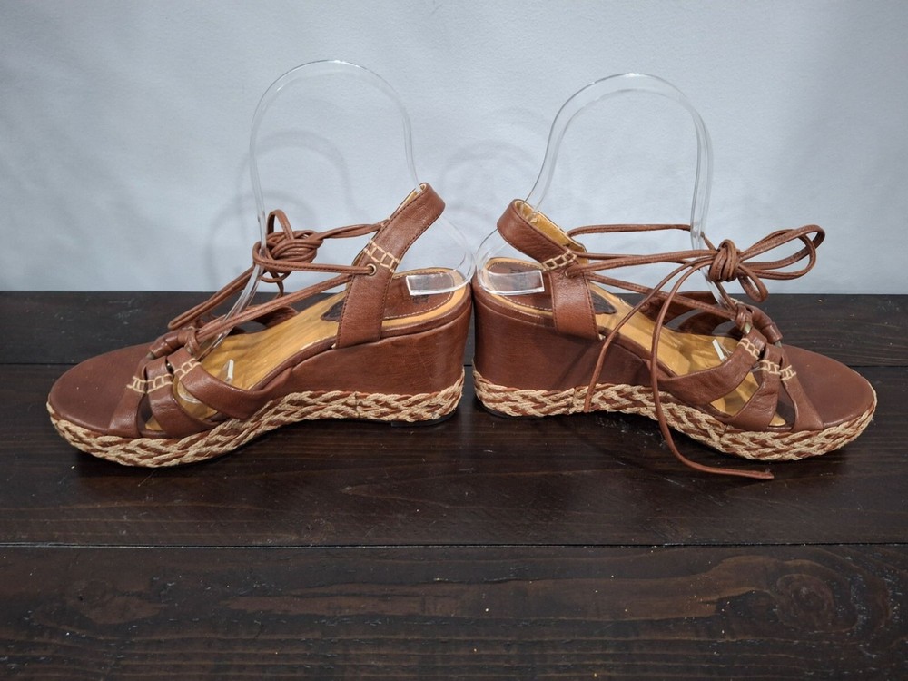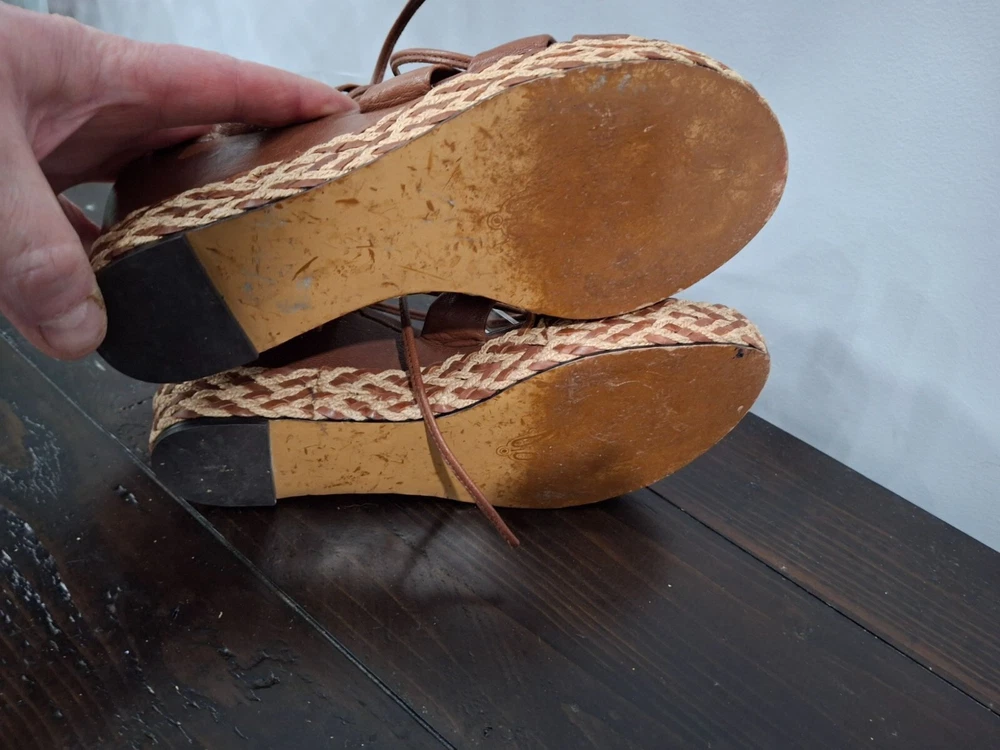 Pre-owned, in good condition. ***The inner lining of the sandals are cracking/peeling. Please note this in pictures. Size 7M These brown leather wedge sandals are highlighted by a basket weave wedge heel and has gladiator laces. 3.5" heel