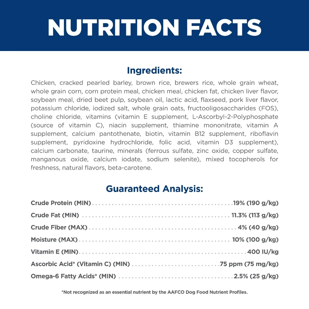Hill's® Science Diet® Small Bites Adult dry dog food is specially formulated to fuel the energy needs of dogs during the prime of their life. Delicious chicken flavor for those that prefer variety & made with high quality, easy-to-digest ingredients in a small bite size. Omega-6s & Vitamin E for beautiful skin & coat High-quality protein for lean muscles Natural fibers for healthy digestion Recommended for: Adult dogs 1 - 6 years of age. Not recommended for: Puppies and pregnant or nursing dogs. During pregnancy or nursing, dogs should be switched to Hill’s® Science Diet® Puppy, Hill’s® Science Diet® Puppy Small Bites or Hill’s® Science Diet® Puppy Small Paws™ dry dog food. Adult maintenance: Weight of Dog - lbs (kgs) Amount per Day - (cups/grams) 5 (2,3) 5/8 (60) 10 (4,5) 1 (100) 20 (9,1) 1 2/3 (165) 30 (14) 2 1/4 (225) 40 (18) 2 3/4 (270) 50 (23) 3 1/4 (320) 60 (27) 3 2/3 (365) 80 (36) 4 1/2 (445) 100 (45) 5 1/3 (530) 120 (54) 6 1/4 (620) Hill's® Science Diet® Adult Small Bites Chicken & Barley Recipe dog food is formulated to meet the nutritional levels established by the AAFCO Dog Food Nutrient Profiles for maintenance of adult dogs. HELPFUL TIPS Adjust feeding amounts as necessary to maintain optimal weight. If you are unsure, ask your veterinarian. New to this food? Mix increasing amounts of your pet's new food with decreasing amounts of the old food over a 7-day period. Keep fresh water available at all times! Your pets nutritional needs may change as they age. Ask your vet at every checkup. To prevent suffocation, keep the packaging out of the reach of pets and children. Product Details Brand Science Diet Species Dog Food Criteria Dry Food Life Stage Adult Breed Size Small Breeds Protein Chicken Special Diet Potato-Free, With Grain Breed Examples Example Small Breeds: French Bulldog, Pug, Boston Terrier, Dachshund, Miniature Schnauzer, Cavalier King Charles Spaniel, West Highland White Terrier