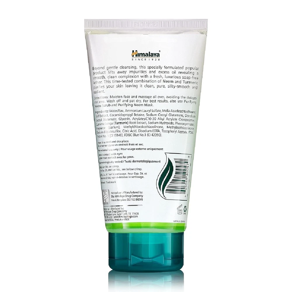 Safety Information: For external use ony. Store in a cool and dry place. Ingredients: Neem, Turmeric Directions: Moisten face, apply a small quantity of Purifying Neem Face Wash and gently work up a lather using a circular motion. Wash off and pat dry. Use twice daily.Suitable for all skin types. Best for pimple-prone skin. Product description Himalaya's Purifying Neem Face Wash is a soap-free, herbal formulation that cleans impurities and helps clear pimples. A natural blend of neem and turmeric brings together their antibacterial and antifungal properties to prevent the recurrence of acne over time. Key ingredients, neem is an excellent skin care ingredient known for its antibacterial properties. It improves general skin health and immunity, combating bacterial infections such as acne, boils and ulcers. Neem tackles bacteria from the root and prevents the recurrence of pimples and blemishes. Turmeric has been used as an antiseptic for centuries and it is regarded as one of nature's most powerful healers. The herb helps to even out your skin tone and color, making it an excellent ingredient in a face wash. From the manufacturer