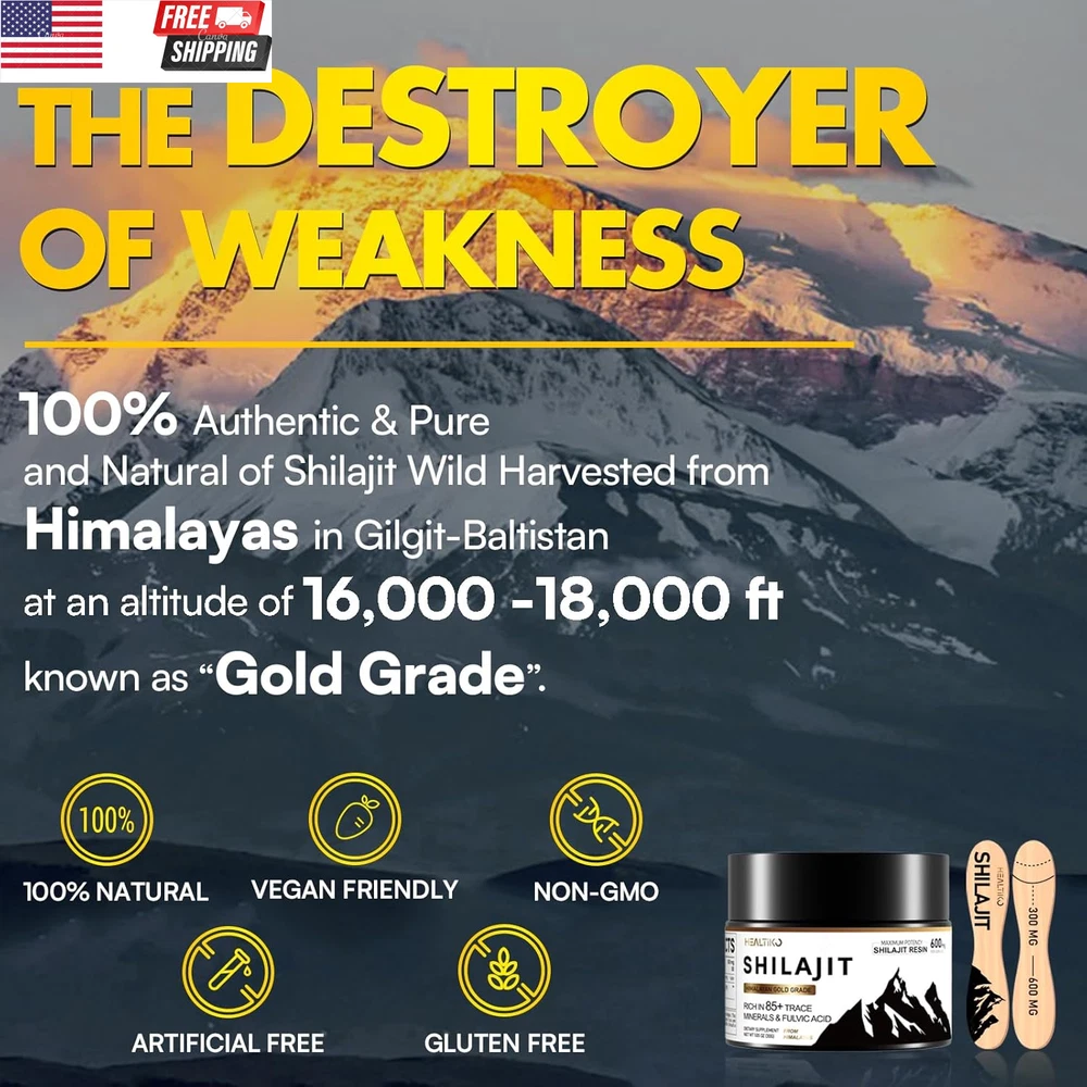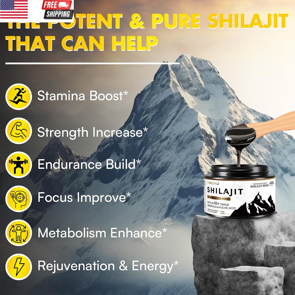 Shilajit Resin, Himalayan Shilajit Pure Himalayan Organic - 600Mg Potency Gold Grade, Shilajit for Men & Women with 85+ Trace Minerals & Fulvic Acid, for Stamina, Immunity, Strength, 100 Serving Enjoy The Power Of The Shilajit: Have you been feeling drained easily in daily life? Get ready to experience a new wave of Stamina and Stamina with Himalayan of shilajit resin. It's not just about pumping your body with minerals, it's about ensuring your body can fully utilize shilajit to your immunity, Stamina levels, productivity, and no more fatigue. Use the natural of shilajit resin you'll feel more comfortable, confident, and ready to tackle life's challenges Pure Himalayan Shilajit Resin: Shilajit is a gift from nature, a golden-grade treasure in the time-honored traditions of Ayurvedic wisdom. Including the essential 85+ trace minerals and high potency of fulvic & humic acid, our shilajit pure himalayan organic resin is rich in fulvic acid, a natural compound that enhances your body's ability to absorb vital nutrients. It's an ideal addition to your daily health routine for improved nutrient uptake Complete Wellness Enhancement: Combat fatigue and experience a surge of strength and overall well-being with Healtiko shilajit organic. Our golden-level shilajit, enriched with fulvic acid, surpasses conventional mineral supplements. And enhance mineral absorption to your immune, Focus, Strength, Endurance, and fortifying your immune system. Shilajit for men and shilajit for women an authentic addition to your daily health routine Easy To Use, Maximum Potency: Our authentic of shilajit resin includes measuring spoons to ensure each precise and perfect serving dose. It is also easily used, just simply dissolve pure resin form of shilajit in lukewarm water or your favorite beverages to experience the full benefits of organic shilajit for your overall wellness benefit. Packaged in a security-sealed dark bottle, which offers maximum protection away from light effects, and prolongs the potency of your shilajit resin You Can Count On: We take pride in offering you only the highest-quality natural organic shilajit resin available on the market. Our shilajit pure himalayan organic is presented in its pure, minimally processed form, free from heavy metals, fillers, additives, and suitable for vegans. Our goal is to make sure that you're happy and have the best experience possible with us Product Description Unit Count 2.1 Ounce Primary Supplement Type Purified Shilajit Resin Number of Items 2 Product Benefits Stamina Boost*、Strength Increase*、Endurance Build*、Focus Improve*、Rejuvenation* Flavor Unflavored Item Form Gel Package Dimensions 2.24 x 2.24 x 2.05 inches; 4.16 ounces Size 1.05 Ounce (Pack of 2) Shipping Fast shipping is very important for us. Our standard US shipping service is FREE. Your order will be shipped within 2-3 business days upon full payment received. Your order will be delivered within 2-3 business days after the handling time. We only ship to the confirmed PayPal address. We reserve the right to cancel any order for any reason at any time. We are not responsible for undeliverable addresses. Returns and payment We offer a 30 days return policy from checkout winning date. We allow only PayPal as payment method FeedBack Your feedback very important to us, after you get your package and you are satisfied with our service please leave us positive feedback If you have any problem with your order / any questions please before leave any type of feedback For any questions, using eBay contact system Please visit our eBay store to check out other items for sale! Thank you for shopping at our store.