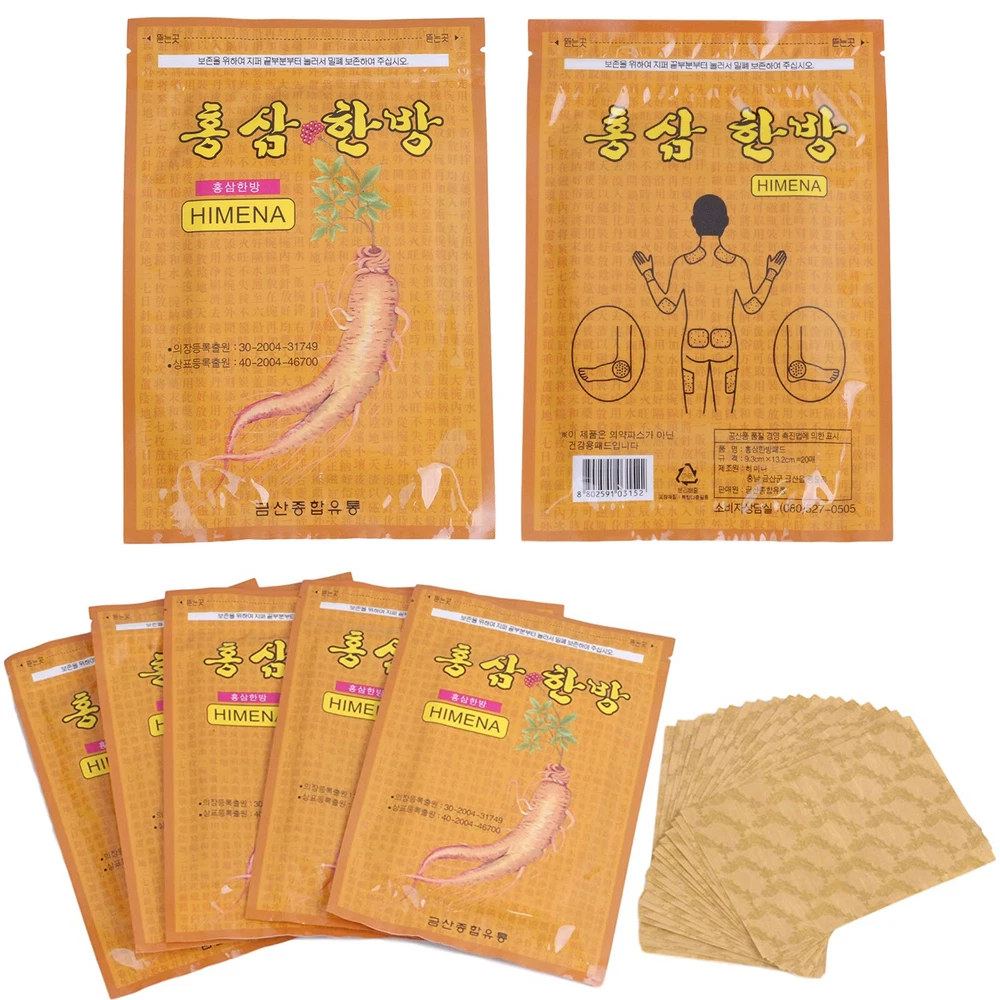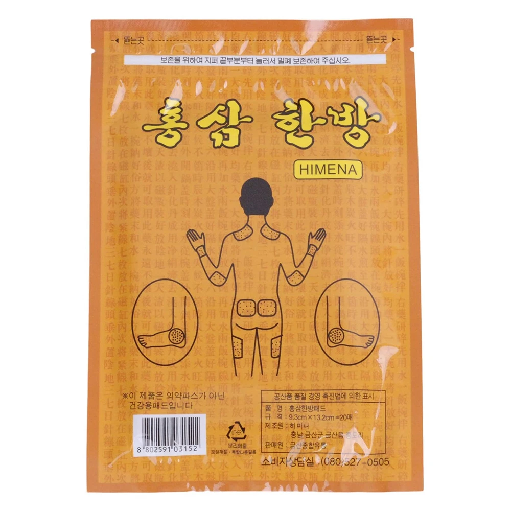 Himena Korean Red Ginseng Pad Pain Relief Health Patch 20Pack 400pcs Brand: Himena Model: Korean Red Ginseng Pad Capacity: 20 Pack / 400 Pcs (1Pack = 20 Pcs) Function: Korean Ginseng Health Pads Color: Skin Size Type: 3.5 x 5.2 Inch Made in Korea Application for Chairman Registration: 30-2004-31749 Trademark registration application: 40-2004-46700 Ziploc packaging for easy storage. Large capacity for long-lasting use. Thin and lightweight material is comfortable to wear. The square pads can be cut and stuck as many times as you want to cover your favorite areas. It's a great gift for gym goers, people who do a lot of physical labor, and parents.