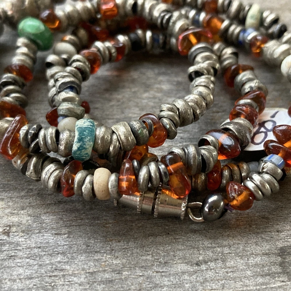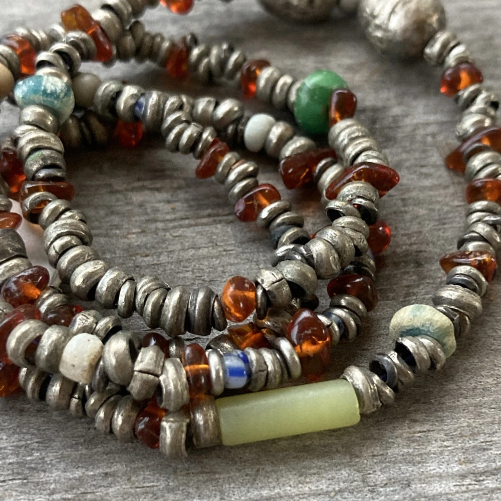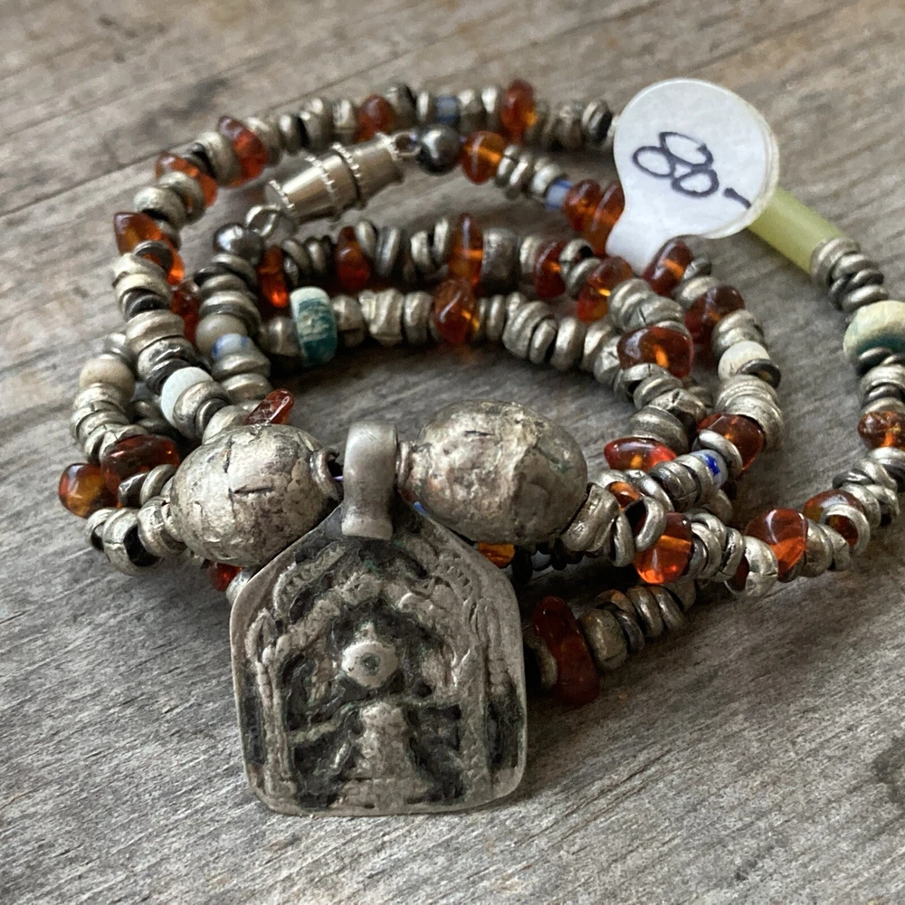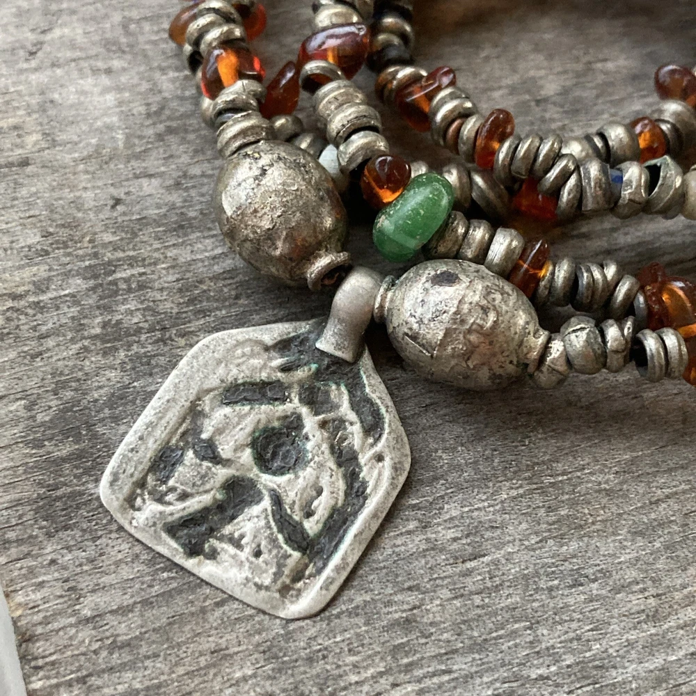IGNORE THE PRICE STICKER ON THE PENDANT IN THE PHOTOS, THAT WAS FROM A DIFFERENT TIME A DIFFERENT ERROR AND A DIFFERENT GALAXY. NOW I’M SELLING MY JEWELRY PARTS . Yes up for sale is this 20” inch necklace but the main selling point is the silver pendant of the Hindu Goddess … to be honest I don’t know which goddess this is. Dependent is pretty worn, but that’s the charm.. Also on the necklace if you care to know, are some African trade beads, including two nice lemon, beads, and some seed beads, and some brass Heishi from Nigeria. I know that the pendant came from India, probably the state of Rajasthan. It’s about 100 years old, although I don’t have providence on any of these beads. I did work in a bead store here in my hometown Oberlin for a decade, and I spent a lot of my paycheck on beads… Now I’m liquidating my collection .