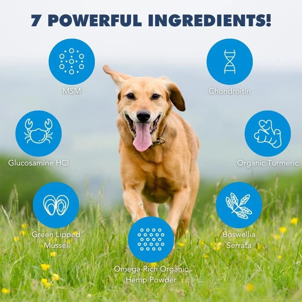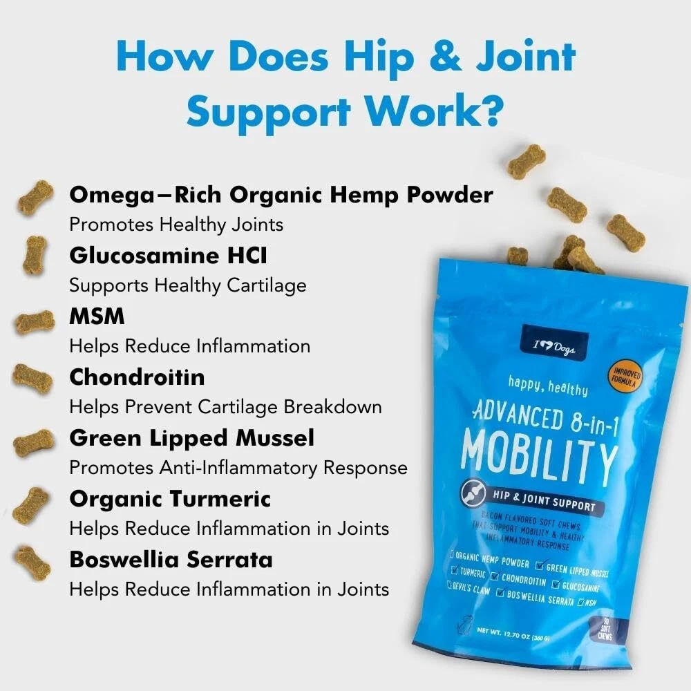 Joint pain in your dog is a heartbreaking thing to watch unfold. Get them moving freely again with the Advanced 8-in-1 Mobility Chew! It’s the perfect blend of 8 powerful, natural ingredients that work together to promote healthier joints, less pain and more activity. 8 POWERFUL INGREDIENTS: When it comes to joint supplements for dogs, Advanced 8-in-1 Mobility chews offer a unique blend of 8 powerful active ingredients including glucosamine HCl, chondroitin, MSM (methylsulfonylmethane), Devil's Claw, Green Lipped Mussel (Perna), Boswellia Serrata, Yucca, and omega-rich organic hemp powder to support your pup’s joint health and function. ANTIOXIDANT RICH: Organic turmeric with black pepper extract and vitamins C and E contained in our dog hip and joint supplement combat free-radicals from causing painful inflammation and reduce joint distress to keep your pup happy and healthy. TASTES LIKE A TREAT: Joint health for dogs has never been tastier! Your dog will absolutely love the natural bacon flavor of our chews. The savory smell and mouth-watering taste make these joint chews for dogs a healthy treat. ALLERGY-FRIENDLY: Our glucosamine for dogs supplement is all-natural and grain free with no added salt, sugar, artificial flavors or colors, so that even dogs with common food allergies and sensitivities can get the joint support they need to stay active. COLD PRESS EXTRUSION: Our manufacturing process helps the active ingredients in our hip and joint supplement for dogs maintain 98-99% viability. When it comes to joint care for dogs this process ensures your pup will get the most out of every chew.