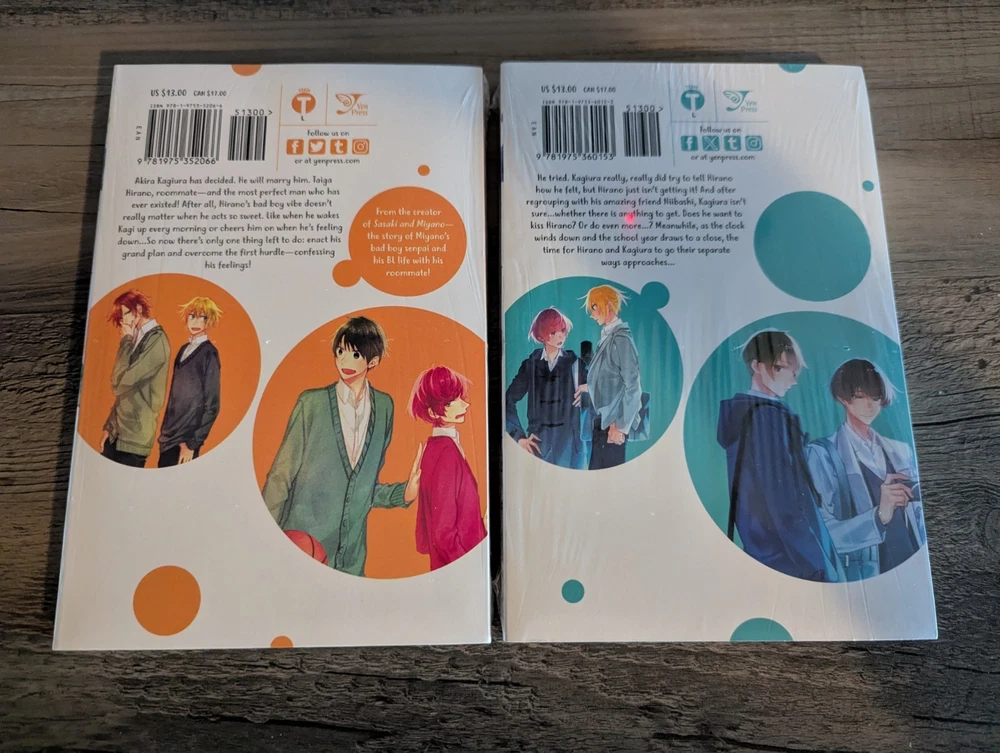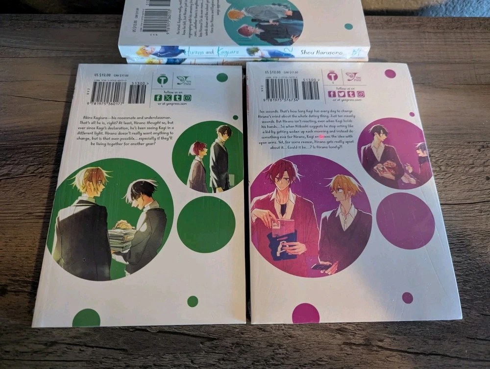 Series: Hirano and Kagiura Artist / Writer: Shou Harusono Genres: Boys Love, Yaoi, Slice of Life Demographic: Volume(s): 1, 2, 3, 4 Complete Series? No Language: English Publisher: Yen Press Rating: T+ MSRP: $13.00 per volume ($52.00 for set) Synopsis: Akira Kagiura has decided. He will marry him. Taiga Hirano, roommate—and the most perfect man who has ever existed! After all, Hirano’s bad boy vibe doesn’t really matter when he acts so sweet. Like when he wakes Kagi up every morning or cheers him on when he’s feeling down...So now there’s only one thing left to do: enact his grand plan and overcome the first hurdle—confessing his feelings! From the creator of Sasaki and Miyano— the story of Miyano’s bad boy senpai and his BL life with his roommate! ----------------------------------------------------------------------- About Us: Cozy Manga is an online store specializing in graphic novels, manga, light novels, artbooks, and relevant products. As avid fans and collectors ourselves, we bring a curated touch with hand-picked stock and mindful handling. Shipping and Handling: All of our listings come with one business day handling and are shipped directly from our location in Albuquerque, New Mexico, USA. To help protect your purchase during shipping we will always ship your order in either a box or between pieces of cardboard if mailed in a bubble mailer. Quality Controls: All of our books come shrink wrapped. Any volumes that are delivered to us with no factory wrap are personally shrink wrapped once unpacked. While we will strive to shrink wrap volumes as professionally as possible, there may be some imperfections with the shrink wrap. Some volumes may come with minor imperfections or nicks if delivered as such from the publisher. Volumes with bigger imperfections will be listed as such with details. Return Policy: All of our listings come with a 30 day free return policy, including remorse returns. In the event you no longer want an item and wish to return it, item(s) must be received in new condition with their shrink wrap still intact for a full refund. Any items returned opened, used, damaged, or otherwise not in new condition may be subject to a variable refund deduction depending on the state of the item(s) up to 50% per the Ebay Seller Protection Policy. When returning an item, make sure to pack it properly to help prevent damage in transit. We do not offer no-return refunds and refunds will not be issued until we have received your return and inspected it. Returns initiated due to item arriving damaged, doesn't match the listing description, or because it is the wrong item are subject to the Ebay Money Back Guarantee Policy . If we have more of the same item in stock, you may request a replacement or a same value exchange. Cancellation Policy: If you made an order but have changed your mind and want to cancel please use the eBay cancellation request form or send us a message. We will cancel your order and refund you your money no questions asked so long as we have not already shipped it out. If you request a cancellation but your package has already been dropped off with the shipping carrier you will need to initiate a return request once you have received your order. F.A.Q.: Would you be willing to take x amount for this listing? Our listing prices are non-negotiable. We do not accept offers or haggle on price. If you are interested in a listing but would like to buy it at a lower price, please watch the listing to receive future notifications on any sales or discounts that may be offered in the future. I'd like to buy certain volumes from this multi-volume set listing. Would you be willing to split them out? If you need or want only certain volumes out of our set listings, please send a message about what volumes you would like to purchase. Most of the time we are more than willing to accommodate your request!