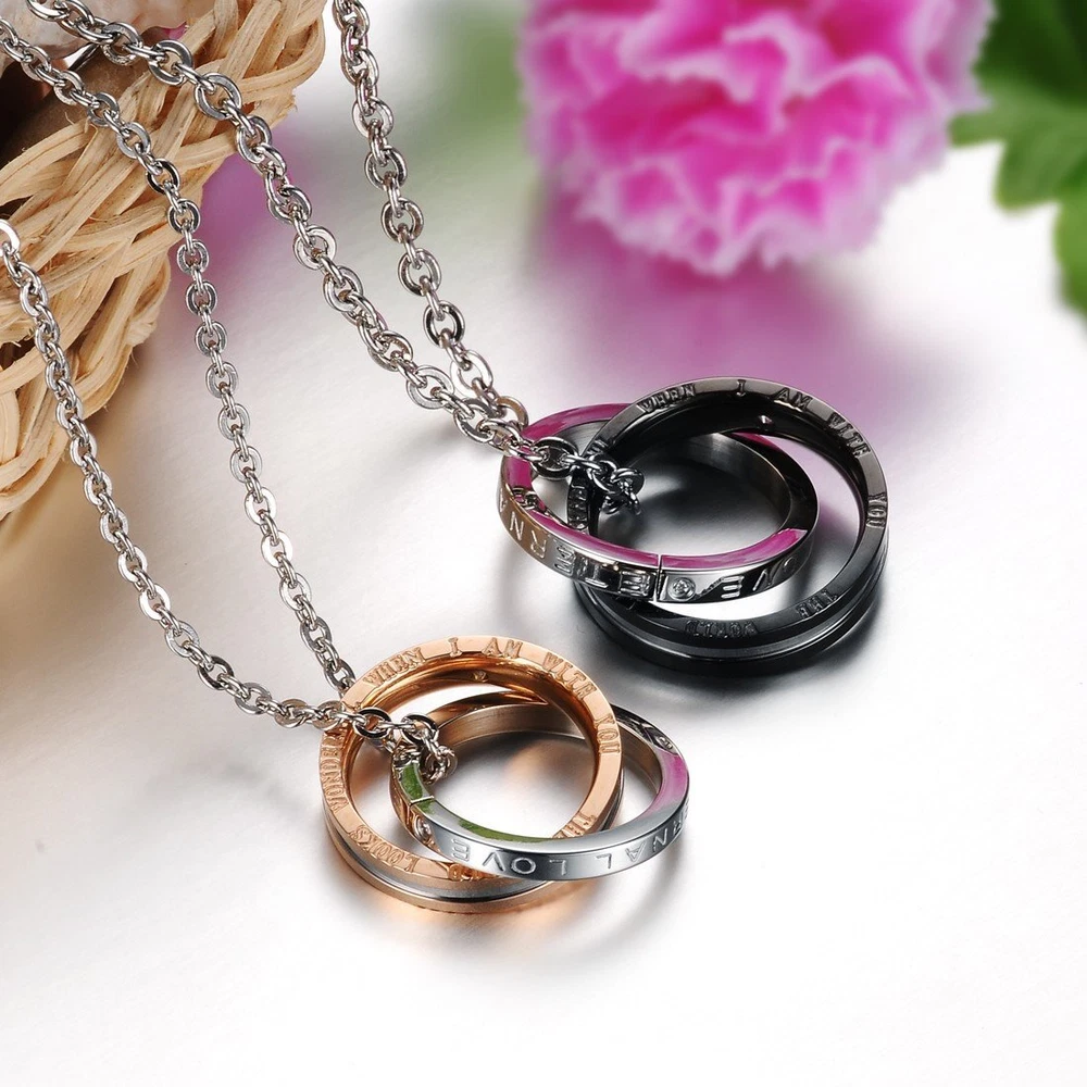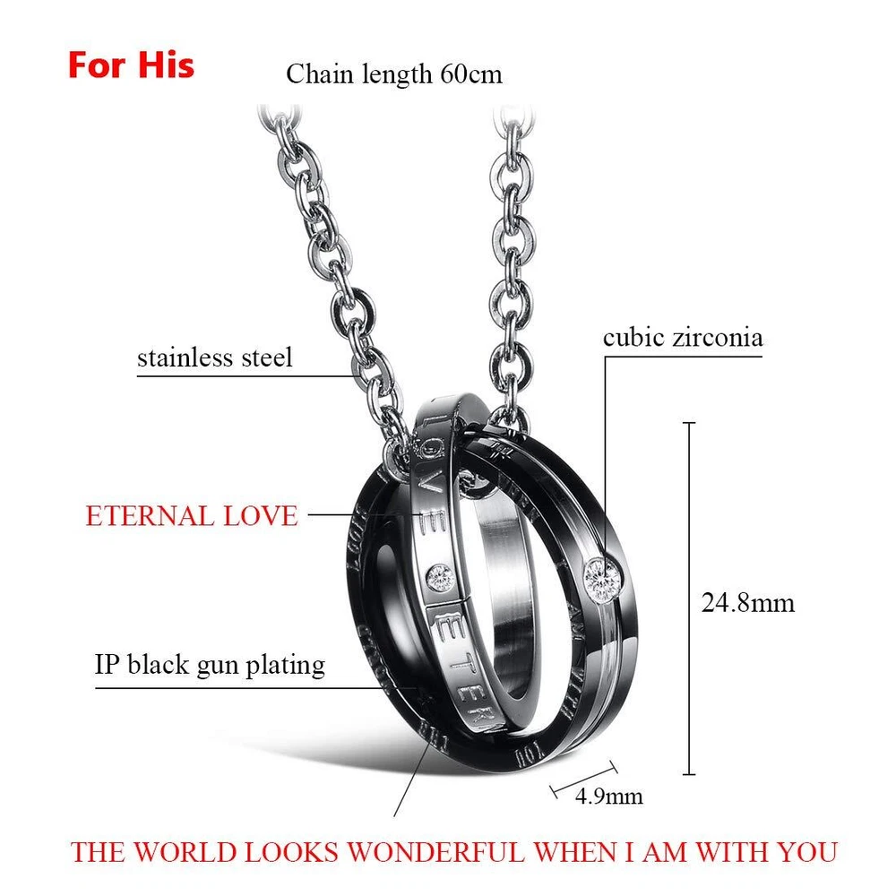 His & Hers Matching Sets Titanium Stainless Steel Couple Pendant Necklace for Men Women Interlocking Double Rings Cubic Zirconia CZ Charms Pendant Promise Friendship Jewelry, Eternal Love, 2Pcs ETERNAL LOVE – Both carved "ETERNAL LOVE", and engrave "THE WORLD LOOKS WONDERFUL WHEN I AM WITH YOU" on the side of the ring, it is a symbolic statement you'll love to admire and wear. Couples steel personalized necklace for men women, expressing love for a friend, lover, mom, father etc. It will be a unique personalized and meaningful gift to him or her. LOVE COUPLE NECKLACE – "ETERNAL LOVE", "THE WORLD LOOKS WONDERFUL WHEN I AM WITH YOU" are the meaningful words to show that how important he/she is in your heart. Maybe you are not good at speaking, try to use your actions to express your love, "SAY" you are my King/Queen, I willing to surrender to you. SIZE DETAIL – Female style ring size 0.91" x 0.15"(23mm x 3.9mm), rose gold plated, with 22"(55cm) link chain; Male style ring size 0.98" x 0.2"(24.8mm x 4.9mm), black gun plated, with 24"(60cm) link chain. Come with 2pcs, black for him, rose for her. MATERIALS – Made of superior 316l titanium stainless steel with small cubic zirconia stone, crafted of anti-tarnishing, scratch-resistant stainless steel, exquisite workmanship and polishing technique, the necklace features silver and black finish, which can last longer time, never turn your skin green as cheap jewelry, eye-catching and easy matching. PERFECT GIFT FOR COUPLES – Comes in velvet bag with MMTTAO brand logo. Circles ring pendant, engrave with lovely words "ETERNAL LOVE", vividly explain how much you love him or her, and how sepcially him/her means to you. This is a special couples gift. Perfect gift for valentine's day, wedding, engagement, birthday, anniversary and other occasions. Devoting a meaningful necklace that belongs to him or her so that your love will be witnessed by more people. Shipping We offer FREE shipping on all orders! We ship within Three business days of payment, usually sooner. We use a selection of shipping services such as UPS, FedEx, USPS etc. We only ship to the lower 48 states, no APO/FPO addresses or PO Boxes allowed. Local pickups and combined shipping options are not provided at this time. Return You can return a product for up to 30 days from the date you purchased it. Any product you return must be in the same condition you received it and in the original packaging. Please keep the receipt. Feedback Customer satisfaction is very important to us. If you have any problem with your order, please contact us and we will do our best to make you satisfied. Contact Us If you have any queries, please contact us via ebay. We usually respond within 24 hours on weekdays. Please visit our eBay store to check out other items for sale! Thank you for shopping at our store.