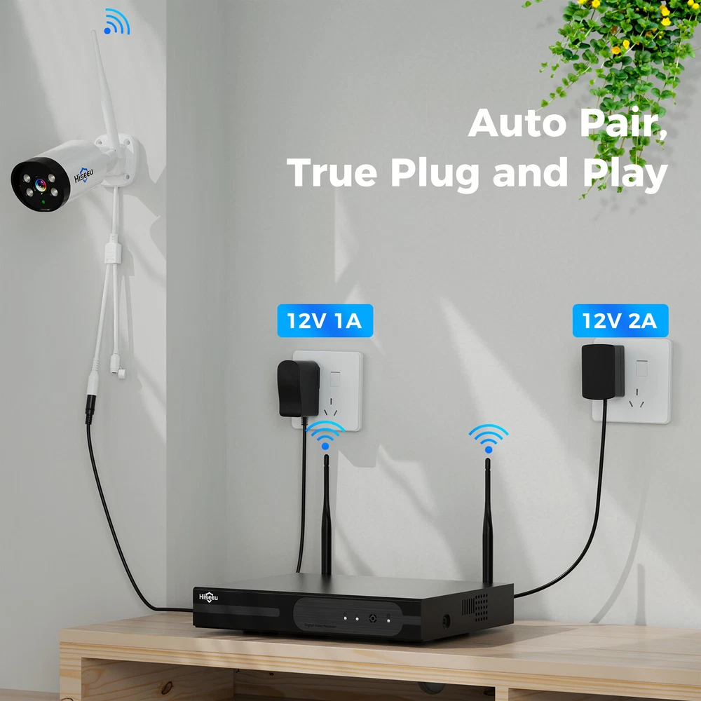 Please Noted: 1.this cctv system need 12V 1A power supply to charge it ! 2.this cctv system has been paired successfully ,if you want to add more than 4pcs cmaeras ,you need to use the cable to pair camera and NVR . 3.this camera is plastic casing. Please Noted: 1.this cctv system need 12V 1A power supply to charge it ! 2.this cctv system has been paired successfully ,if you want to add more than 4pcs cmaeras , you need to use the cable to pair camera and NVR . 3.this camera is plastic casing. 2K 3MP Super HD & 60 ft Night Vision 1/3'' CMOS sensor, digital WDR, ultra-clear 2K 3MP Super HD clarity regardless day or night. 4 powerful infrared&white LEDs deliver up to 60 ft/15 m night vision range. You may identify objects in any lighting condition. Get Notified of Person Detection Armed with advanced AI-based human detection, this cam alerts you to true threats only. Listen and Talk in Real Time-2 Way Audio Use two-way audio to respond to guests or warn off the unwanted from anywhere. Auto Pairing, Easy Connection Power on the cameras and NVR and all is done! No wiring and no complex configuration needed. Pls note ,this cctv system has been paired when pakcage in factory ,if you want to add more than 4pcs cameras to this cctv system ,you need to use the cable to pair camera with NVR. Expand up to 16pcs Cameras This NVR is 16 channel NVR ,it can be add up to 16pcs cameras .Hiseeu cameras protect your family every moment . 24/7 Continuous Recording This wireless system provides 24/7 non-stop recording even without network access. Plug the cameras & the NVR to the nearby outlets & all is done! For remote access & motion alerts, Internet is required. IP66 Waterproof Rating With IP66 weatherproof rating and plastic exterior, this camera is built tough enough to stand a variety of harsh weather conditions.