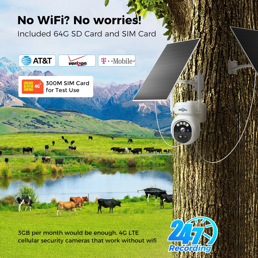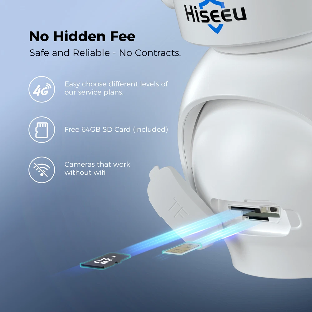 Item Description: 【 No WiFi Needed & Solar Powered 】 Experience unparalleled freedom with our Hiseeu 4G LTE Cellular Security Camera – a cutting-edge No WiFi Security Camera featuring 16W solar panels, 20000mAh rechargeable battery, and continuous 24/7 recording capabilities. 4G Cellular Security Camera can work anywhere nationwide with 4G LTE coverage in the US. Say goodbye to the limitations of traditional WiFi cameras and embrace the freedom of a truly off-grid solution. 【 64G SD & 300MB Free SIM Card Included 】 Our Cellular Security Camera comes with a 64GB SD card for local storage, ensuring worry-free data security. Additionally, a free 300MB 4G data SIM card is included for 30 days testing. Data plans can be easily subscribed to via the app once the Hiseeu's SIM card runs out, receive dedicated after-sales support for your Hiseeu subscription plan. If you prefer to use your own SIM card, you'll need to contact your card provider for recharge services. 【 24/7 Recording & PIR Detection & 2-Way Talk 】 Hiseeu No WiFi Security Camera with 24/7 recording capabilities, you can monitor live video feeds anytime, anywhere, ensuring peace of mind. Its advanced PIR detection technology accurately identifies moving objects and send your app a notification real time, guaranteeing no important events are missed. Enjoy the convenience of two-way talk functionality, allowing remote communication with family members or deterring potential intruders. 【 Easy Set Up & 360°View & 2K Color Night Vision 】 Hiseeu Cellular Security Camera with easy setup, you can start monitoring quickly and effortlessly. The PTZ Cameras 360°view ensures complete coverage of your surroundings, leaving no blind spots. Enjoy enhanced visibility even in low-light conditions with 2K color night vision, capturing vivid details for added security. Moreover, the IP64 weatherproof rating ensures durability and reliability in various weather conditions. 【 Data Security & 1-Year Warranty 】 Enjoy a comprehensive 1-year warranty by simply reaching out to us through your Amazon order. All accessories are eligible for free replacement within this period if any issues arise. Should your camera experience any problems within the first year, it will be replaced at no additional cost. Additionally, our dedicated after-sales support covers any concerns regarding your data subscription plan, Ensures this will quickly become your favorite no-risk purchase. Package Includes: Cellular Security Camera & 20W Solar Panel & Typc-C Cable & 64G SD Card