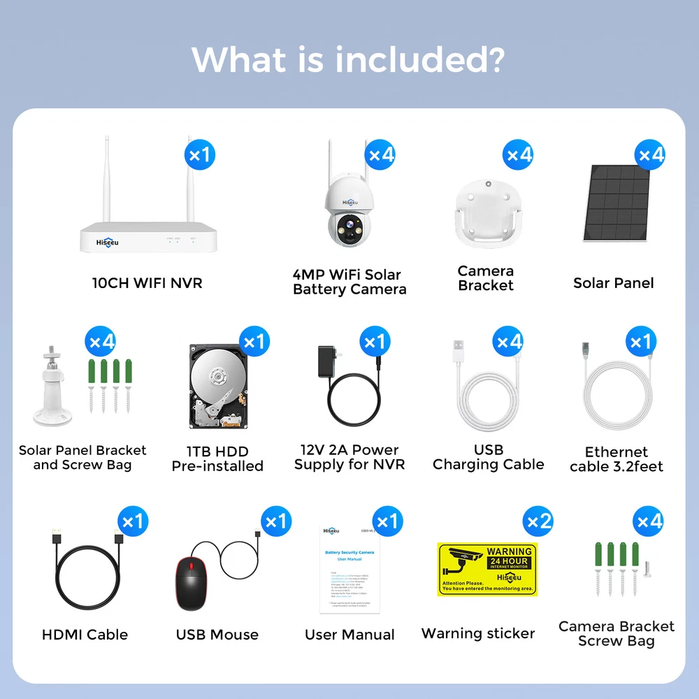 Year Manufactured: 2024 Hard Drive Capacity: 1TB Hard Drive Pre-installed Number of Cameras Included: 4 gtin13: Does not apply Type: Solar Powered Wireless Security Camera System Color: White Item Weight: 9.79 lbs Operating Range: 7m Manufacturer Warranty: 1 Year Brand: Hiseeu Items Included: Camera APP: EseeCloud Voltage: 5 V NVR Channels: 10 channel Lens Size: 2.8mm EAN: Does not apply Camera Connectivity: wireless/wifi Remote View Setup: Scan QR Code to Remote access in seconds Camera Type: Dome Power Source: Wall Plug-In Smart Home Protocol: Wi-Fi Storage Capacity: 1TB Maximum Resolution: 4MP Connectivity: Wireless UPC: Does not apply Model: WK-4TD504-AT Product Dimensions: 12 x 11 x 7 inches Note: Only work with 2.4G wifi MPN: Does not apply Features: 2 way audio, Motion/PIR Activated, battery solar powered, Night Vision, Rechargeable, Wi-Fi Operating Sound Rating: 90 dB Smart Home Compatibility: Hiseeu Color Mode: Color Day, B&W Night Surveillance Technology: IP/Network Country/Region of Manufacture: China