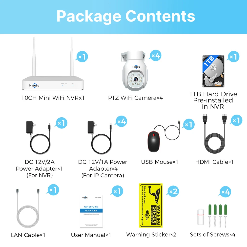 Smart Home Protocol: Infrared, Wi-Fi Lens: 3.6mm Storage Capacity: 1TB Power: 24W Voltage: 12 V Remote View: iPhone,iPad,Android PC:Windows System IE Items Included: Camera, NVR NVR Recording Mode 1: Continuous, Time Shcheduled, Motion Detection NVR Recording Mode 2: E-mail alert, Playback,Real Time Location: Outdoor & Indoor Maximum Resolution: 5MP Color: White Connectivity: Wireless MPN: Does not apply Brand: Hiseeu Number of Channels: 10 gtin13: Does not apply UPC: Does not apply Manufacturer Warranty: 1 year Features: Infrared/Night Vision, Built-In Memory Storage(Not include SD card) The NVR Feature: 5MP, HDMI, VGA, P2P,QR to Remote Access Operating Sound Rating: 90 dB Smart Home Compatibility: N/A Type: Complete System Power Source: Wall Plug-In Year Manufactured: 2024 Color Mode: Color Day, B&W Night Surveillance Technology: IP/Network Model: WK-4HD405-AT Number of Zones: 1 Number of Cameras Included: 4 Camera Feature: 5MP;IP66 Waterproof; Day & Night; Audio; Motion Detection Alarm