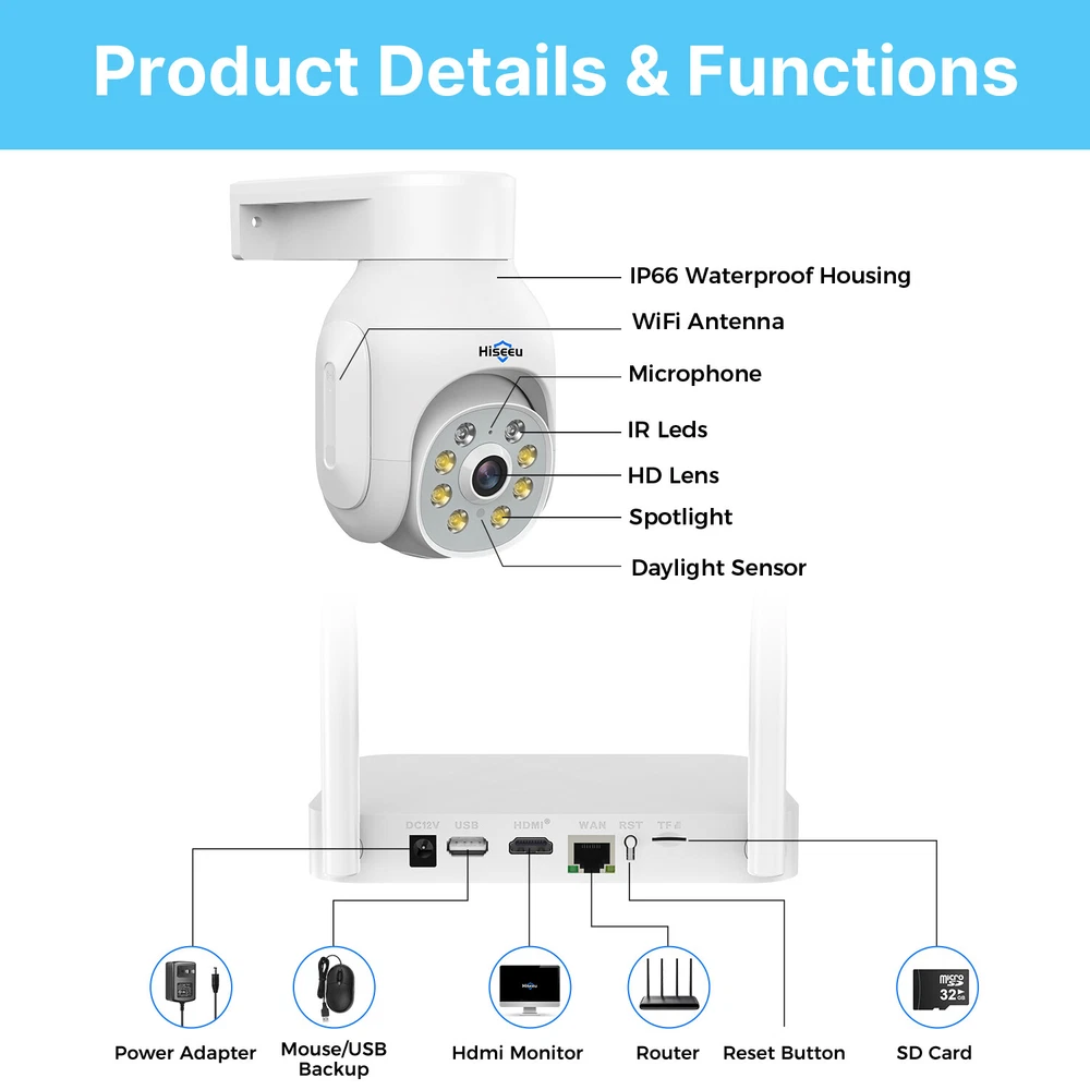 Note : This cctv system is wireless wifi cctv system ,the camera don't need network cable ,but it still need 12V/1A power supply cable connect to the socket. Note : This cctv system is wireless wifi cctv system ,the camera don't need network cable ,but it still need 12V/1A power supply cable connect to the socket. Plug and play, easy to install Cameras are paired to the NVR from factory setting, All you have to do is to get them powered and they would connect to each other autmatically. Very easy and convenient Expandable 10 Channel NVR With 10 channels NVR, It allows connect 10 cmaeras maximum, It means you can add more cameras at later. Motion Detection Alarm When anyone triggers, it will send you instant app push notifications , you will not miss any important moments . Real-time Two-way Audio With the built-in microphone and speaker of the wireless security camera, you can see, hear and talk to anyone who appears on the screen of your device. You can communicate with your elders, children, nanny and pets even if you are thousands of miles away. You can also verbally warn any uninvited people. IP66 Waterproof This rugged weatherproof camera is IP66-rated to ensure protection against all types of bad weather. Be it heavy wind, rain, or snow, we've engineered our cameras to withstand extreme temperatures. NVR&Camera Details