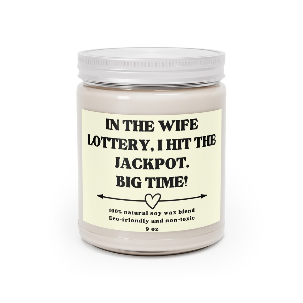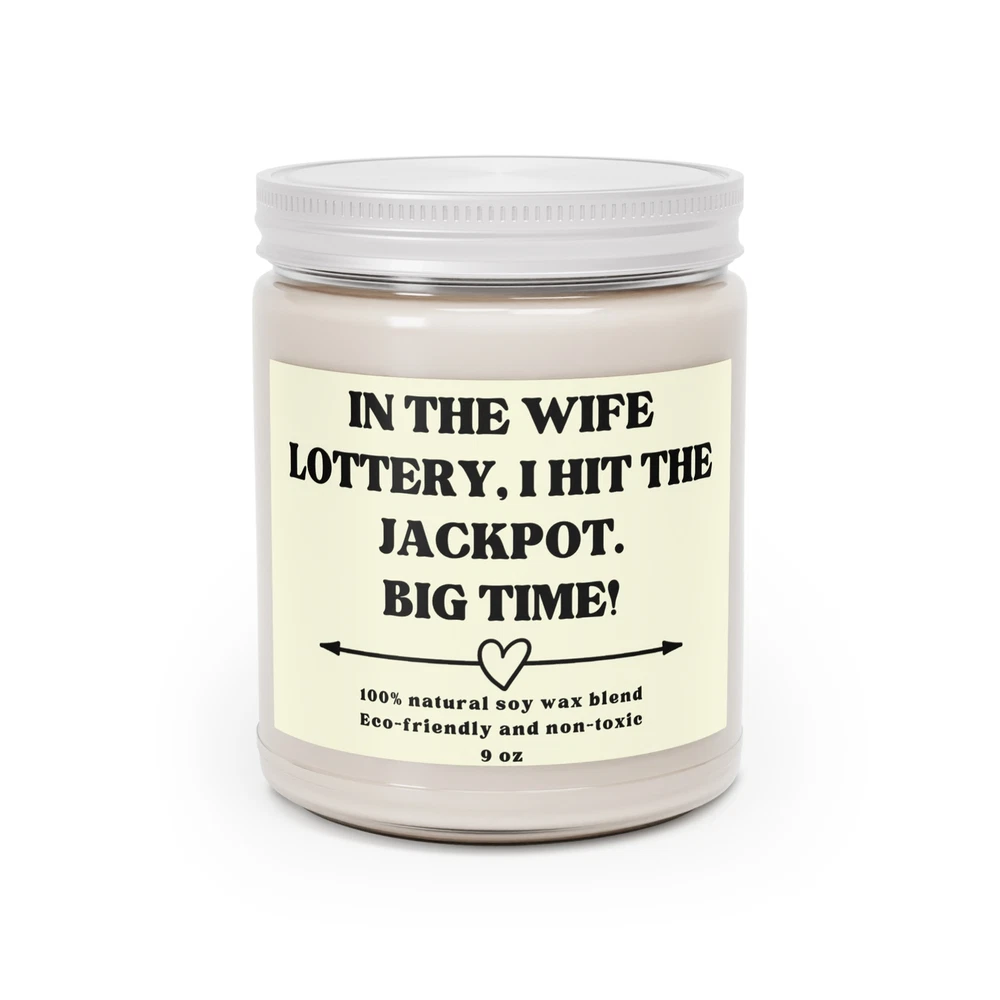 In the wife lottery, I hit the jackpot, Big time Valentine's Day 9oz Soy Candle *This scented candle comes in 3 different scents - Vanilla Bean, Comfort Spice, and Sea Breeze. *Candles are made on demand. 2-3 business days production time and 3-5 business days U.S. Shipping time. ***Before leaving any negative feedback, please reach out so we can make things right. 9oz Diameter, in 2.80 Height, in 3.50