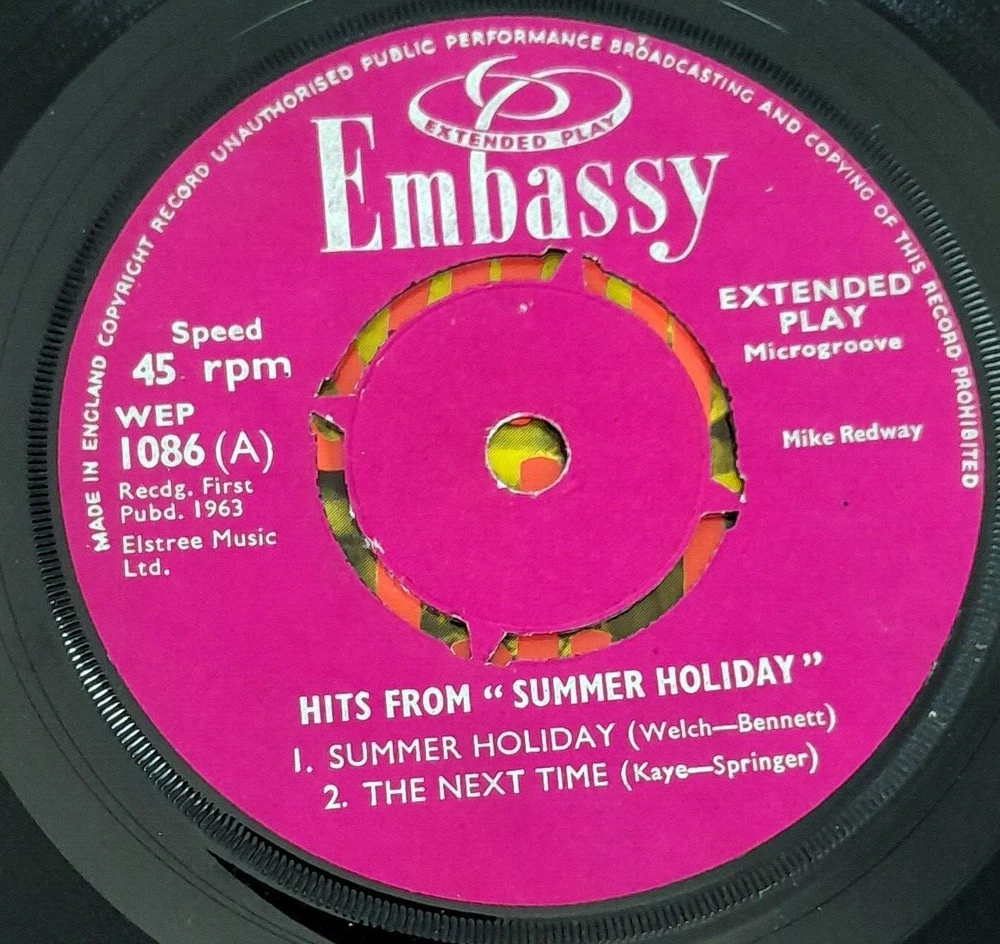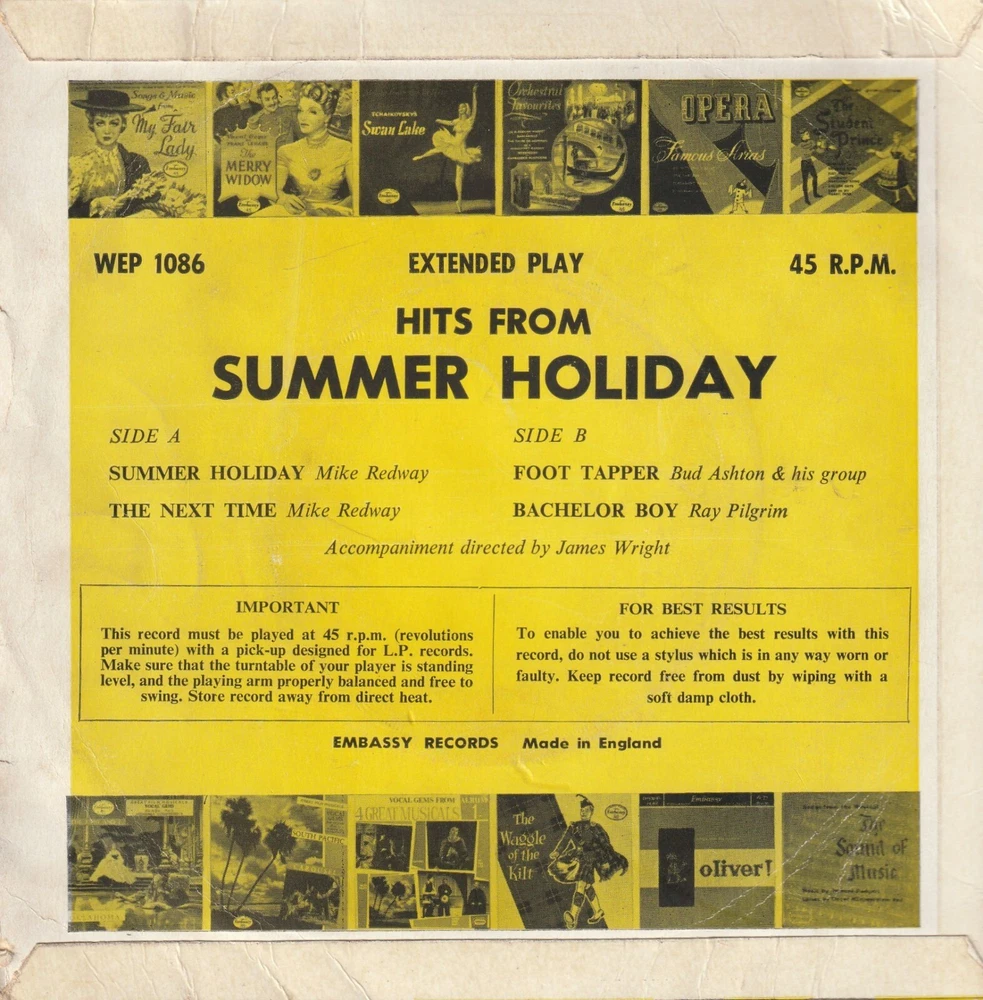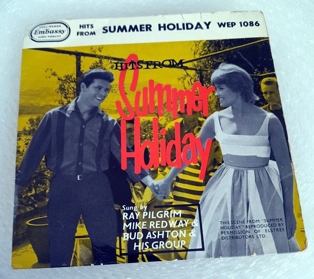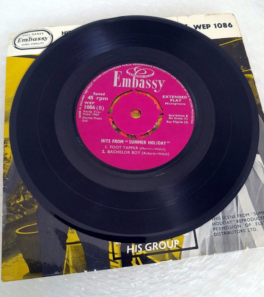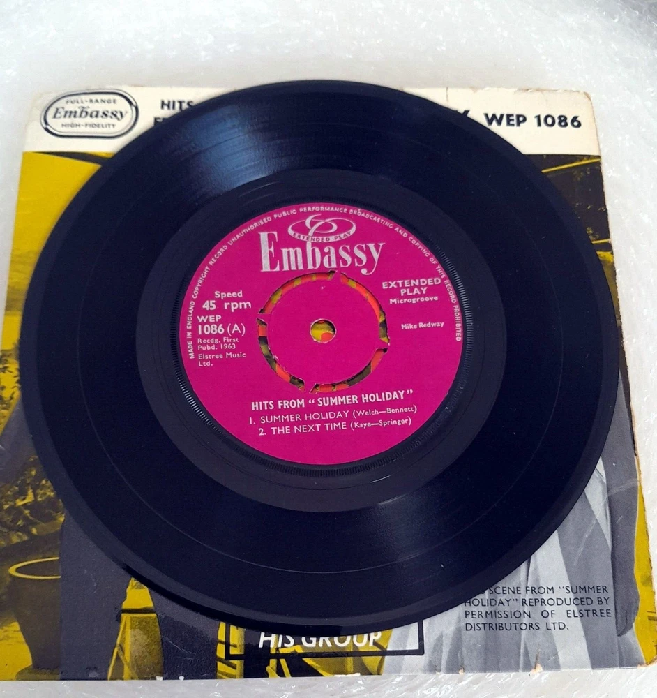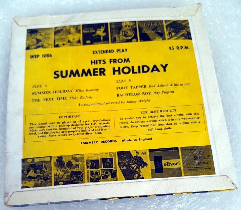 ~*VARIOUS*~ *~HITS FROM SUMMER HOLIDAY~* 7" VINYL E.P. CATT No. – WEP 1086 Matrix Number (Side A): WEP 1086 A Matrix Number (Side B): WEP 1086 B Label –EMBASSY Year – 1963 TRACK LISTING 1 Mike Redway– Summer Holiday 2 Mike Redway– The Next Time 3 Bud Ashton And His Group– Foot Tapper 4 Ray Pilgrim– Bachelor Boy ******************************** VINYL - VERY GOOD+(3) SLEEVE - VERY GOOD+(3) Grading Information Mint (1): The record itself looks to be in new condition with no surface marks and no deterioration in sound quality. The cover and any extra items such as the lyric sheet, booklet or poster are in perfect condition. Excellent (2): The record shows some signs of having been played, but there is no lessening in sound quality. The cover and packaging will not look new, but will have no defects of any kind. Very good+ (3): The record looks to have been played many times, but will display no major deterioration in sound quality, despite noticeable surface marks and light scratches. There will be some background crackle, but this will be minimal and only really noticeable on the track breaks. There is normal wear and tear on the cover or extra items, without any major defects. Very good- (4): As above but the background crackle will be a little more noticeable, there may be one or two pops or clicks, but not enough to ruin the listening experience in any way. There is quite heavy wear and tear on the cover or extra items, but still without any major defects. Good+ (5): The record looks like it shouldn't play but somehow it does. There will be extensive scratching and very noticeable background crackle, but it will play without jumping or sticking. The cover will have some defects, minor rips or tears, price label damage, loss of rigidity ect...but it will still keep it's shape and be an effective home for the record. Good- (6): As above, only the background crackle will now be accompanied by a number of pops and clicks. The cover will have some major defects, read description for further information. Reasonable (7): The record will play without jumping or sticking, but there will be heavy crackle that can no longer be said to be in the background may contain a number of pops and clicks. The cover will have many defects and probably not function very well as a cover any more, read description for further information.