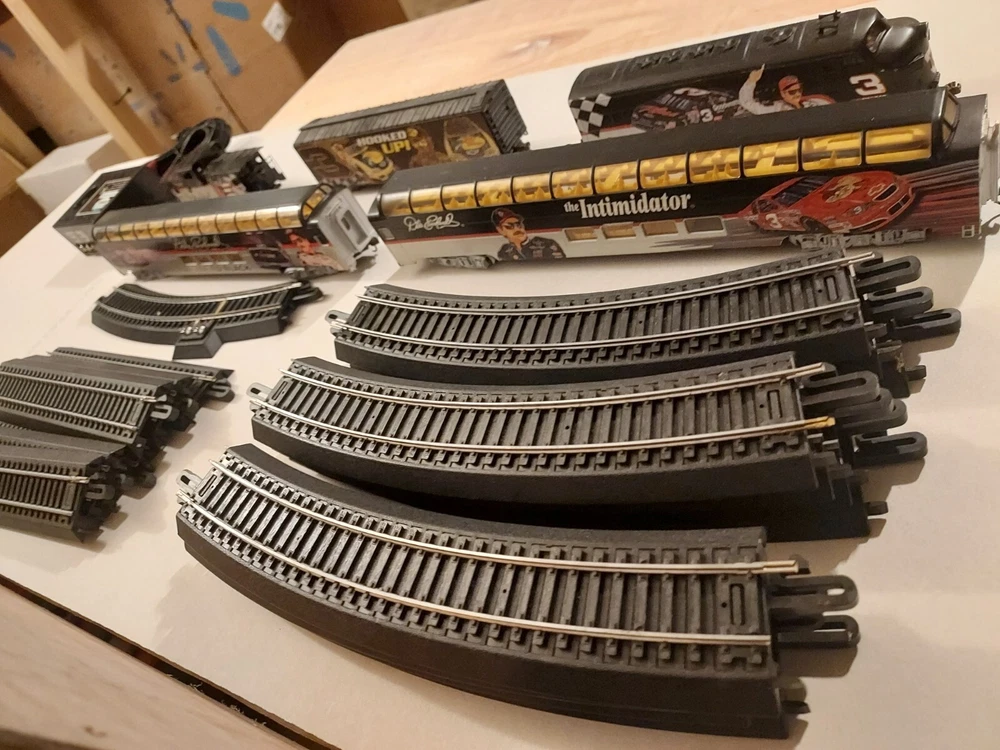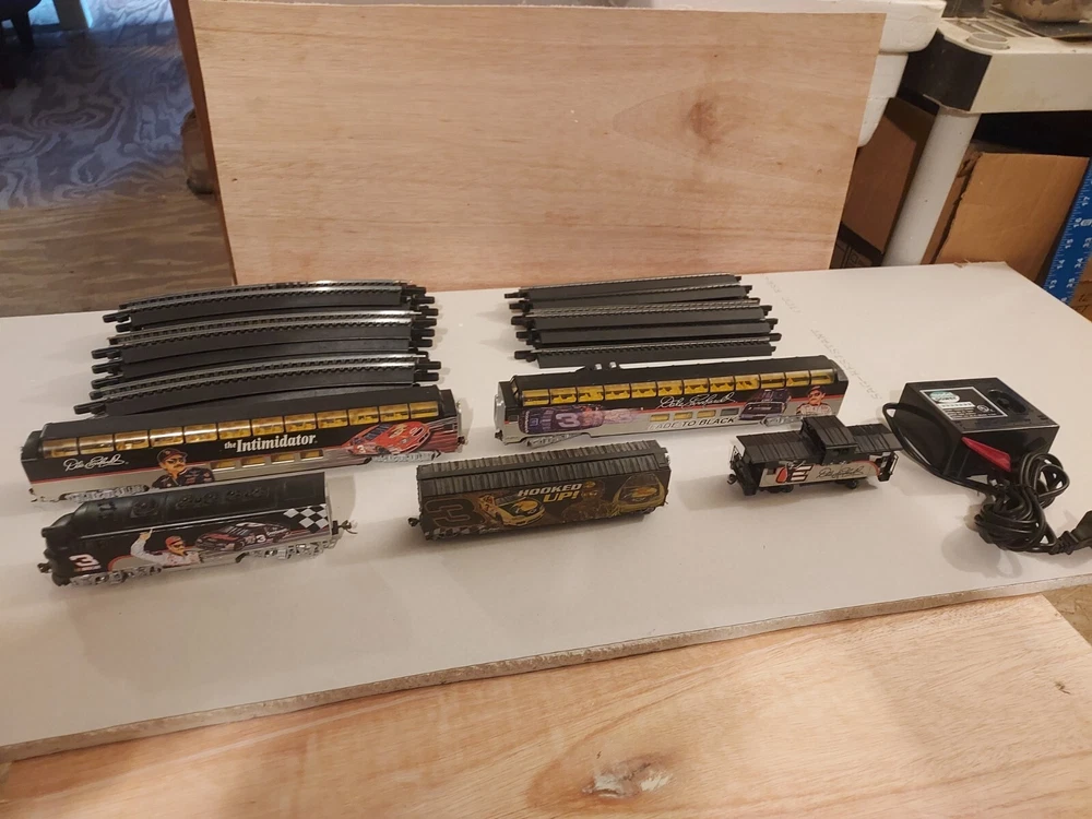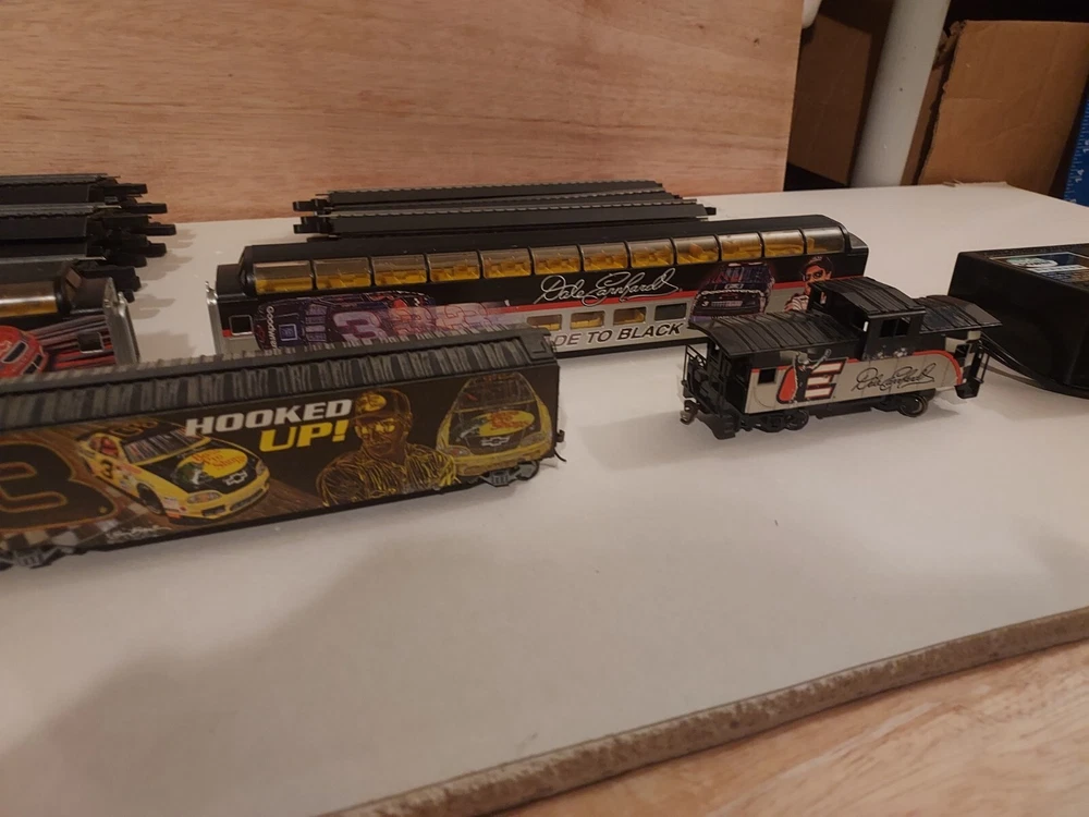 LIKE NEW, TRACK IS NEW, Come with Locomotive, 2 full dome cars - The Intimidator and Fade to Black, Hooked up box car, Caboose, and power pack. All in like new to new condition. Certificates of authenticity included! Everything you need to run this rare Dale earnhardt train set! Get ready to race with this Ho Scale Dale Earnhardt Train Set! Featuring the legendary driver and his iconic car, this set is a must-have for any NASCAR fan. The intricate details and high-quality construction make it a great addition to any collection. Whether you're a collector or a fan, this train set is sure to impress. With its realistic design and attention to detail, it's the perfect way to celebrate the legacy of Dale Earnhardt. So why wait? Add this Ho Scale Dale Earnhardt Train Set to your collection today!