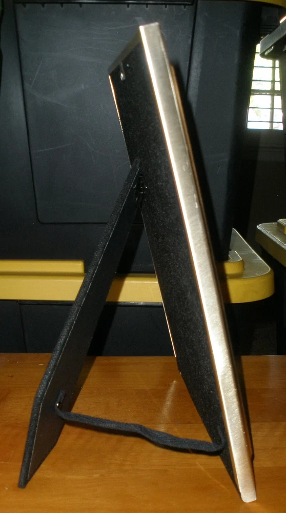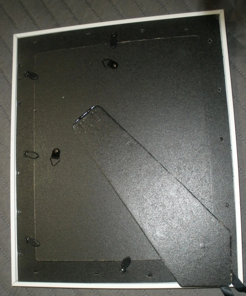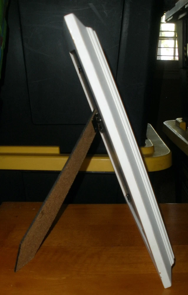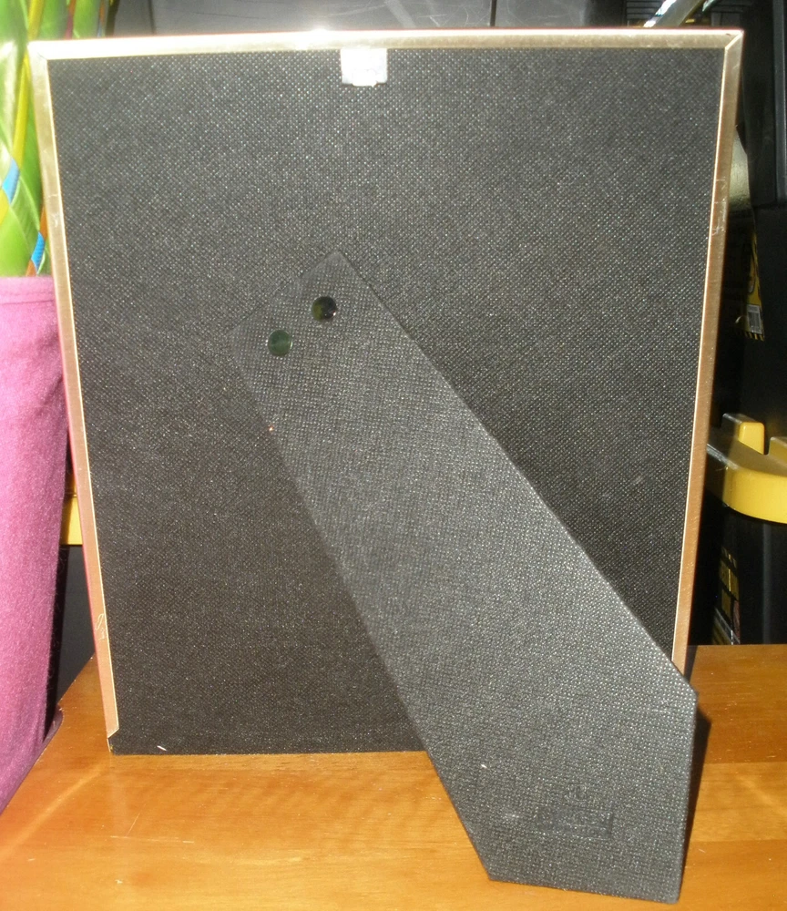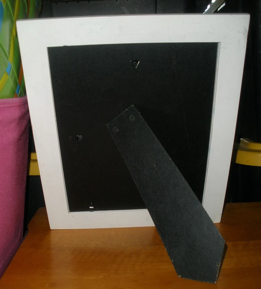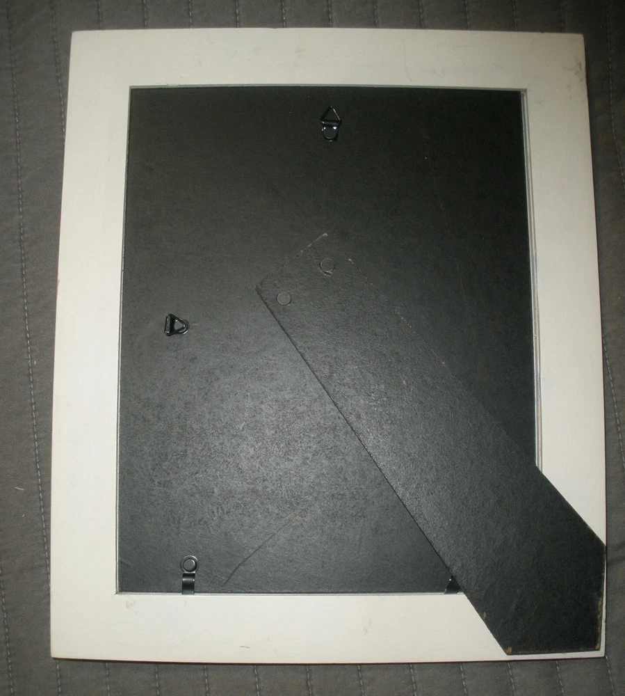 These frame is preowned, but in very good condition. It has a distressed white finish. IT is a heavy weight frame. The frame actually measures 13" by 10.5". The frame can be used as an easel or can be wall hanged.