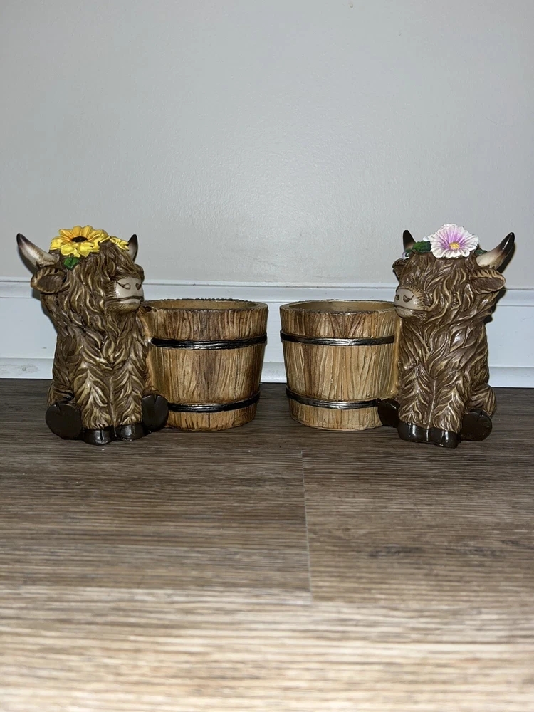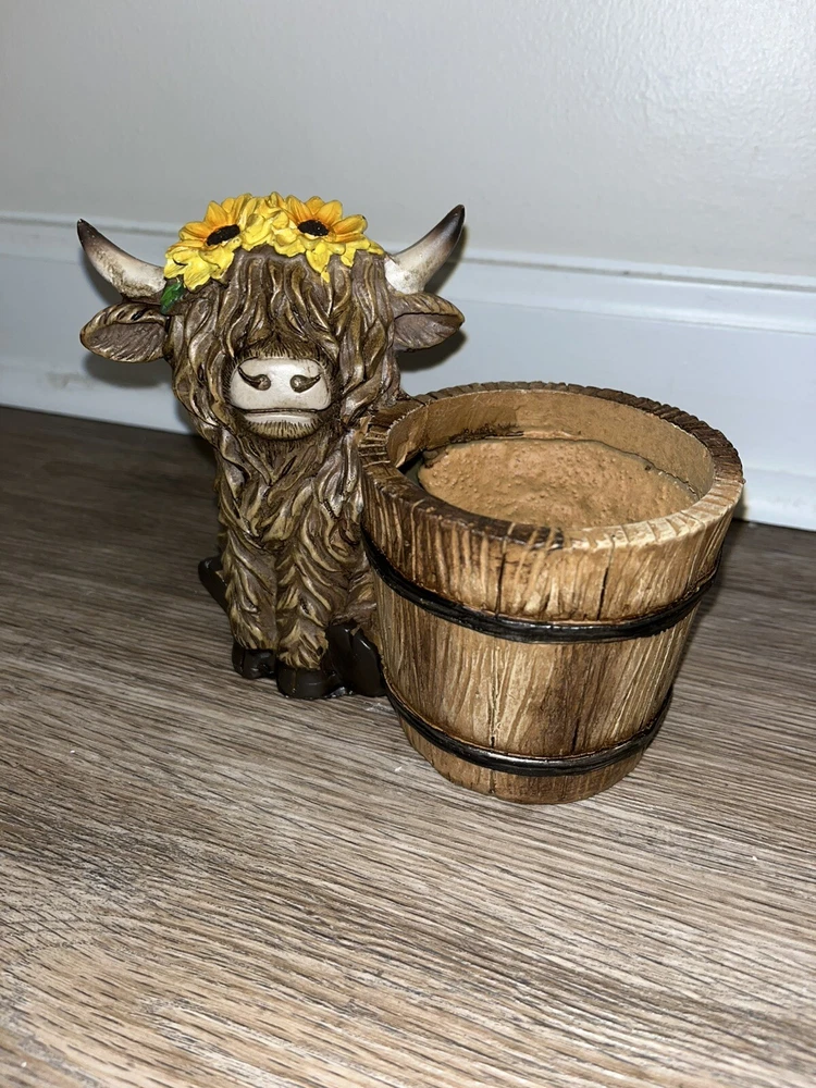 The product is a small Highland Cow figurine set from Hobby Lobby, made of brown resin. It features a farmhouse theme with a spring bucket planter design, ideal for home décor. The figurine is perfect for farmhouse, cottage core, or winter-themed decorations, and can be used during the Christmas or holiday season.