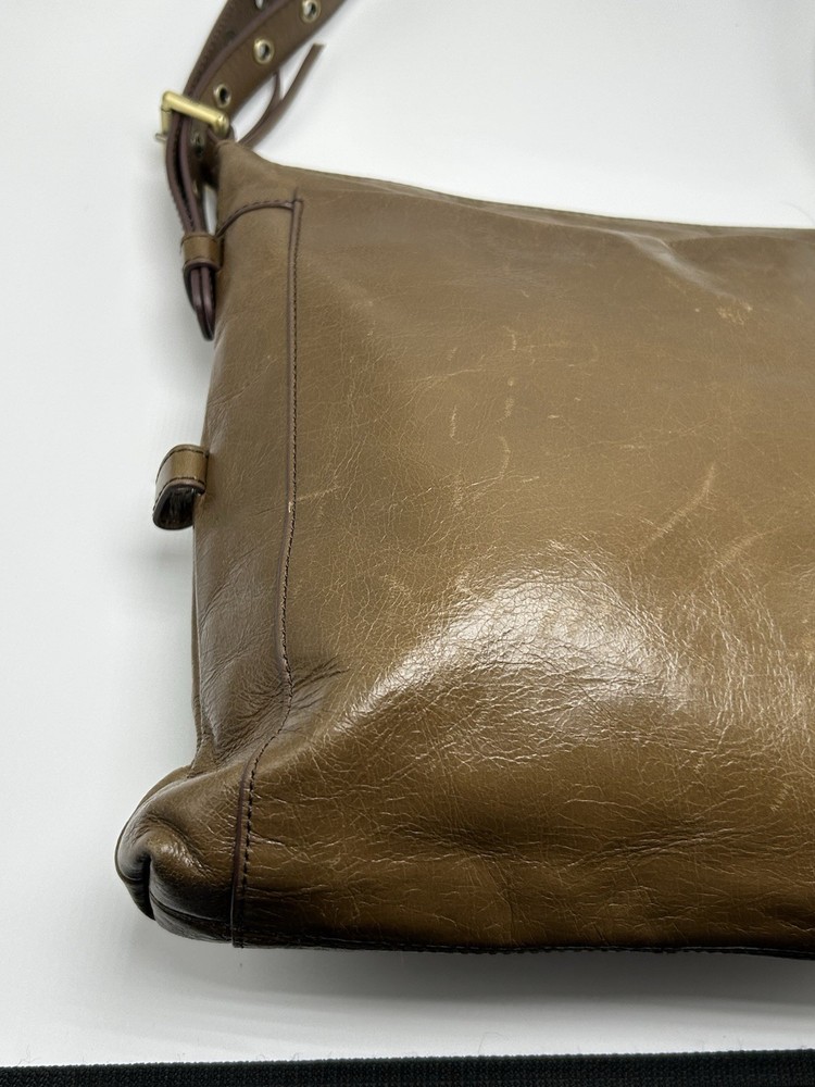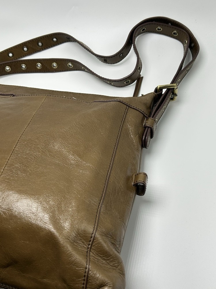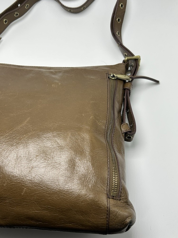 Hobo International Brown Leather Crossbody Shoulder Bag Pre-owned condition Adjustable strap Outer cell phone slot Outer large pocket with snap closure Outer zip pocket Inner zip pocket 3 inner open pockets 12” high 11” across 2” depth Nice!!