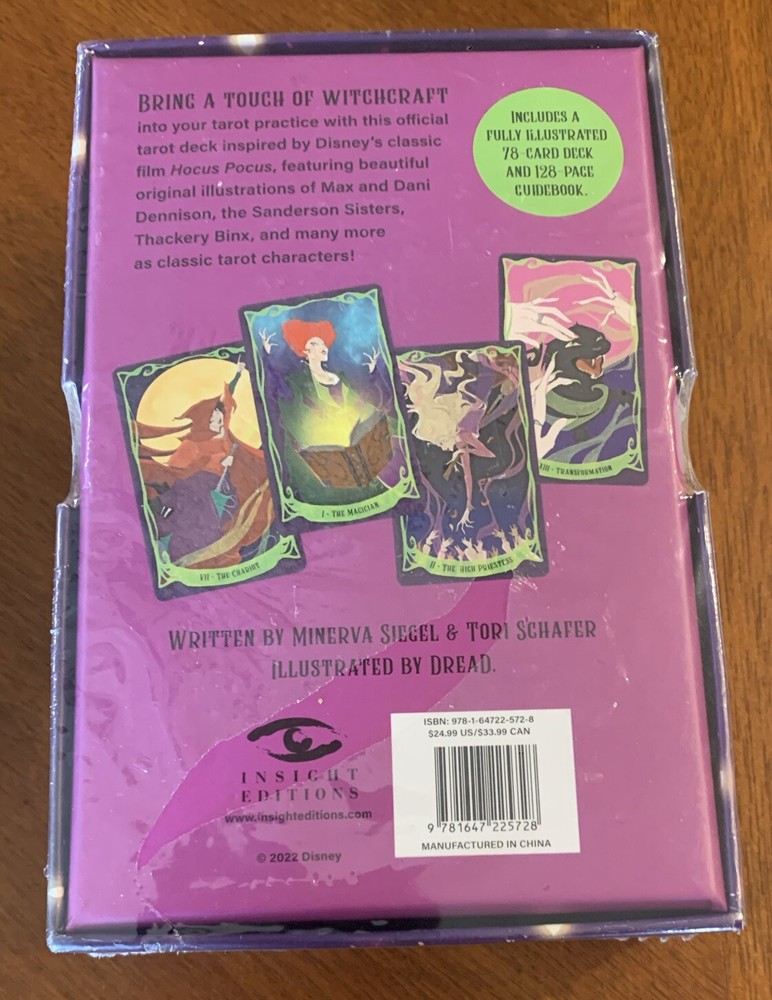 Item Width:3.9 inPublication Year:2022Synopsis:Bring a touch of witchcraft into your tarot practice with this illustrated deck inspired by Hocus Pocus ! Beloved since its release in 1993, Hocus Pocus has put a spell on fans with its humor and heart. Now, tarot enthusiasts and Hocus Pocus fans alike can celebrate their love for the film with this official tarot deck. - A MUST-HAVE FOR FANS: Featuring original illustrations of the Sanderson sisters and the wider world of Hocus Pocus , this deck matches characters from the film with tarot archetypes, making it a fresh interpretation of a traditional tarot deck. - COMPLETE TAROT EXPERIENCE: This deluxe set of 78 cards consists of both major and minor arcana, perfect for anyone beginning their tarot practice, as well as for experienced practitioners. - BEAUTIFULLY ILLUSTRATED: Each card features a full-color illustration of a character from Hocus Pocus , including the Sanderson Sisters, the Dennisons, Ernie, Billie Butcherson and more. - DETAILED GUIDEBOOK: Includes a 128-page guidebook with explanations of each card's meaning and simple spreads for easy readings. - GREAT GIFT: Packaged in a sturdy and decorative gift box, Hocus Pocus: The Official Tarot Deck and Guidebook will enchant fans of the film and tarot practitioners alike. - COMPLETE YOUR COLLECTION: Hocus Pocus: 13 Frights of Halloween also available!, Bring a touch of witchcraft into your tarot practice with this illustrated deck inspired by Hocus Pocus ! Beloved since its release in 1993, Hocus Pocus has put a spell on fans with its humor and heart. Now, tarot enthusiasts and Hocus Pocus fans alike can celebrate their love for the film with this official tarot deck. * A MUST-HAVE FOR FANS: Featuring original illustrations of the Sanderson sisters and the wider world of Hocus Pocus , this deck matches characters from the film with tarot archetypes, making it a fresh interpretation of a traditional tarot deck. * COMPLETE TAROT EXPERIENCE: This deluxe set of 78 cards consists of both major and minor arcana, perfect for anyone beginning their tarot practice, as well as for experienced practitioners. * BEAUTIFULLY ILLUSTRATED: Each card features a full-color illustration of a character from Hocus Pocus , including the Sanderson Sisters, the Dennisons, Ernie, Billie Butcherson and more. * DETAILED GUIDEBOOK: Includes a 128-page guidebook with explanations of each card's meaning and simple spreads for easy readings. * GREAT GIFT: Packaged in a sturdy and decorative gift box, Hocus Pocus: The Official Tarot Deck and Guidebook will enchant fans of the film and tarot practitioners alike. * COMPLETE YOUR COLLECTION: Hocus Pocus: 13 Frights of Halloween also available! See corrections and errata here.Book Series:Disney Ser.Item Height:1.9 inNumber of Pages:128 PagesPublisher:Insight Editionsbrand:Insight EditionsGenre:Body, Mind & Spirit, FictionFormat:Cards,Flash Cards / Cards,Flash CardsAuthor:Minerva Siegel, Tori SchaferTopic:Healing / General, Mysticism, Witchcraft (See Also Religion / Wicca), GeneralLanguage:Englishgtin13:9781647225728Intended Audience:TradeISBN-10:1647225728Book Title:Hocus Pocus: the Official Tarot Deck and Guidebook : (Tarot Cards, Tarot for Beginners, Hocus Pocus Merchandise, Hocus Pocus Book)ISBN-13:9781647225728Item Length:5.8 inItem Weight:8 Oz